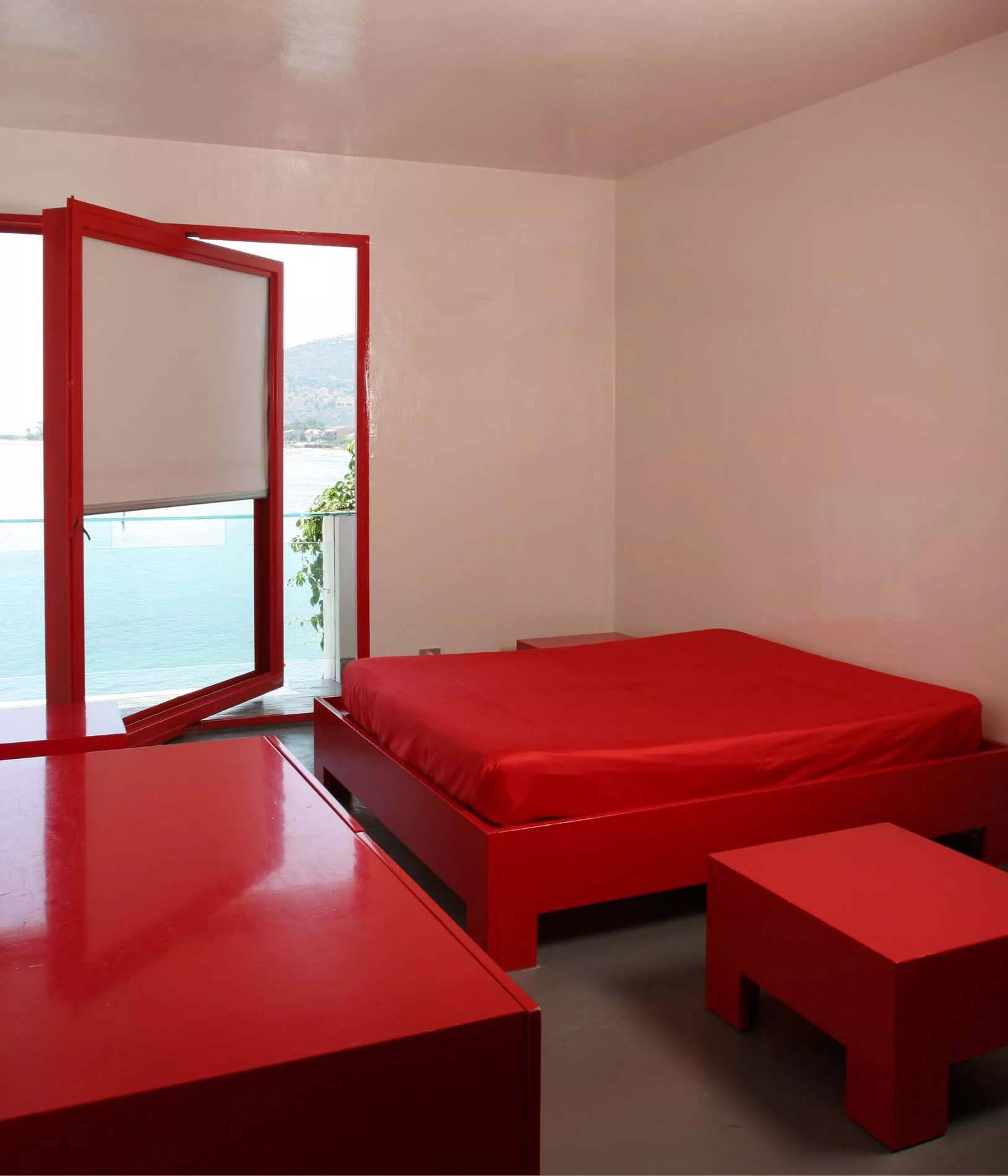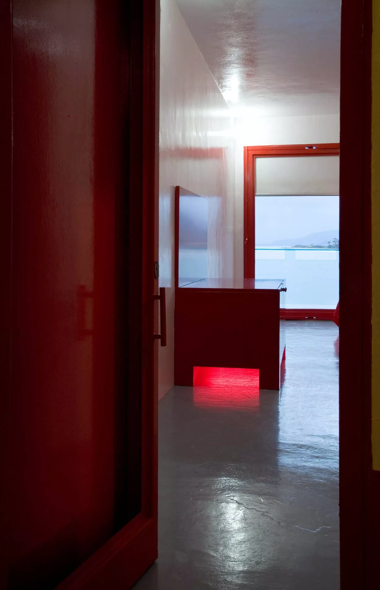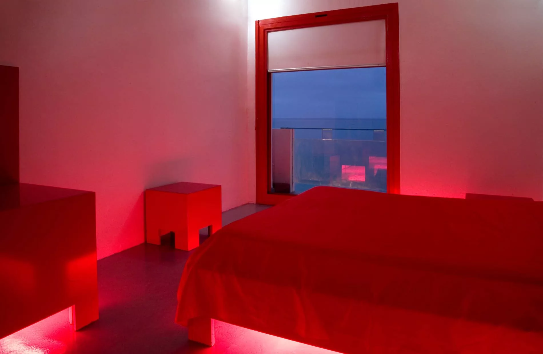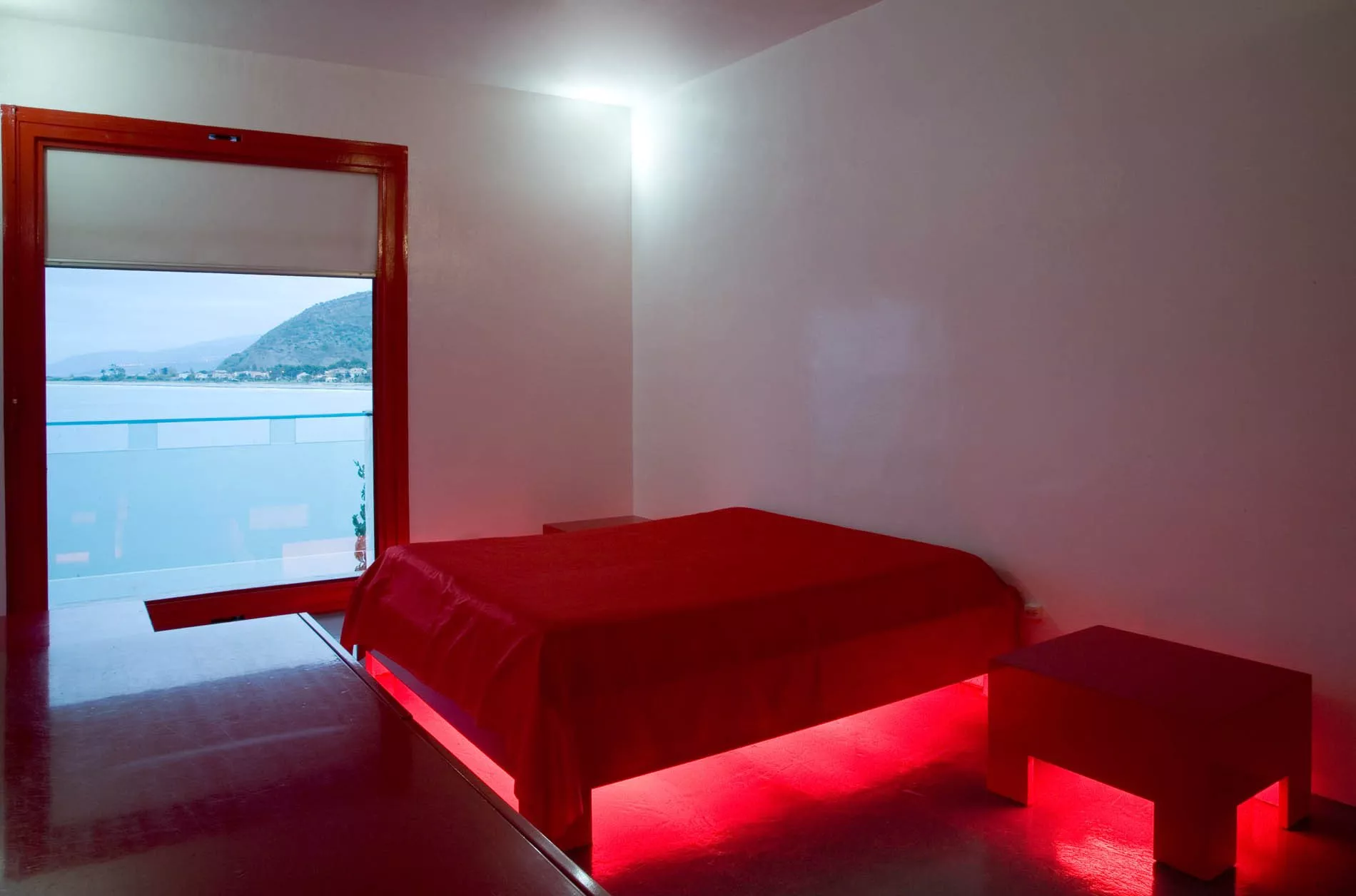 L’energia pervade ogni elemento della stanza e l’ospite diventa anch’egli elemento energetico. La grande finestra quadrata basculante, bianca e incorniciata di rosso, nitida come una scultura minimalista, diventa quindi l’unico elemento di passaggio tra i due stati della materia e nello stesso tempo si propone come unica via di fuga verso il mare e l’orizzonte infinito del paesaggio esterno.