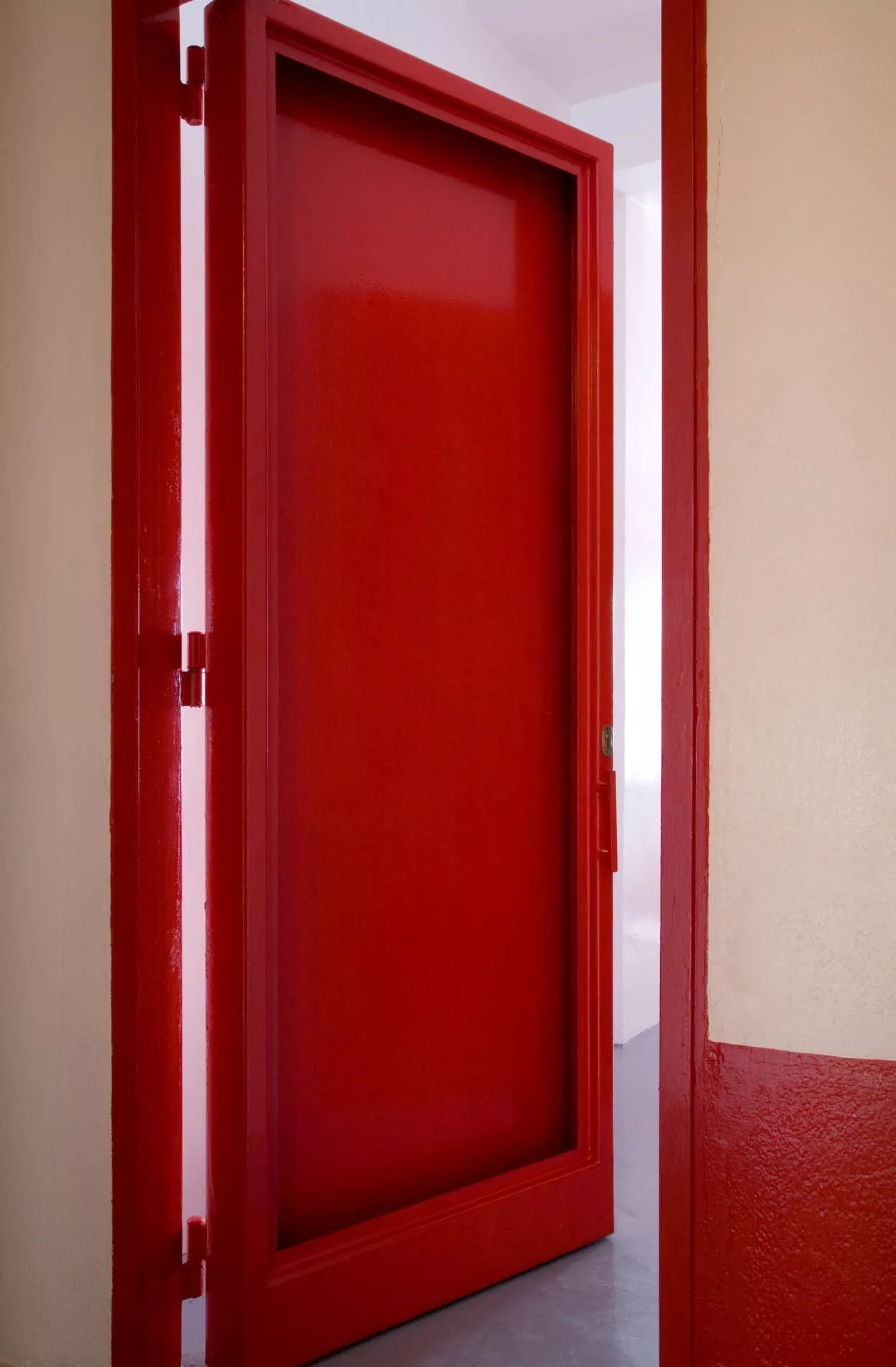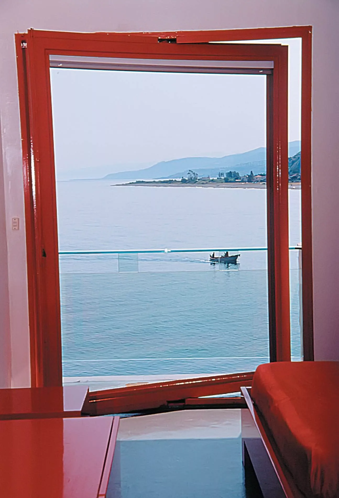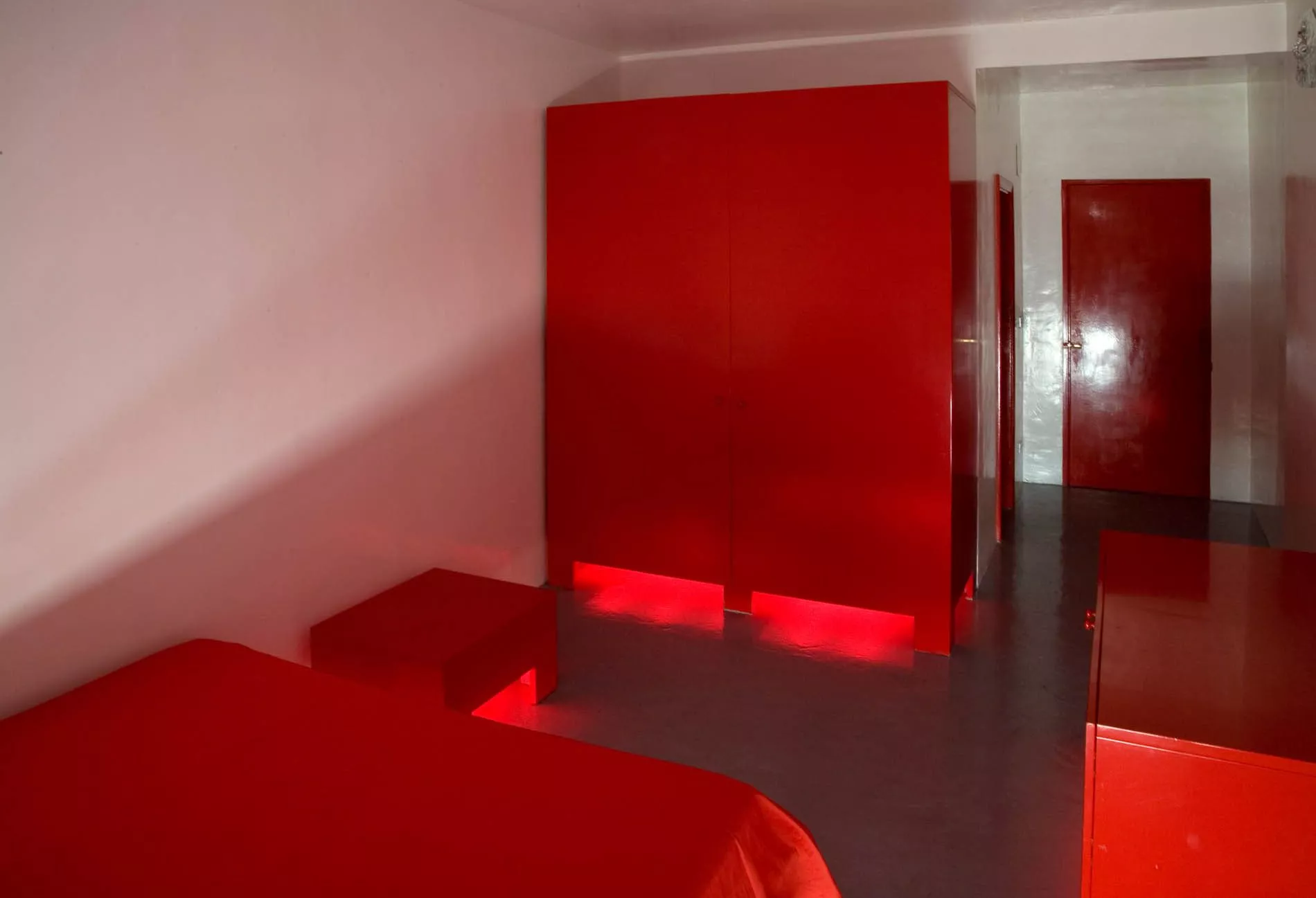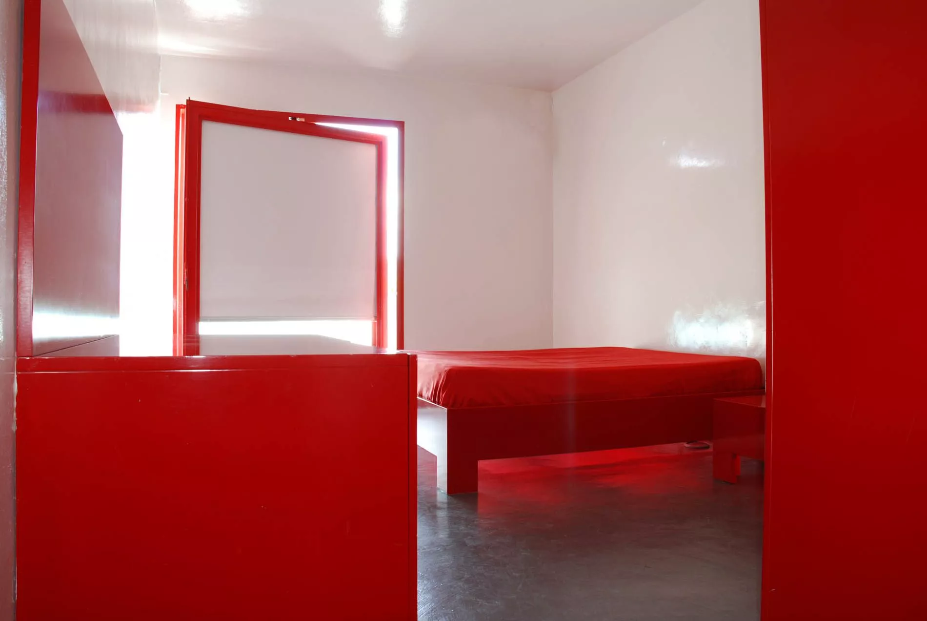 L’energia pervade ogni elemento della stanza e l’ospite diventa anch’egli elemento energetico. La grande finestra quadrata basculante, bianca e incorniciata di rosso, nitida come una scultura minimalista, diventa quindi l’unico elemento di passaggio tra i due stati della materia e nello stesso tempo si propone come unica via di fuga verso il mare e l’orizzonte infinito del paesaggio esterno.