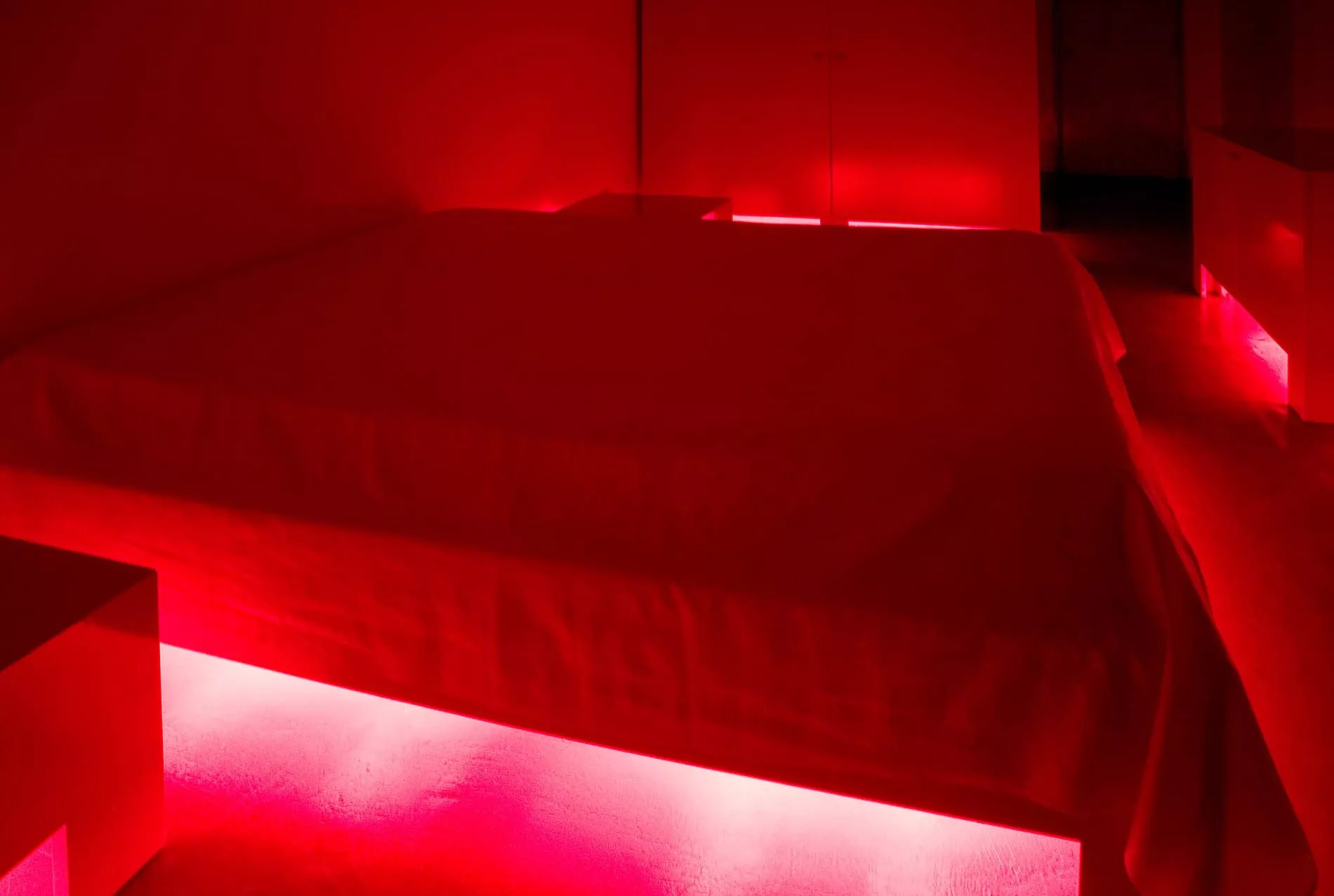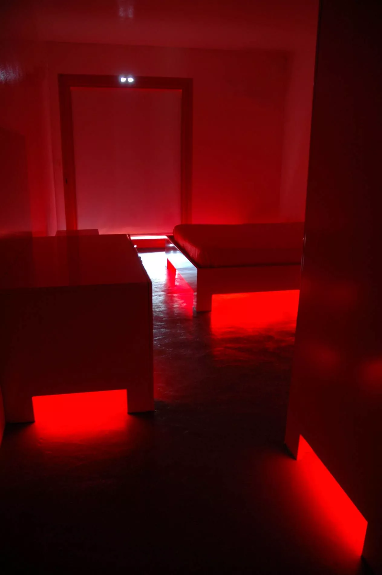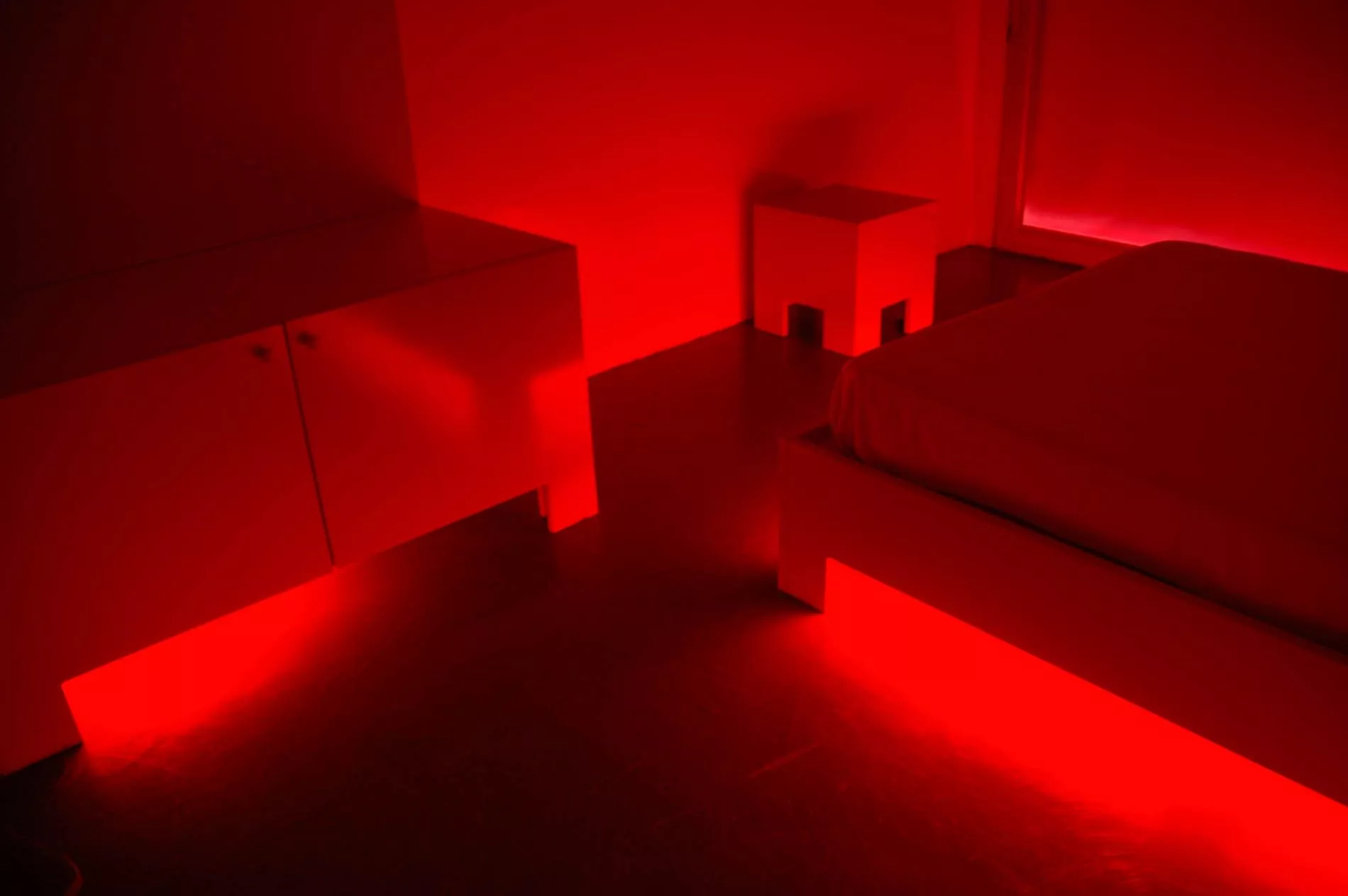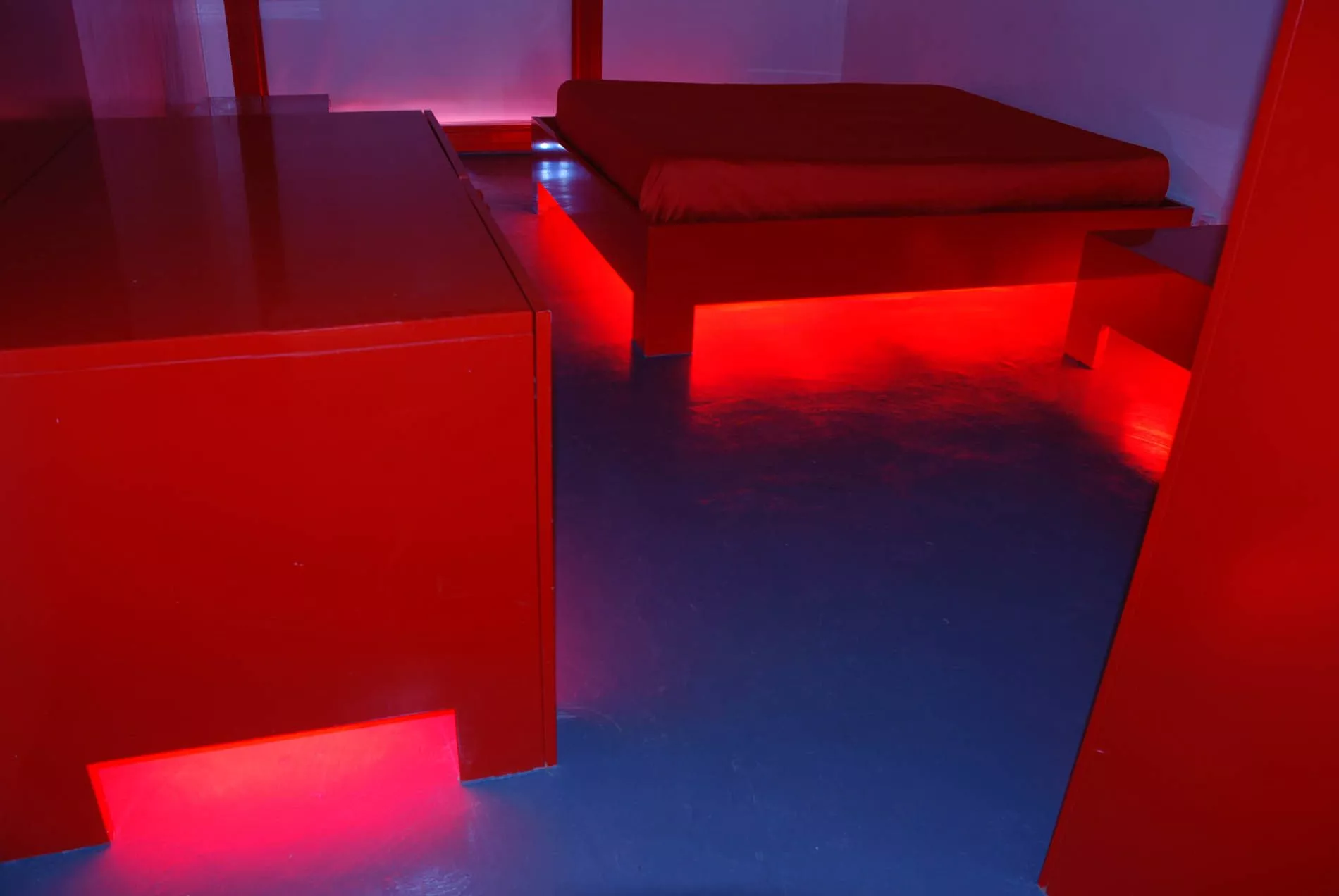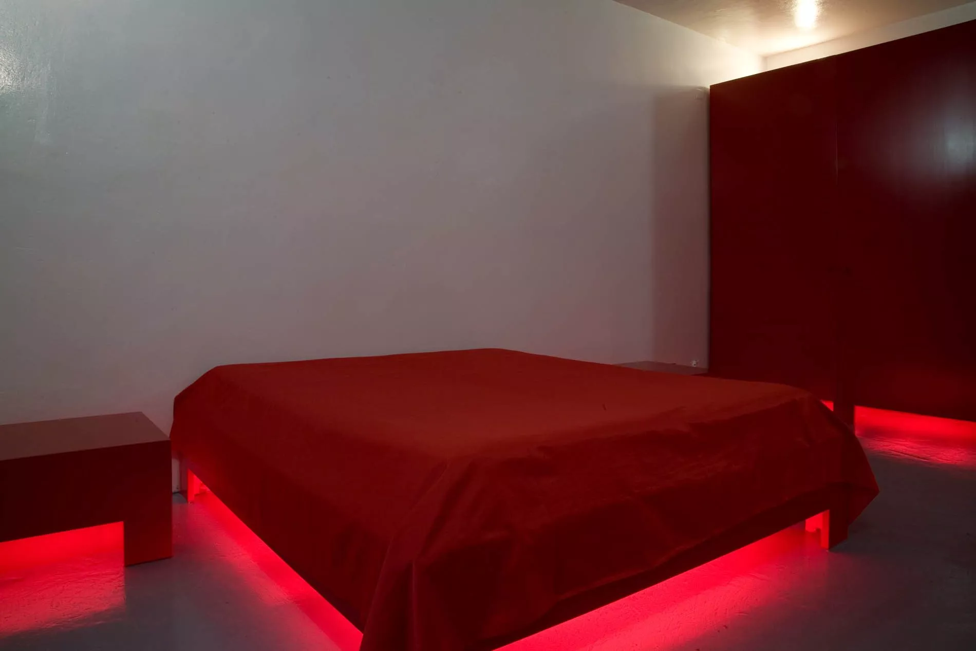 Al buio, invece, una luce rossa, intensa, passionale e appassionata pervade lo spazio capovolgendone la percezione: illuminando dal basso i mobili-scultura, li alleggerisce, smaterializzandoli. Le pareti bianche, in contrasto col rosso, si uniformano in un’atmosfera calda e sensuale.