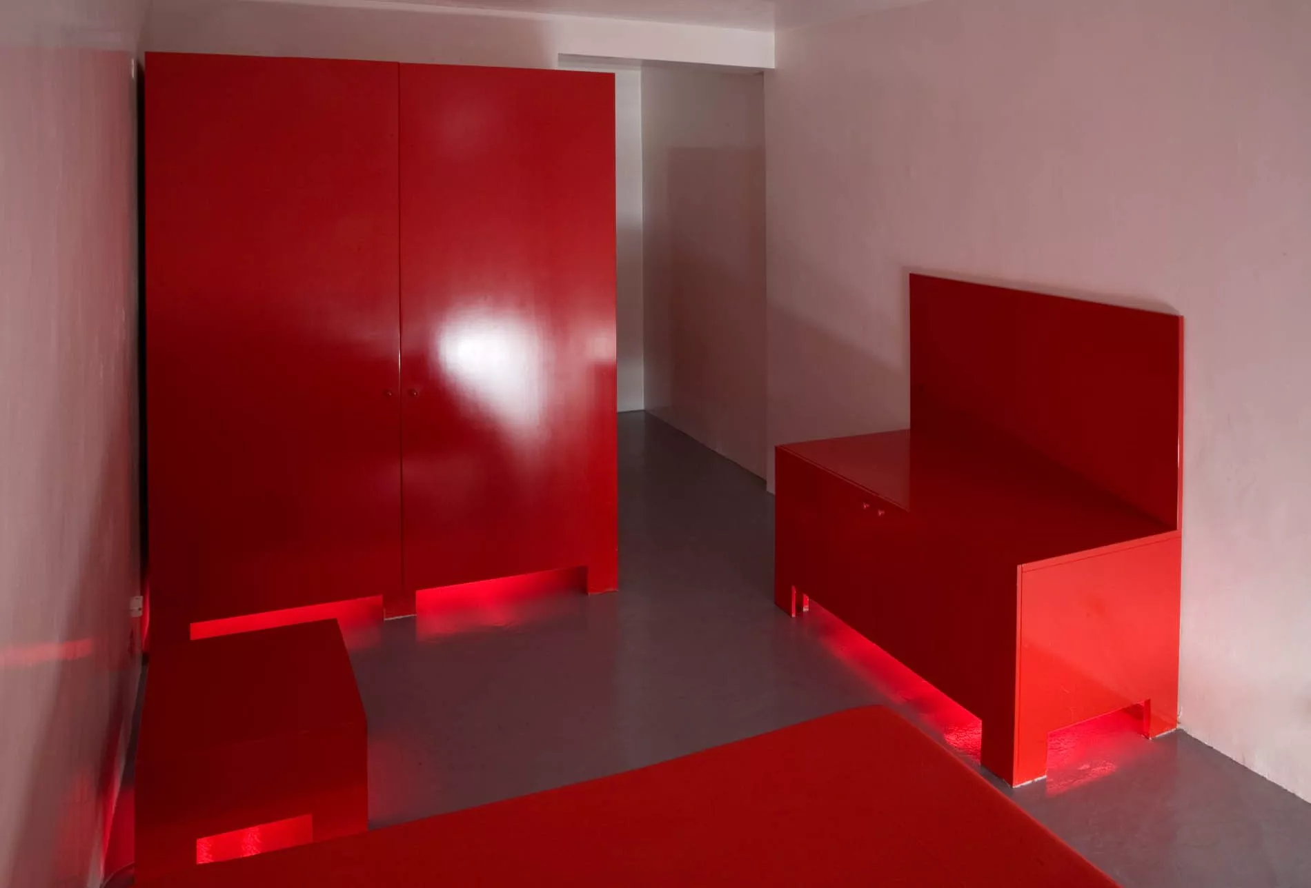 La stanza di Maurizio Mochetti è incentrata sul contrasto tra la pesantezza della materia e l’immateriale leggerezza della luce, tra la purezza algida del bianco e della geometria delle linee e il calore avvolgente del rosso degli arredi. I mobili, dai volumi levigati e massicci, simili a monoliti, sono stati pensati come elementi sproporzionati, ingombranti, rigidi, come risulta evidente quando la camera è esposta alla luce naturale.