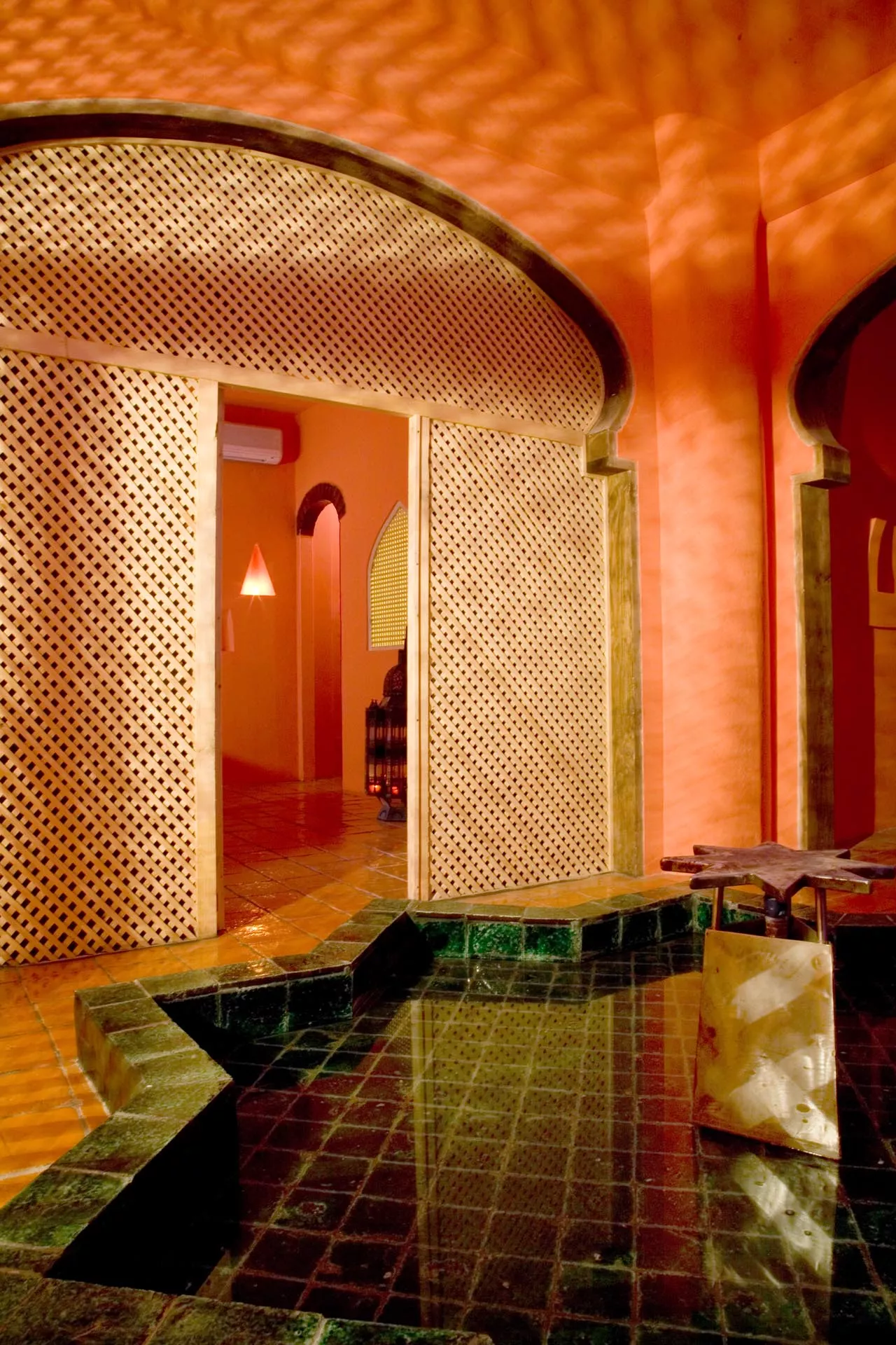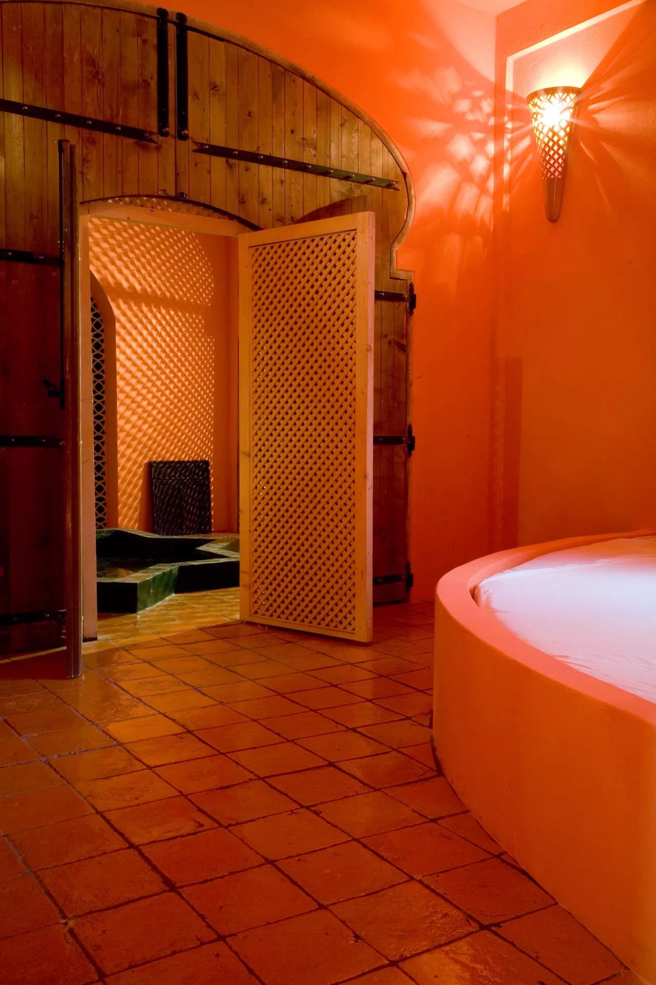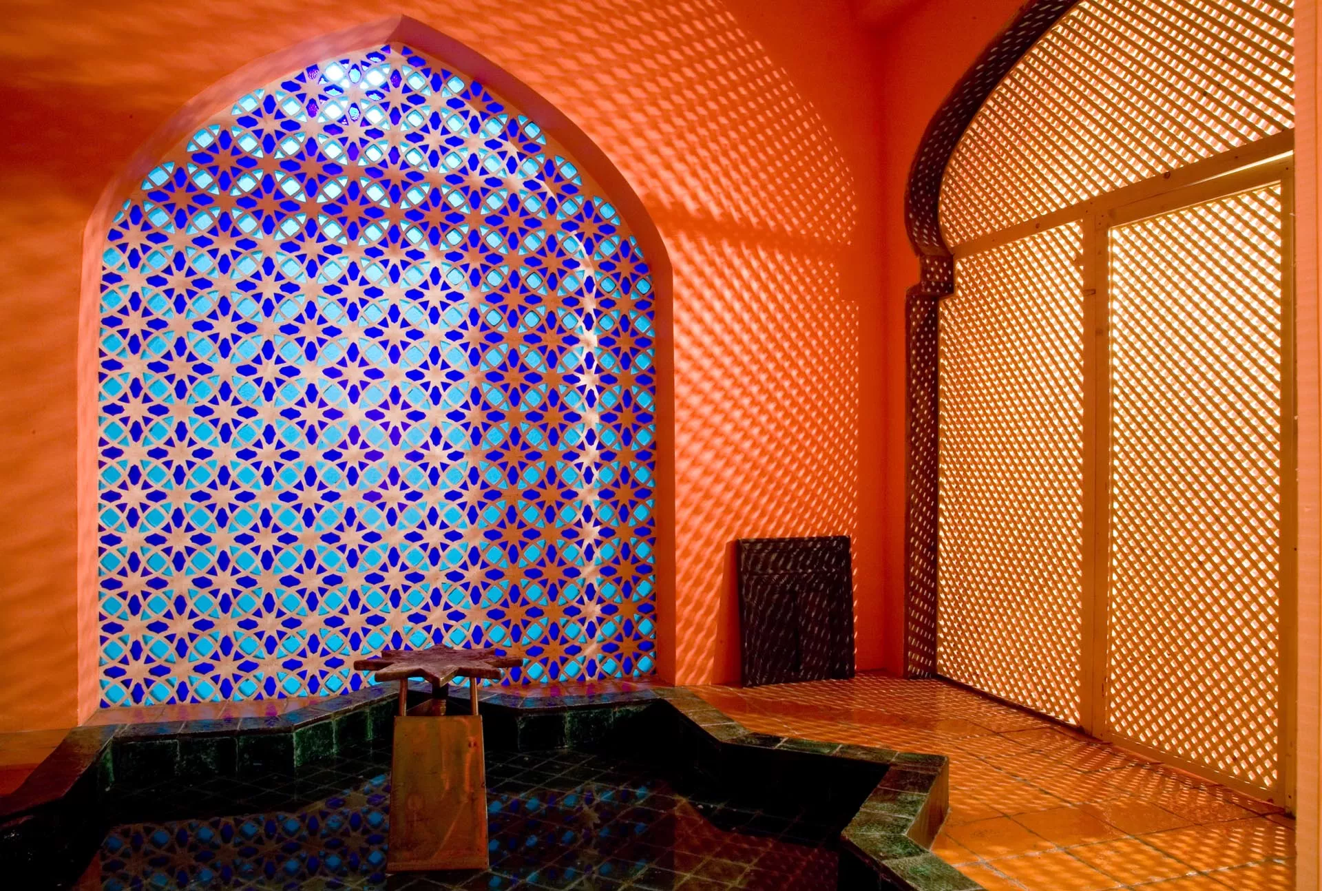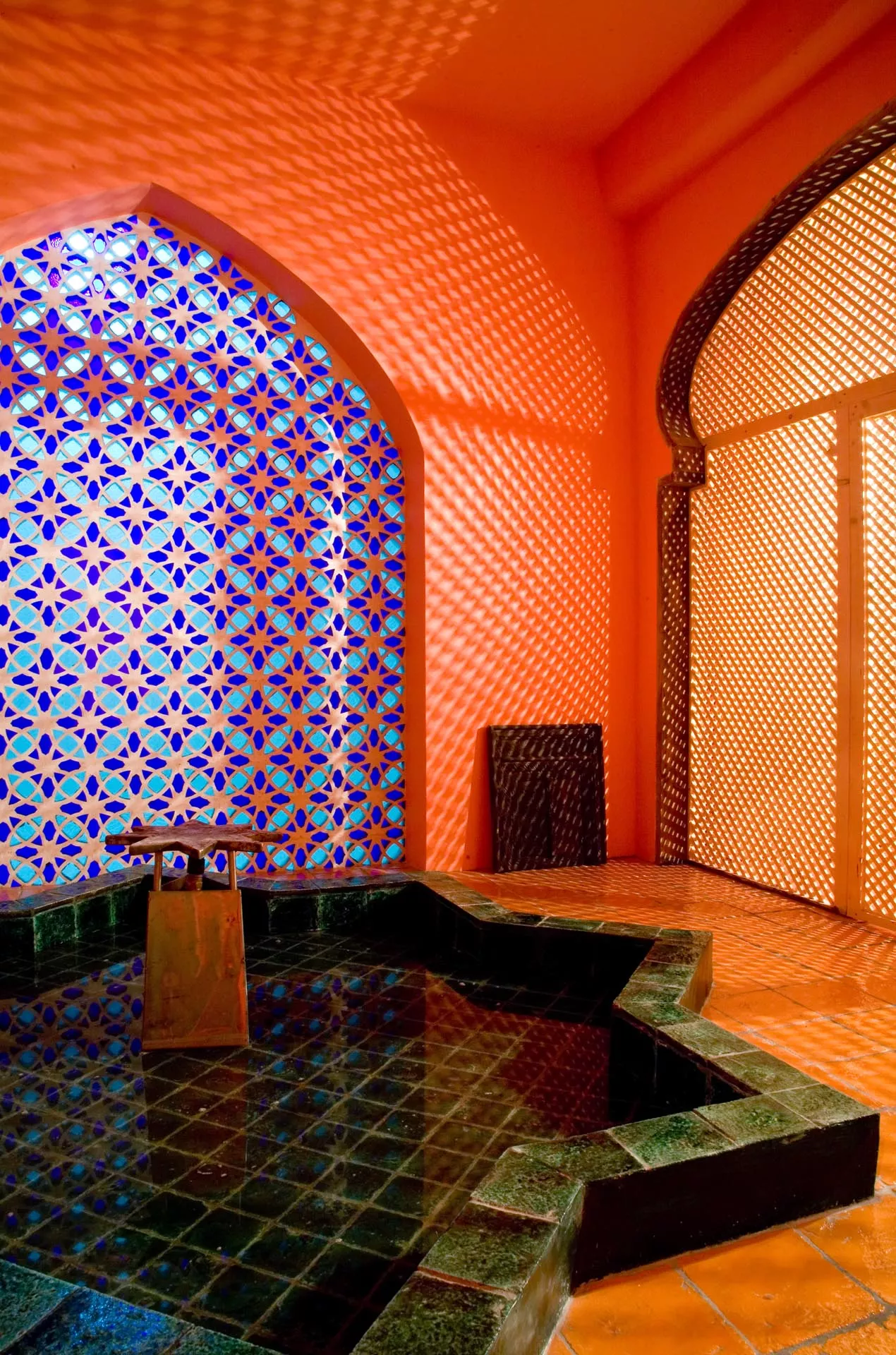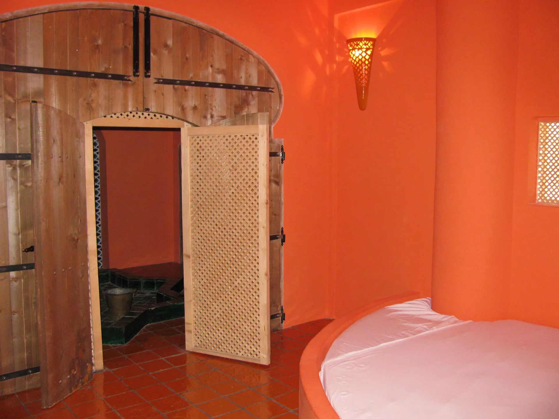 Gli altri due ambienti hanno grandi letti semi-ogivali sui quali riposare dopo aver provato l’esperienza del bagno turco. La bassa vasca a forma di Stella di Davide, la vetrata in stile bizantino, il taglio architettonico musulmano, i tappeti afgani, le lampade marocchine, la sauna finlandese sono elementi sparsi all’interno dello spazio che abbracciano numerose culture dando una forza di conoscenza unitaria.