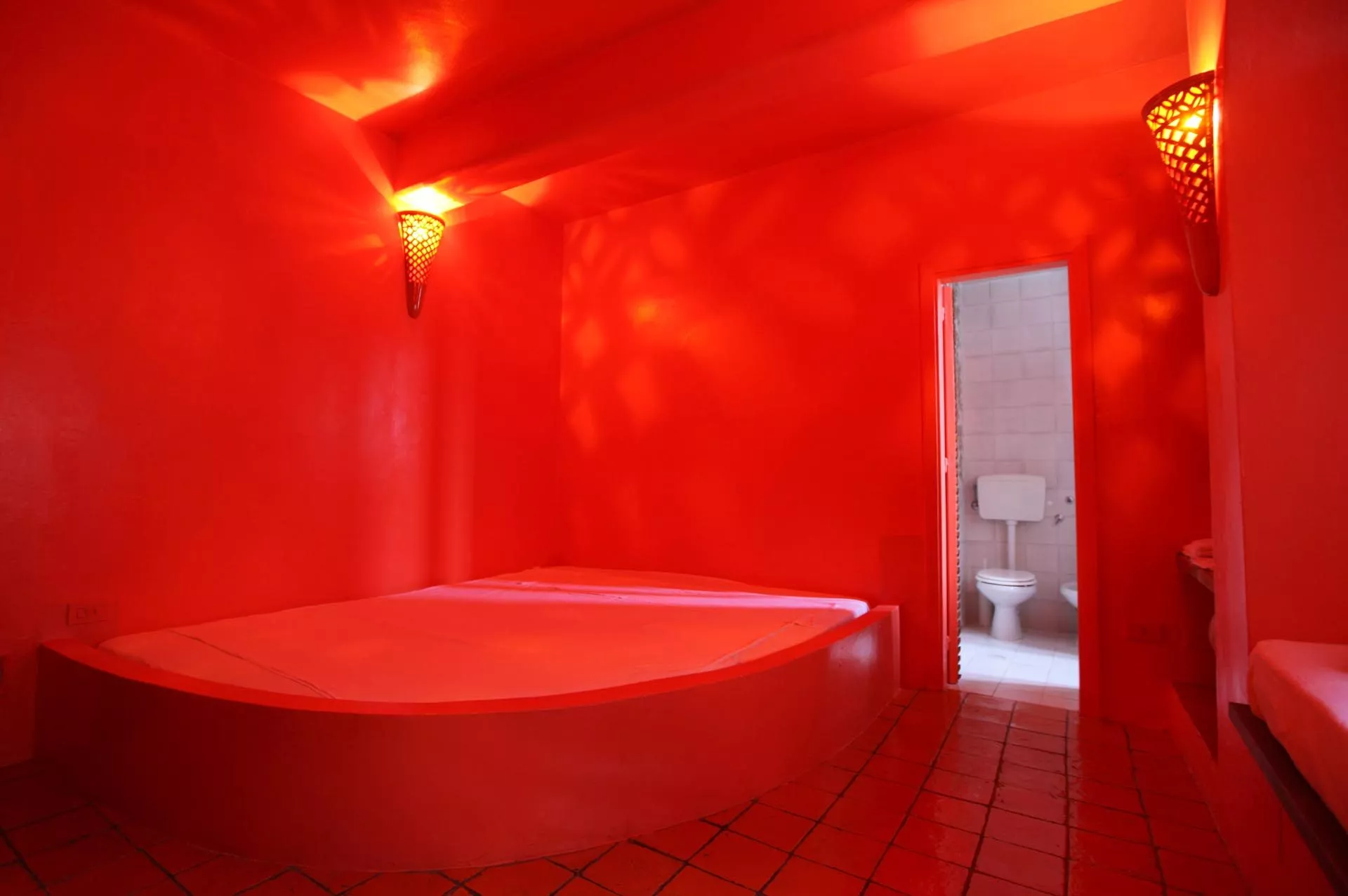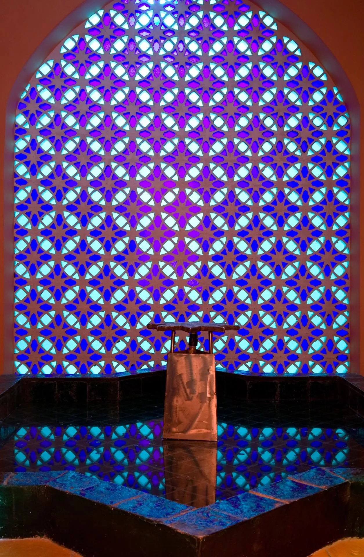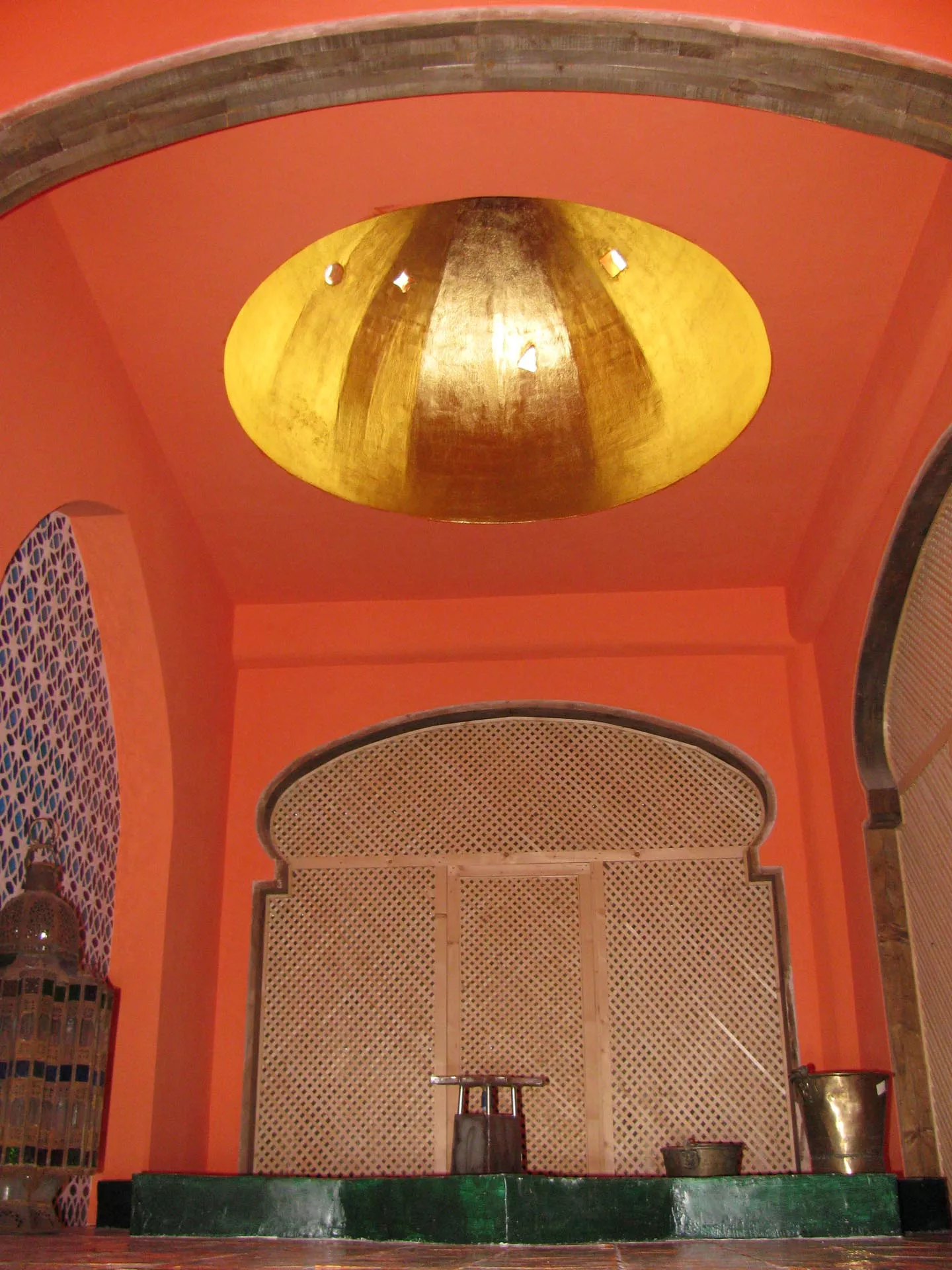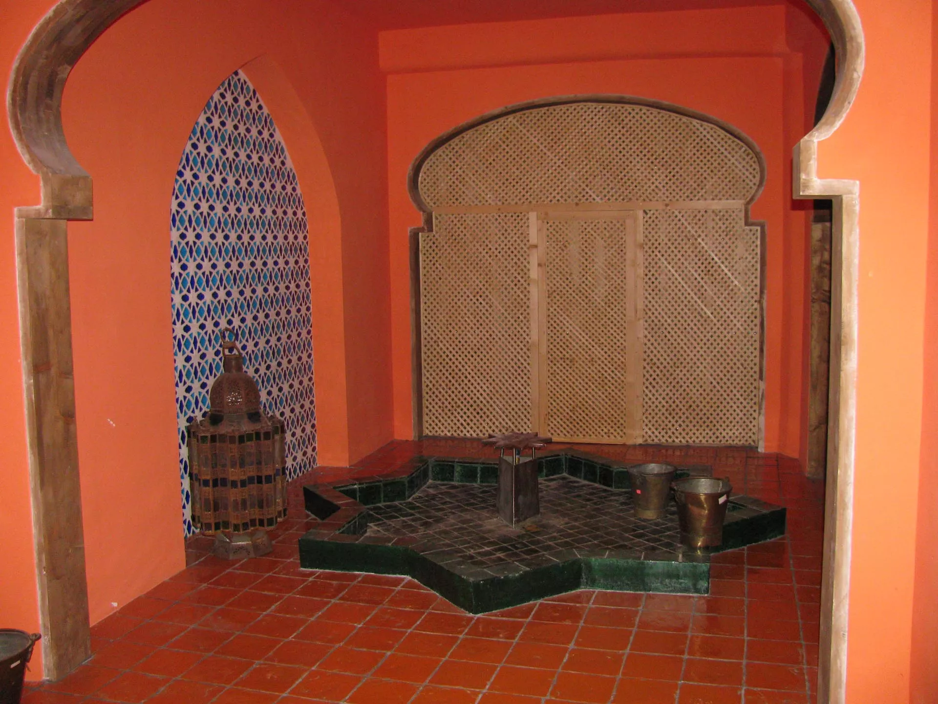 Gli altri due ambienti hanno grandi letti semi-ogivali sui quali riposare dopo aver provato l’esperienza del bagno turco. La bassa vasca a forma di Stella di Davide, la vetrata in stile bizantino, il taglio architettonico musulmano, i tappeti afgani, le lampade marocchine, la sauna finlandese sono elementi sparsi all’interno dello spazio che abbracciano numerose culture dando una forza di conoscenza unitaria.