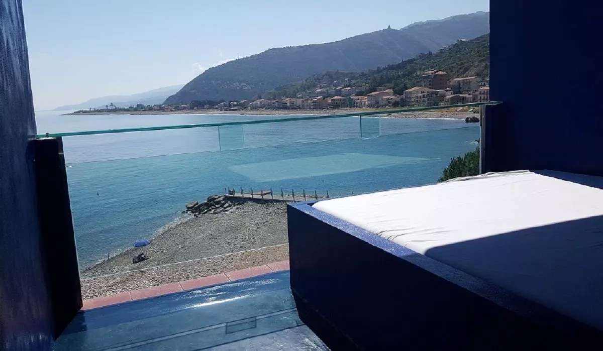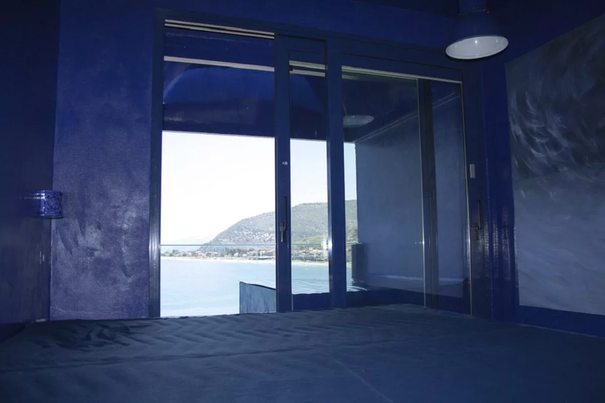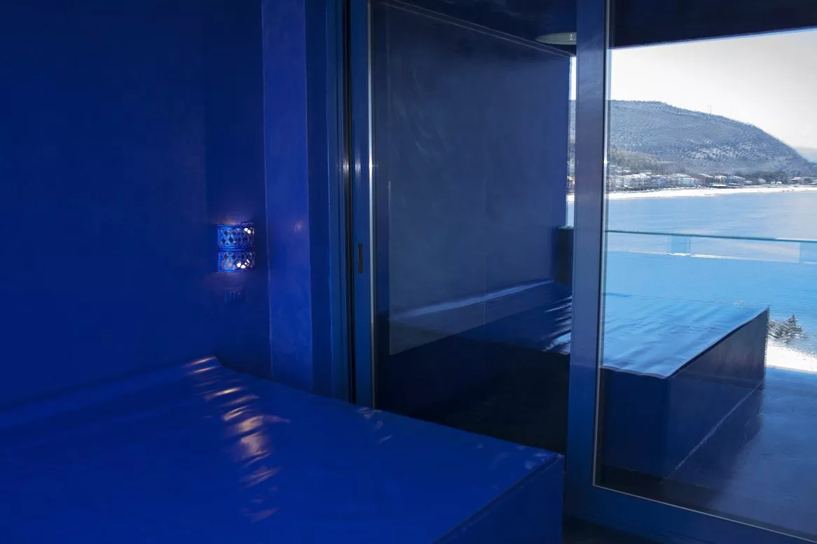 Ogni oggetto o complemento – luci, applique, grucce, mobili, specchi – è avvolto dal colore blu: un’immersione a 360 gradi che conduce ad uno spazio esterno; qui, sotto una cupola che richiama il cielo, un secondo letto, rivolto verso il mare, restituisce un’altra visione di quell’essere blu.