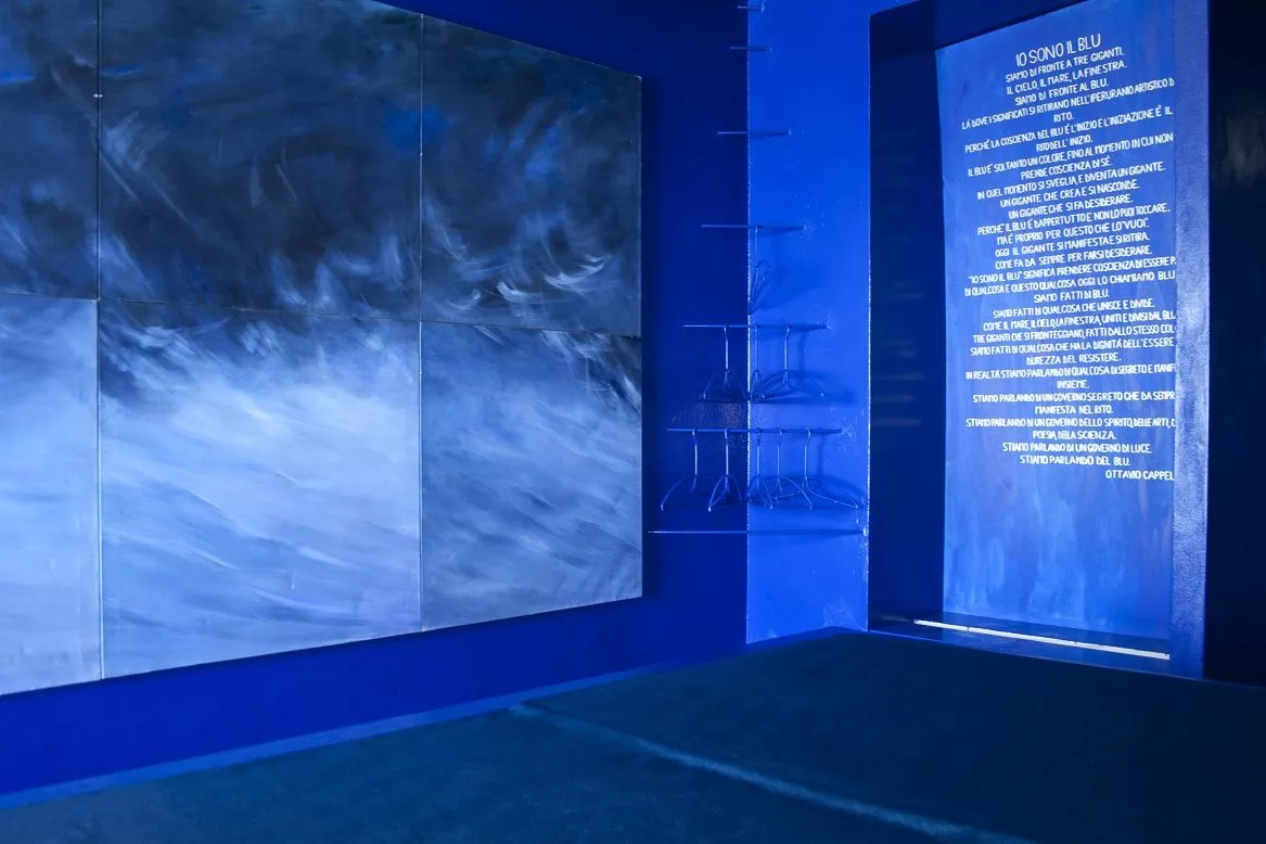 Oltre al testo “Io sono il blu” – affisso su una delle pareti – lo scrittore ha voluto far nascere un nuovo scritto, che i visitatori potranno trovare tra le lenzuola del letto posto al centro della stanza: <<Il blu, il dormire, il Niente, lo Spazio, il Vuoto. È una stanza dedicata al Tempo e allo Spazio, la vedo come una capsula spaziale>>, dice Cappellani. La stanza tutta blu è colma di luce.
