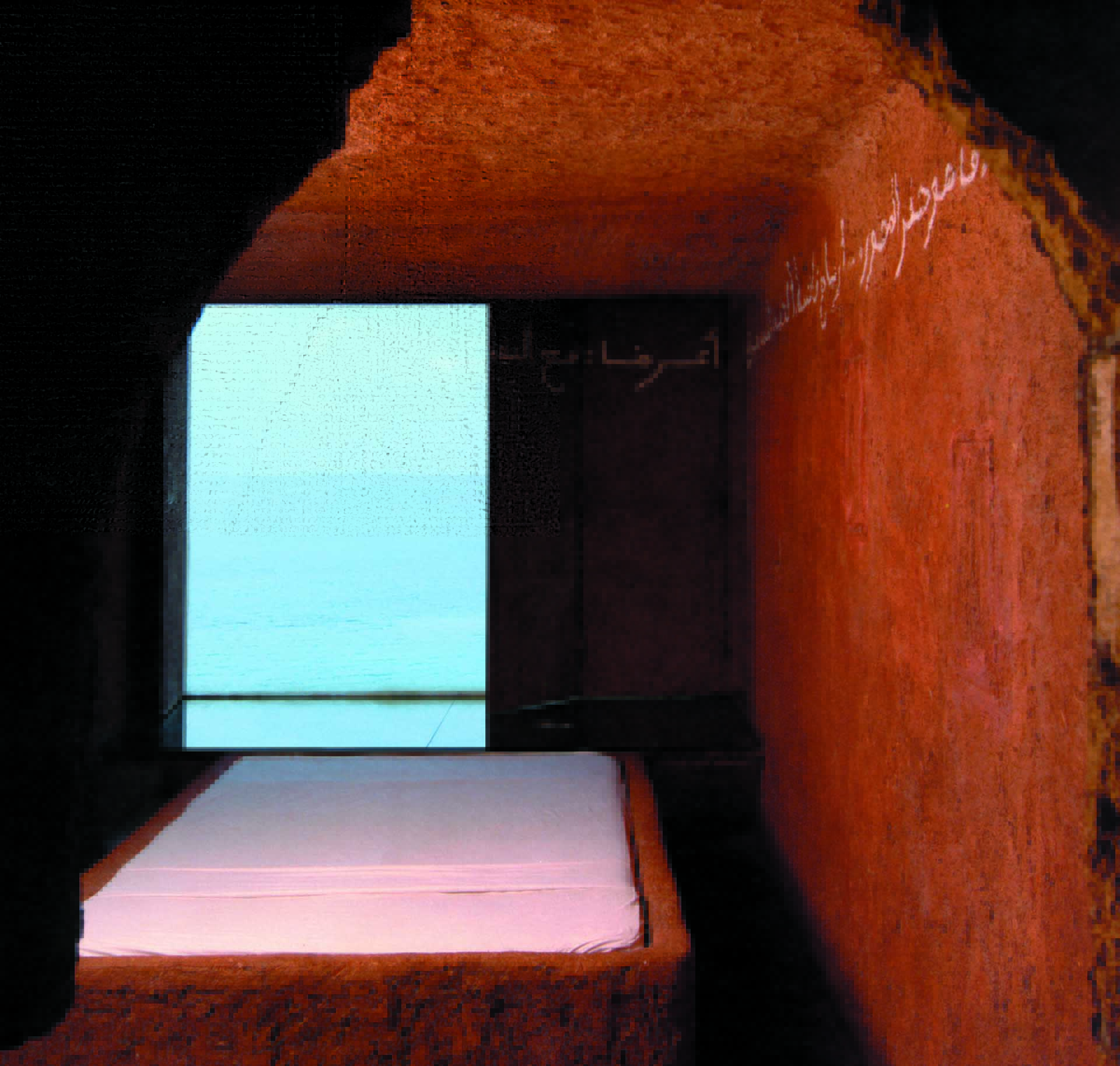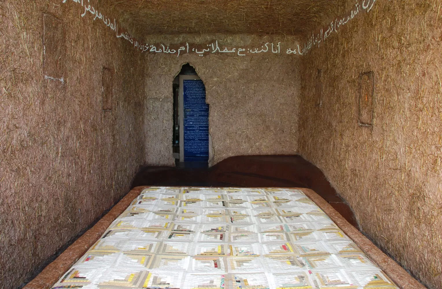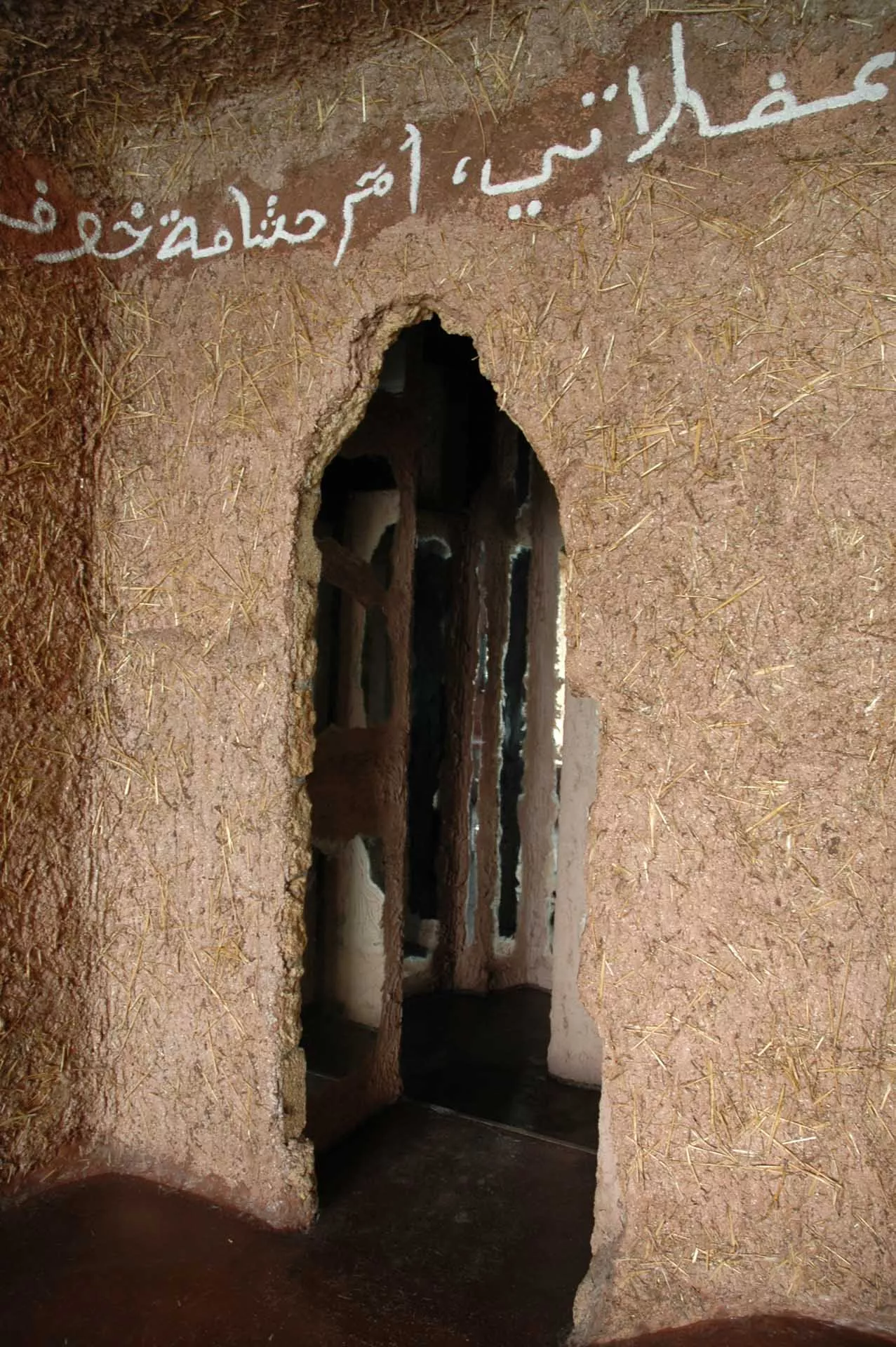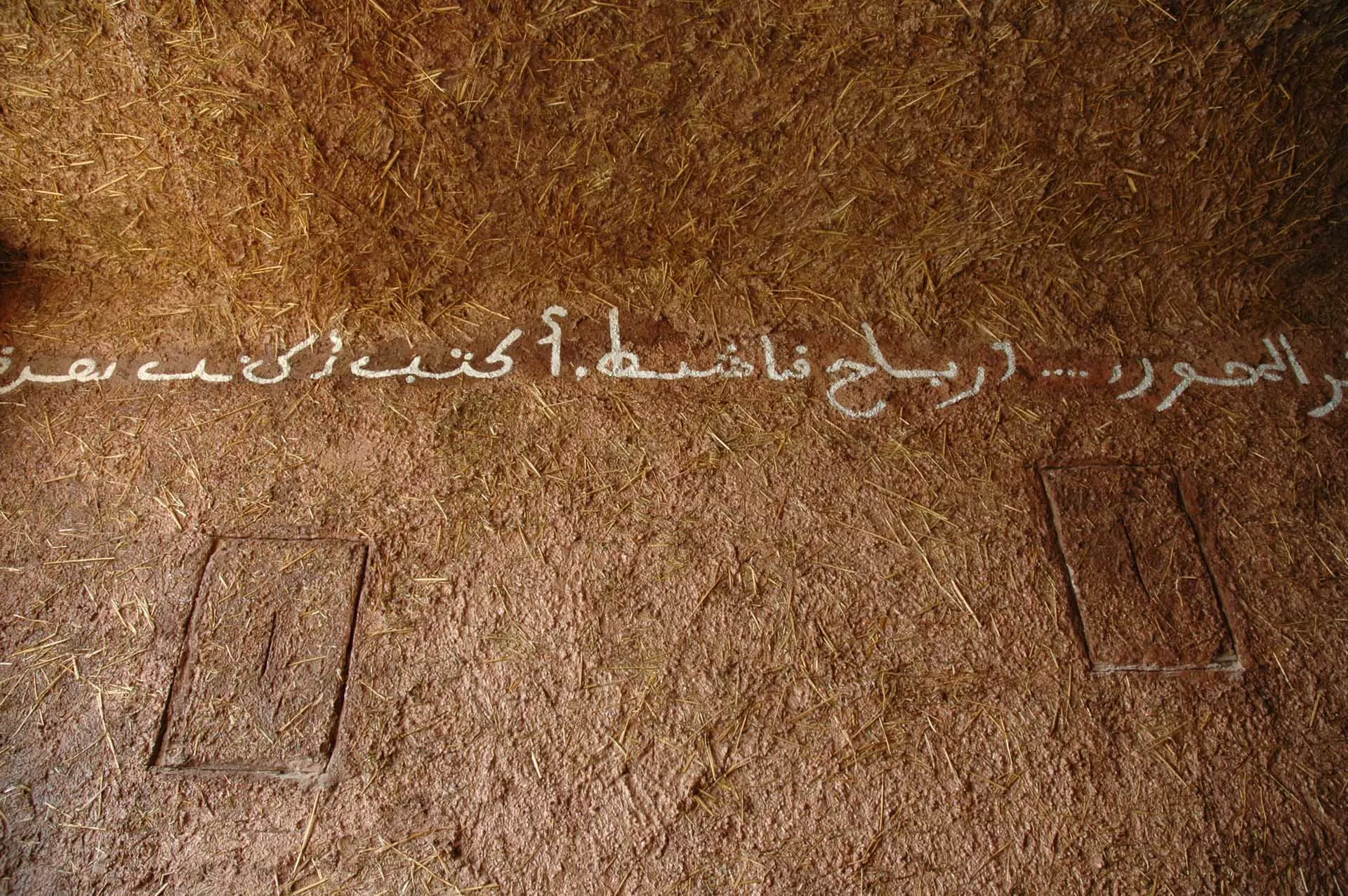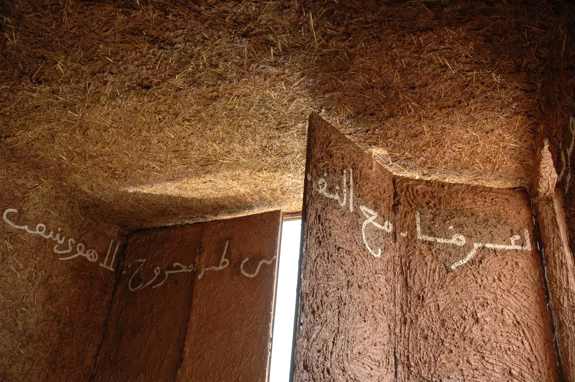 La stessa poesia della porta, scritta in arabo, delimita il perimetro dello spazio, con i caratteri che divengono decorazione ritmica della superficie.