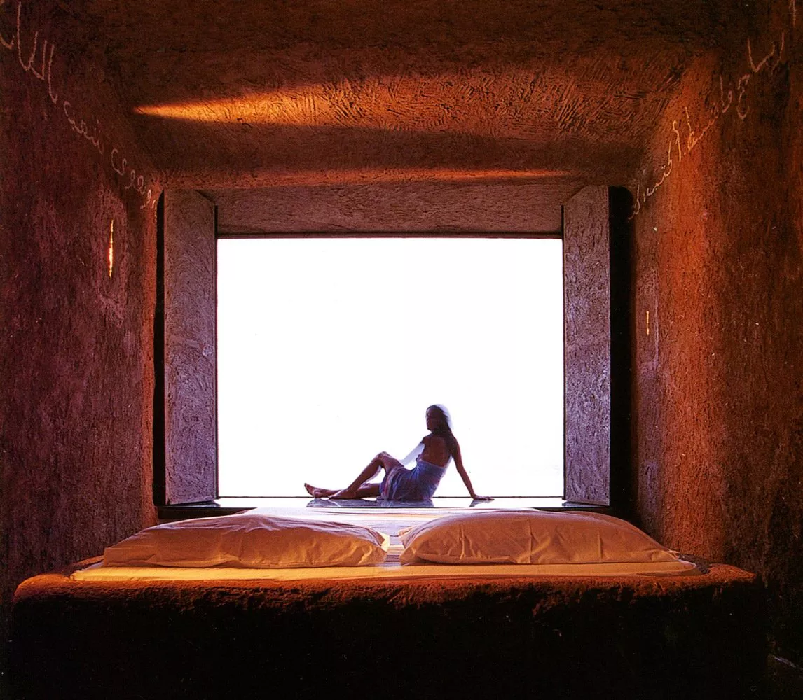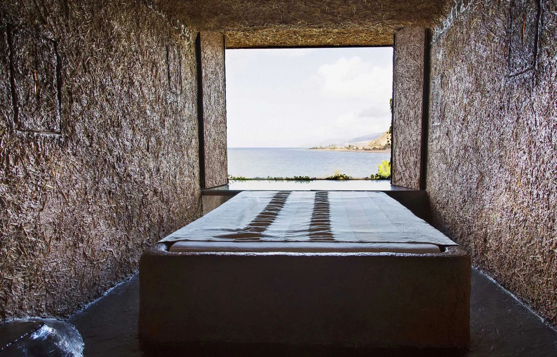 Il grande letto, che richiama alla memoria il Cristo morto del Mantegna, suggella la sacralità della stanza-sacello, scandita da feritoie da cui provengono lame di luce, piccoli altari o confessionali.