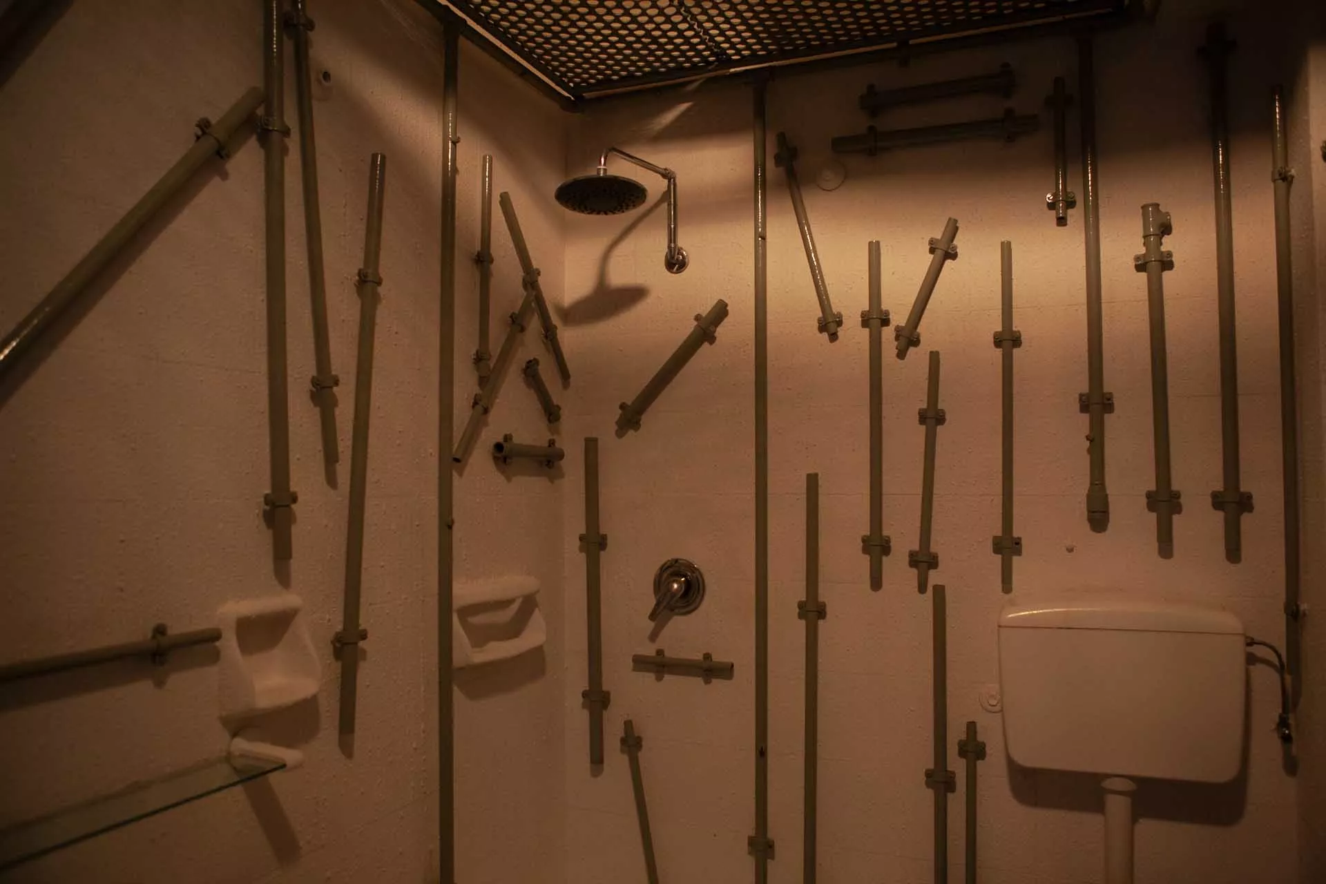 Il bagno rappresenta la parte violenta e cruda di Pasolini: non esiste il pavimento ma solo una rigida griglia di pesante metallo.