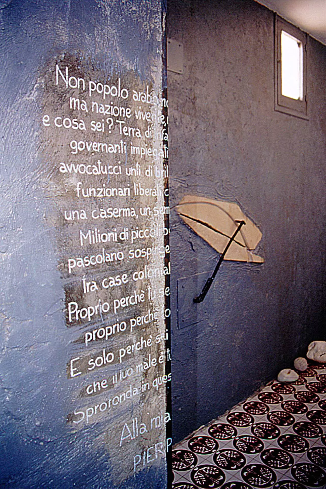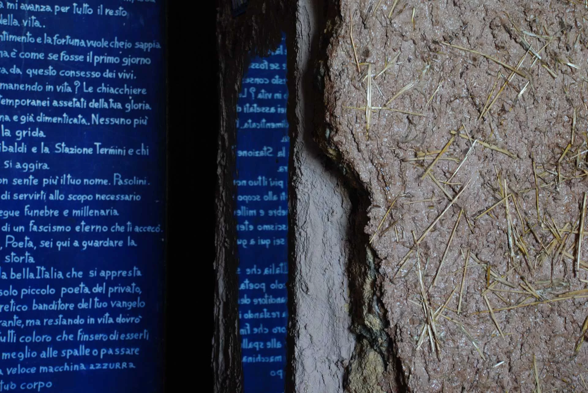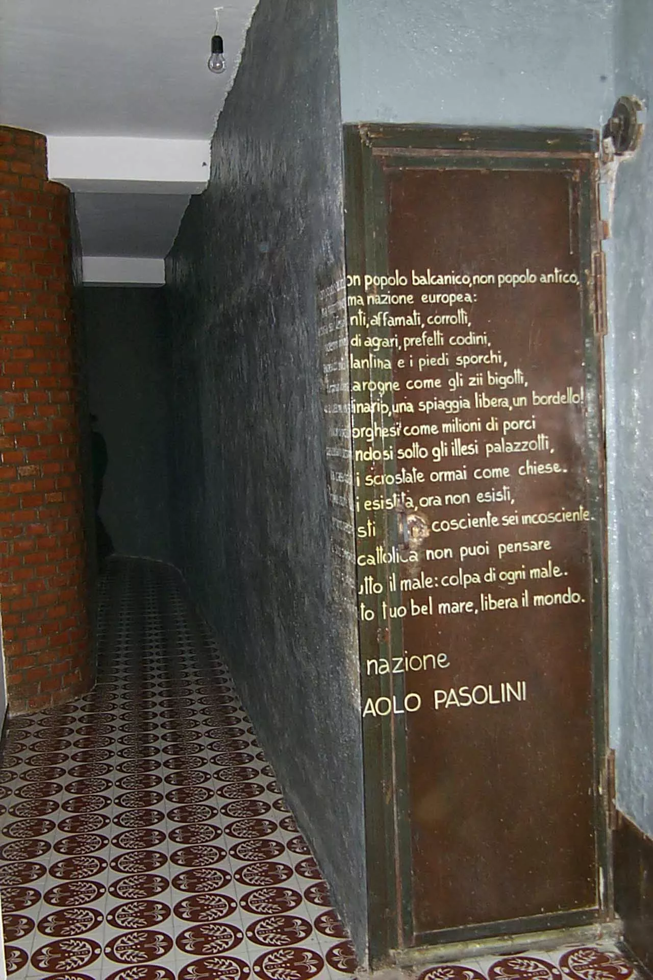Sulla porta d’ingresso un toccante testamento spirituale in forma poetica di Dario Bellezza esprime tutto l’amore per l’amico Pier Paolo.