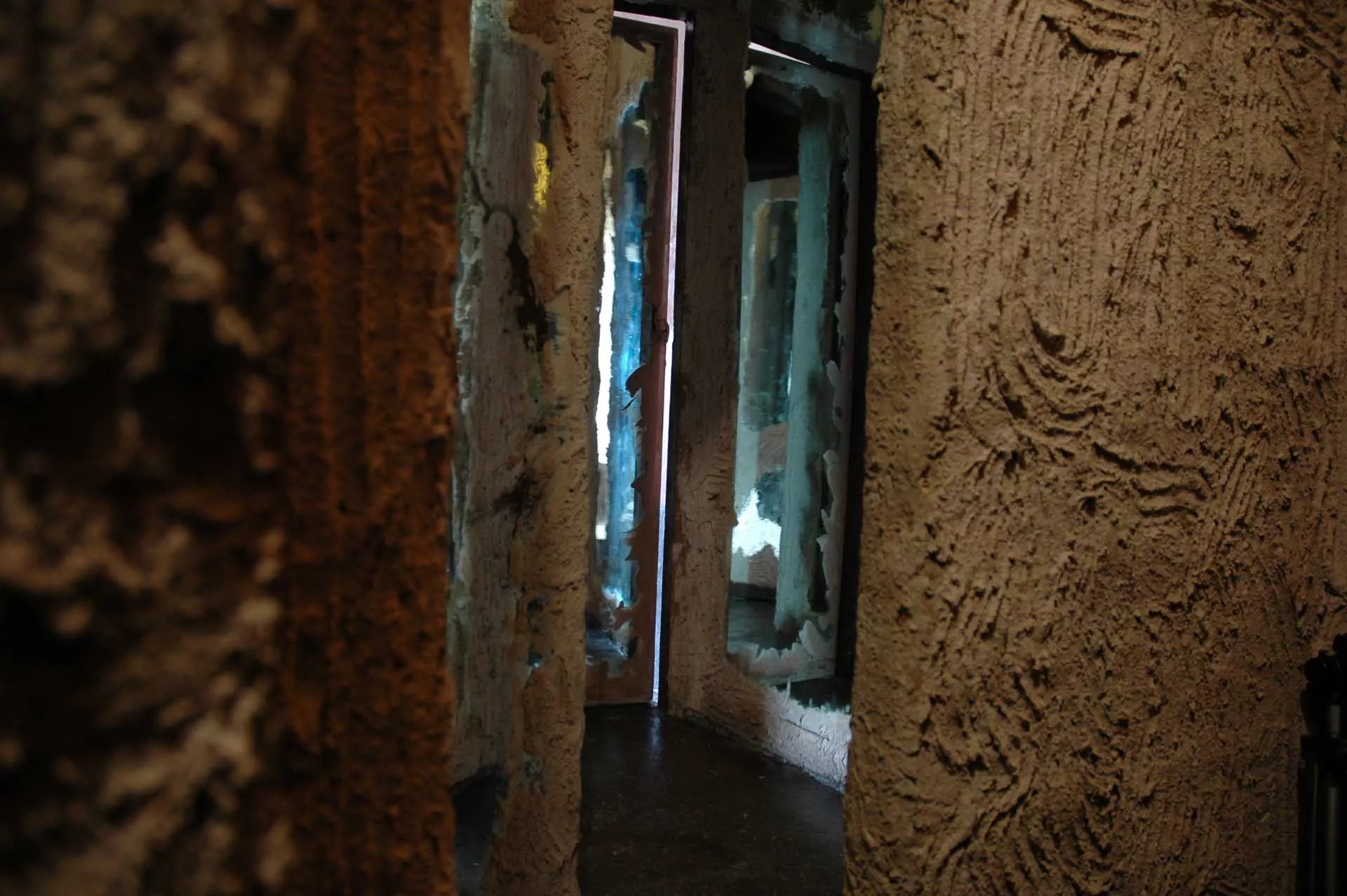 Nel calpestare, non soltanto simbolicamente, la scrittura, si passa attraverso un lungo corridoio di luci che ha la funzione di far maturare nel fruitore angoscia e desiderio di scoperta.