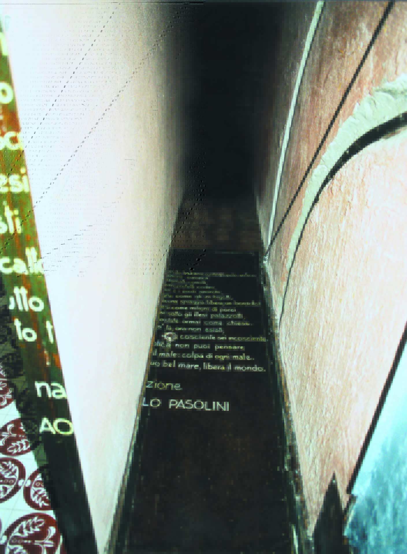 Sotto la vetrata è stata deposta simbolicamente la sabbia dell’idroscalo dove Pasolini è stato ucciso. Qui non vi è nessuna scritta, nessuna intenzione di conoscere il nome dell’assassino.