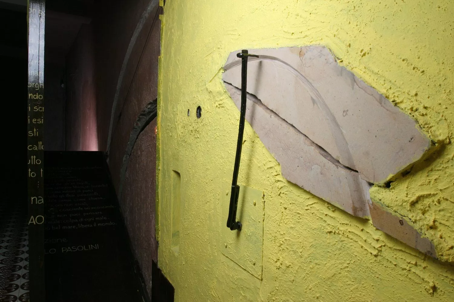 Sui muri un groviglio di spranghe e tubi metallici che emettono acqua con violenta pressione, mentre un’enorme ventola sul soffitto trasforma l’ambiente in un grande bagno purificatore dove ognuno di noi è lavato e centrifugato come quella macchina che passò sul corpo di Pasolini finendolo.
