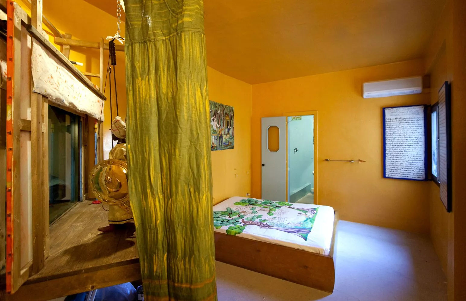 Ed è con l’occhio incantato e innocente di un bambino che Mimmo Cuticchio, artista e uomo di teatro, la cui arte è diventata oggi Patrimonio dell’Umanità sotto l’egida dell’Unesco, racconta la sua infanzia piena di avventura e poesia, ma anche di stenti e sacrifici. Al centro della stanza dell’Art Hotel c’è un piccolo teatrino dei pupi, dietro il letto per dormire, ma anche a simboleggiare lo spazio dedicato al sonno che la famiglia Cuticchio ricavava, nei magazzini dove viveva, durante le lunghe tournée. Tra la stanza e il corridoio, simbolo di uno spazio tra la finzione e la realtà, tra privato e pubblico, c’è un sipario che si apre al visitatore di passaggio.