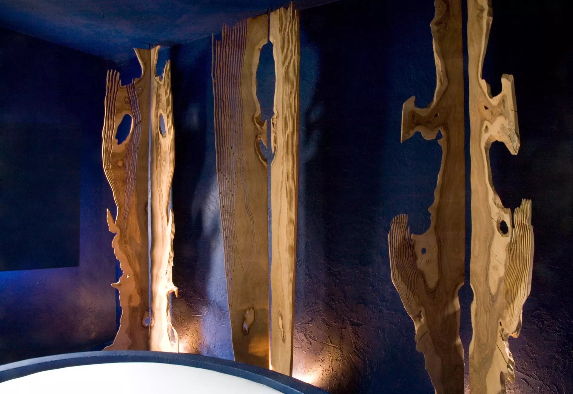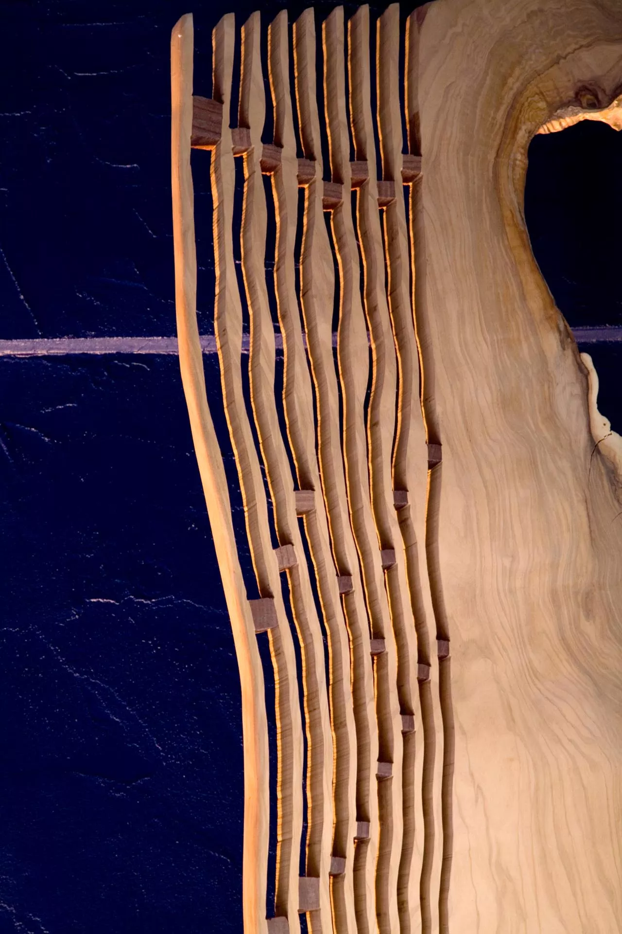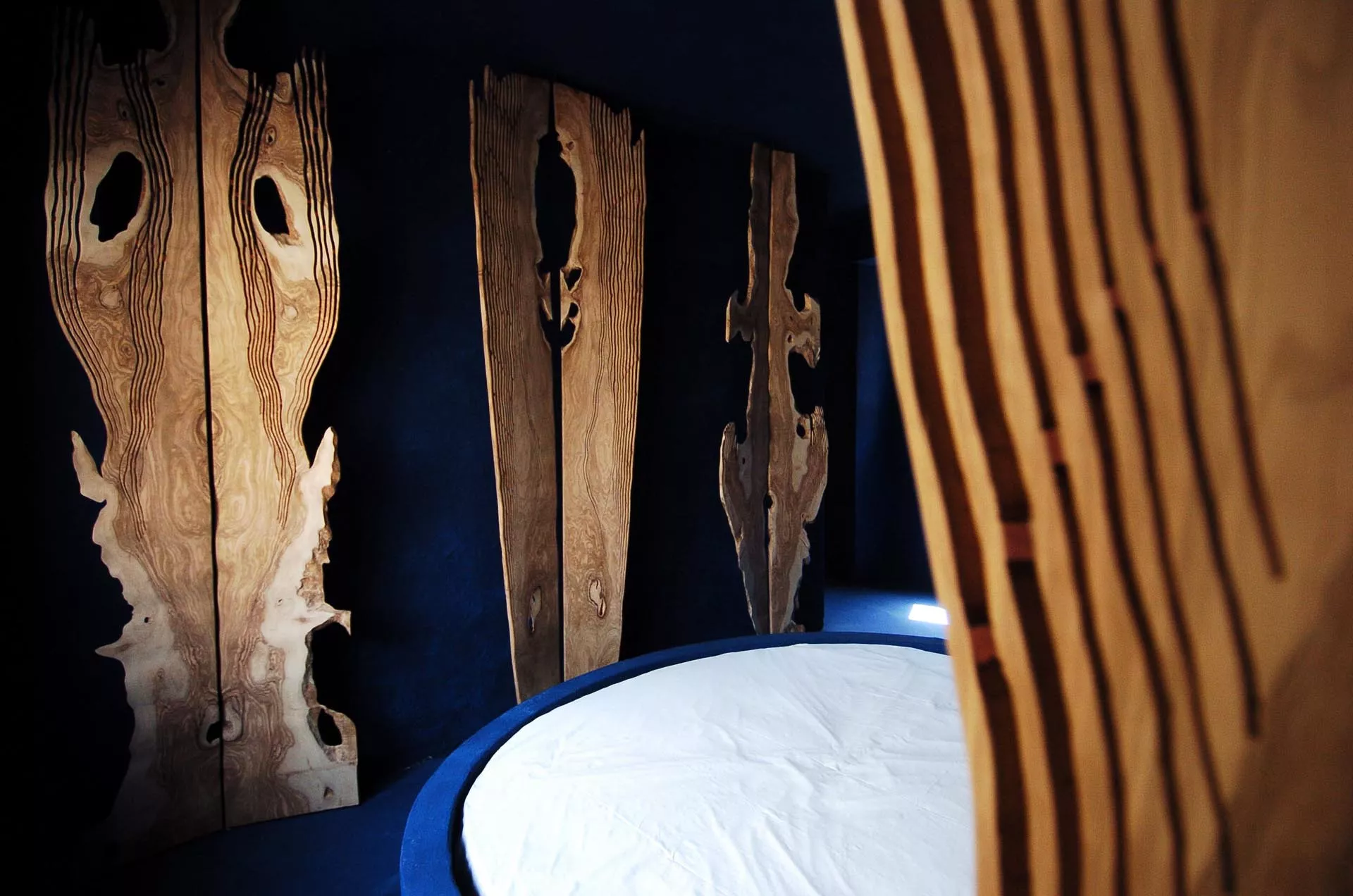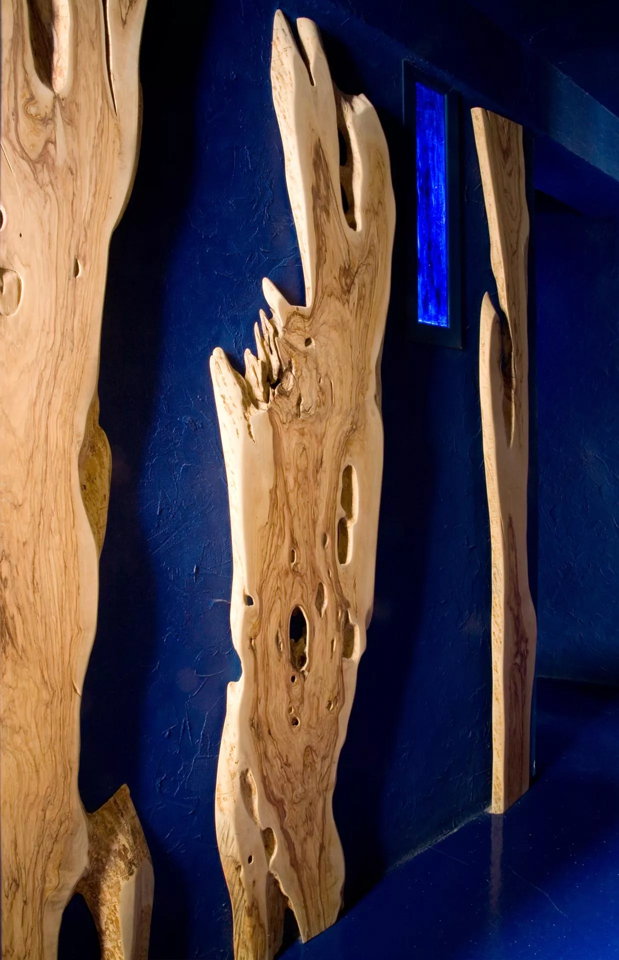 Per la realizzazione della stanza sono stati utilizzati due tronchi di ulivo che sono stati sezionati longitudinalmente ricavandone 12 sculture.