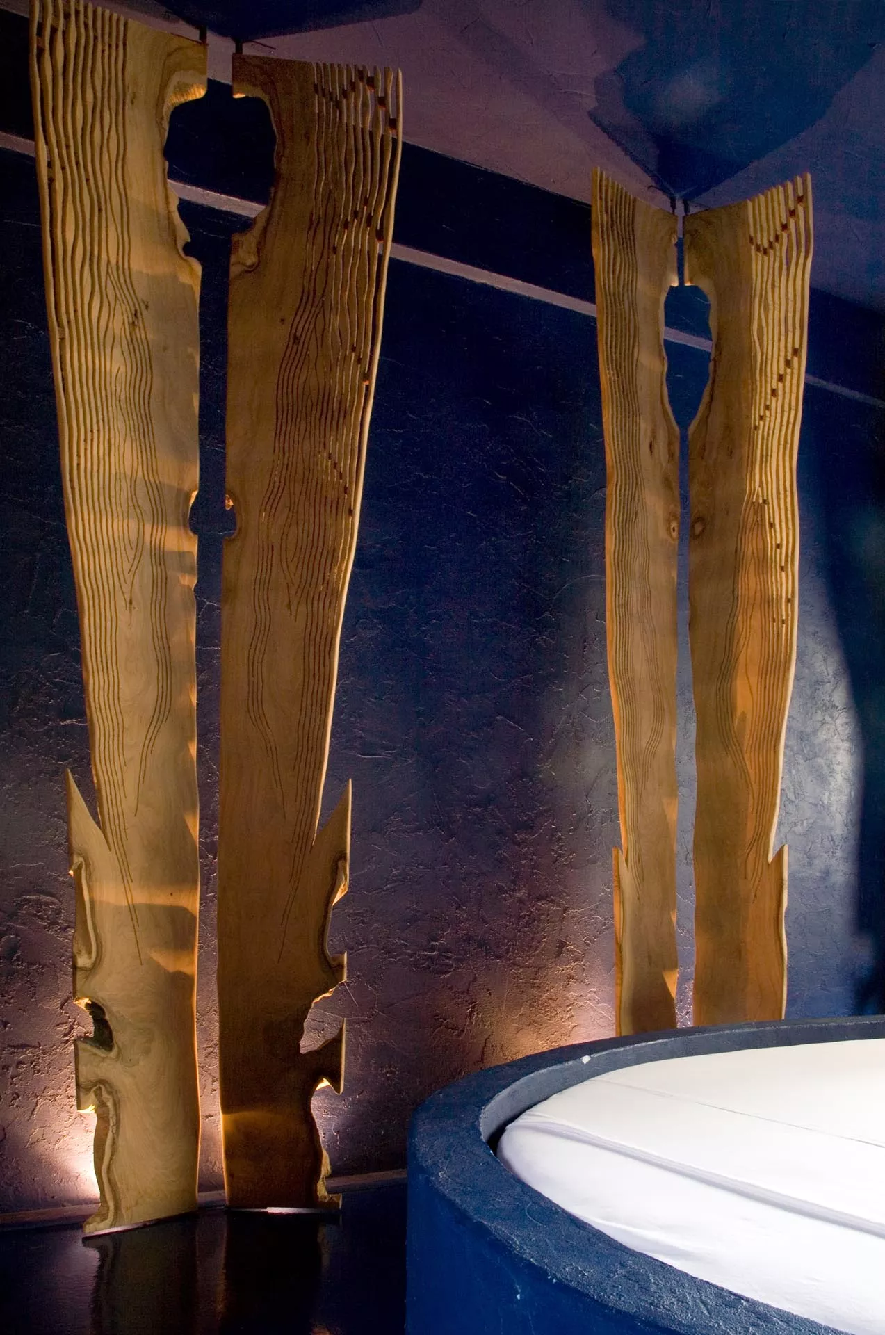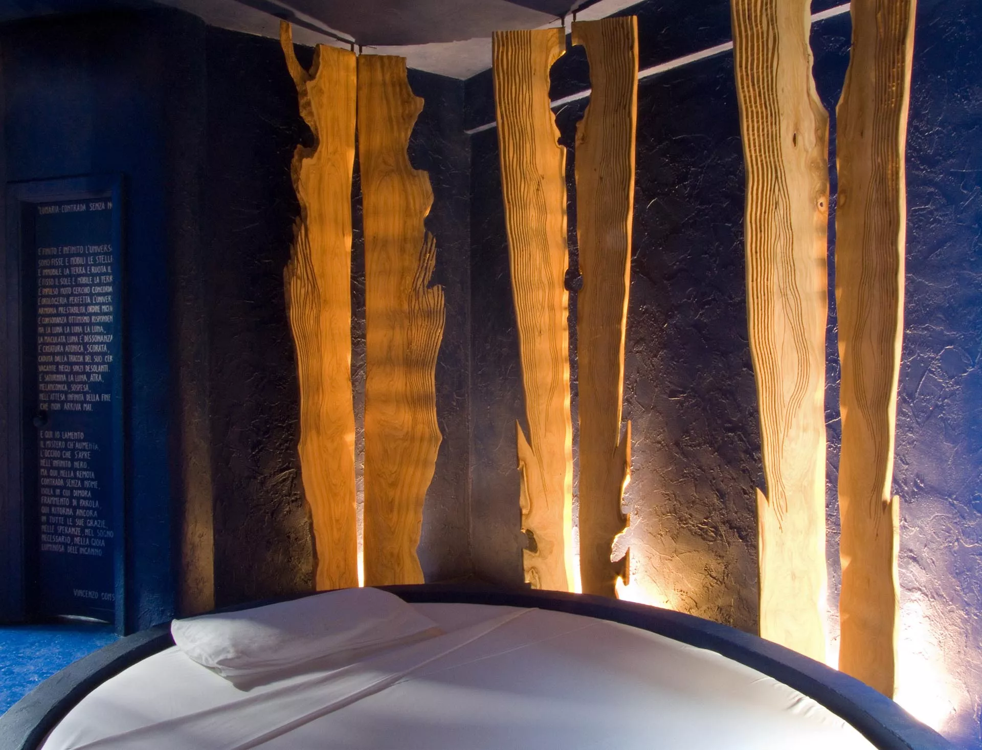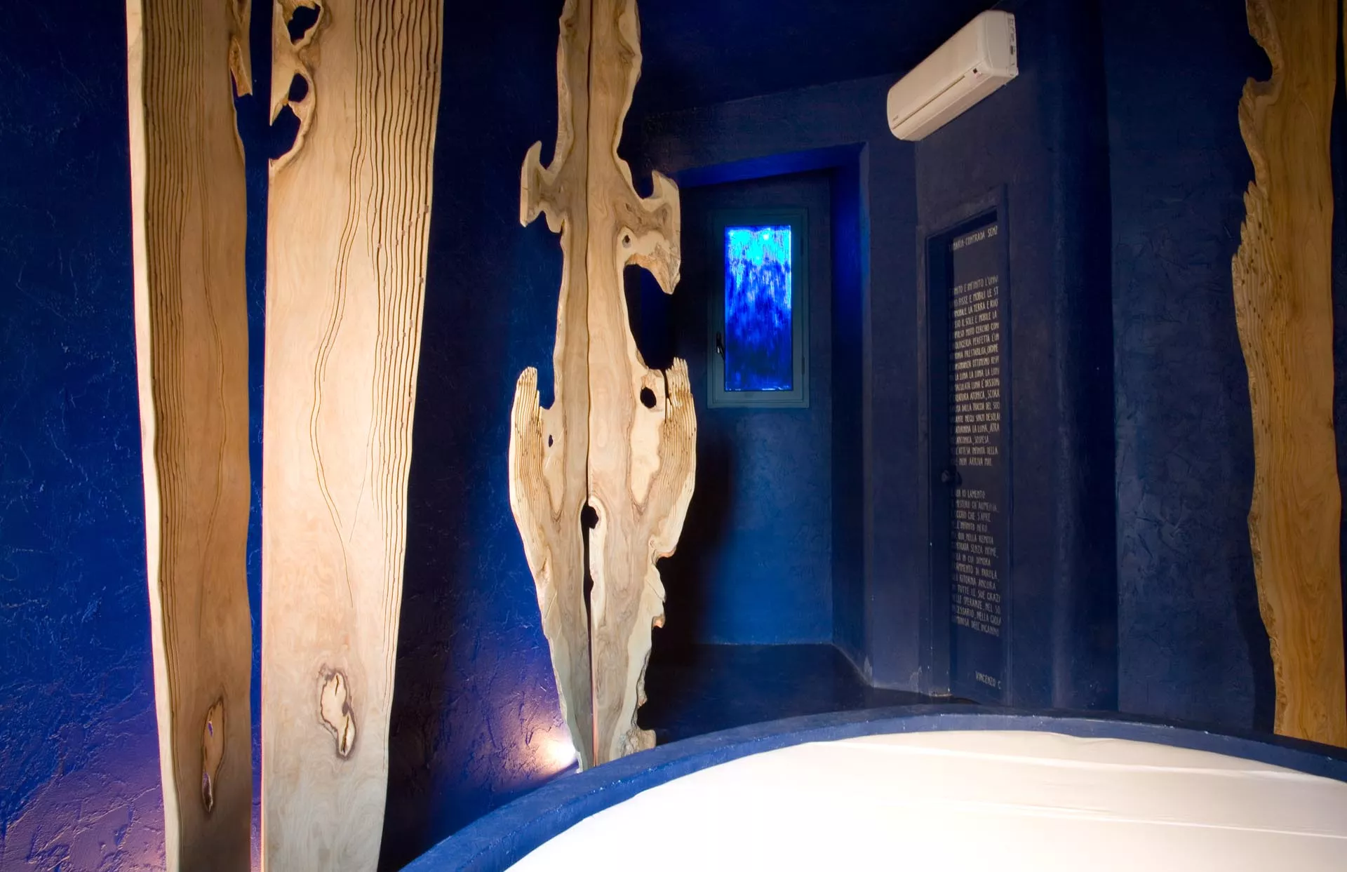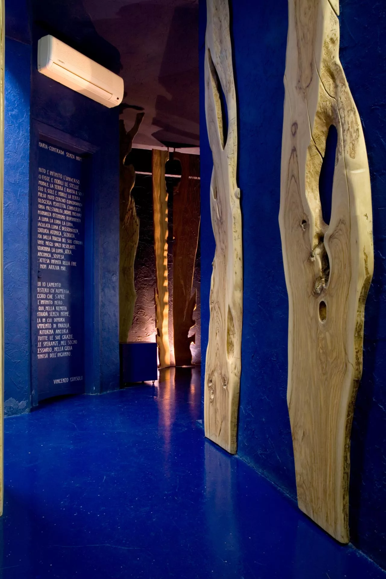 Per la realizzazione della stanza sono stati utilizzati due tronchi di ulivo che sono stati sezionati longitudinalmente ricavandone 12 sculture.