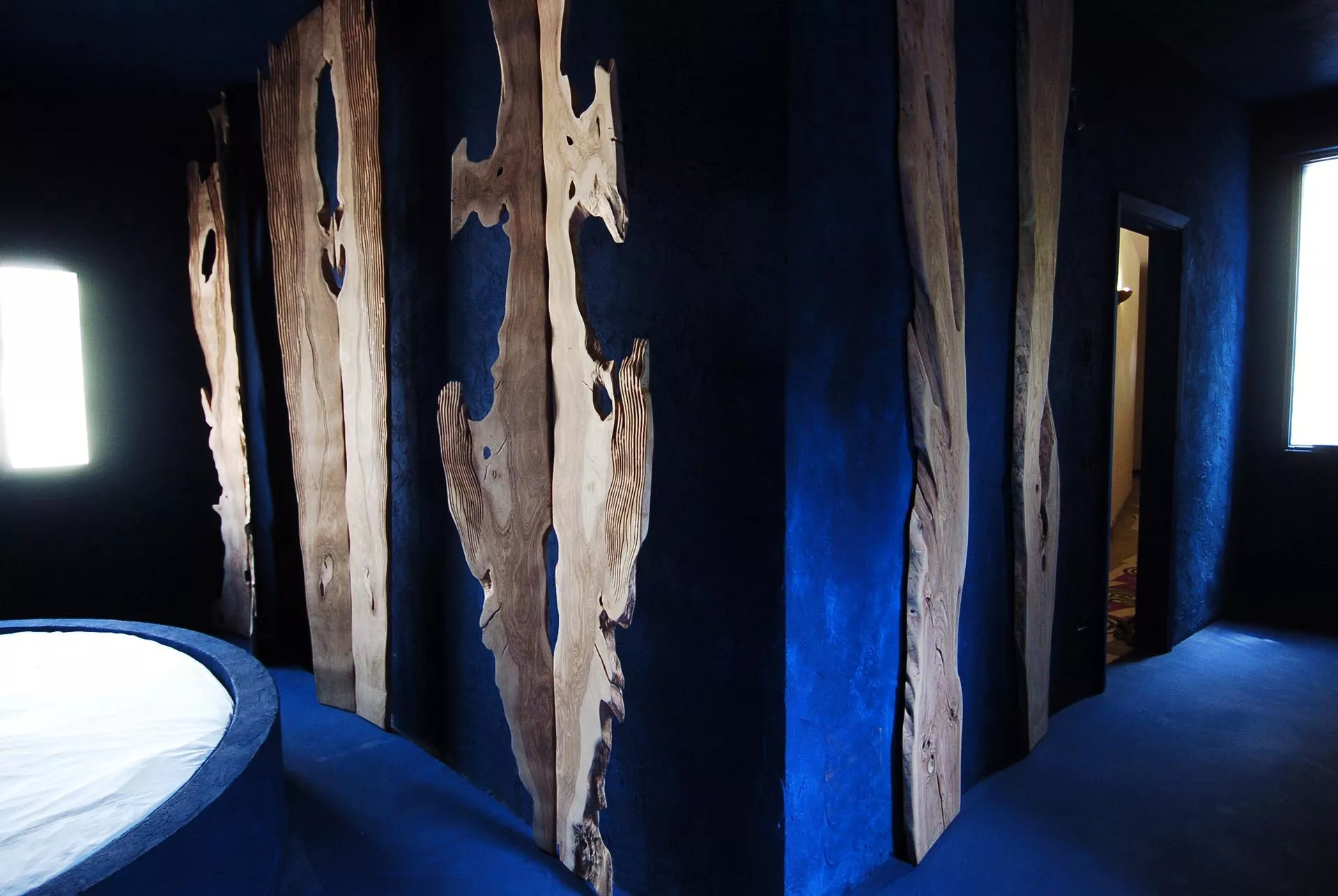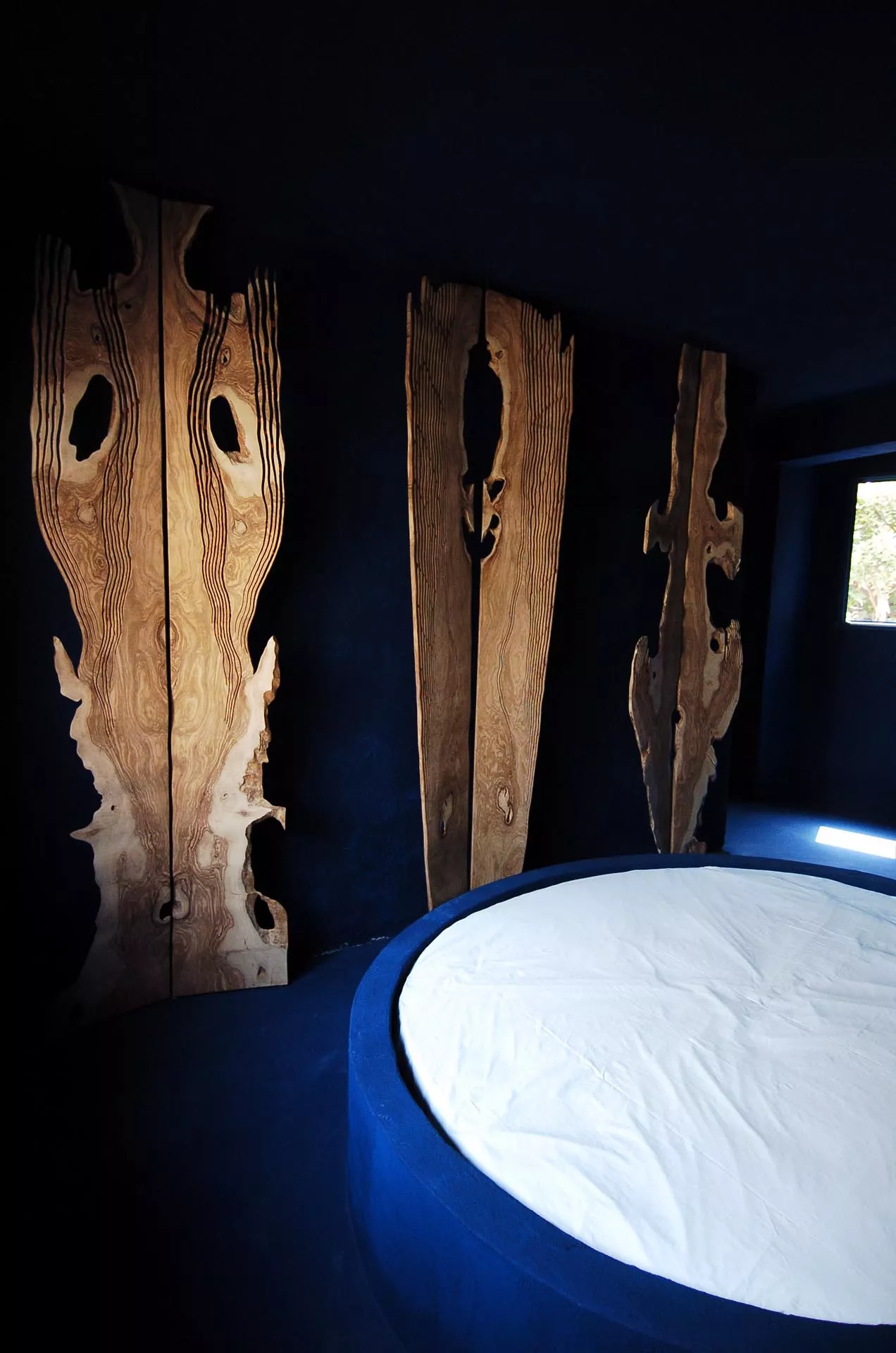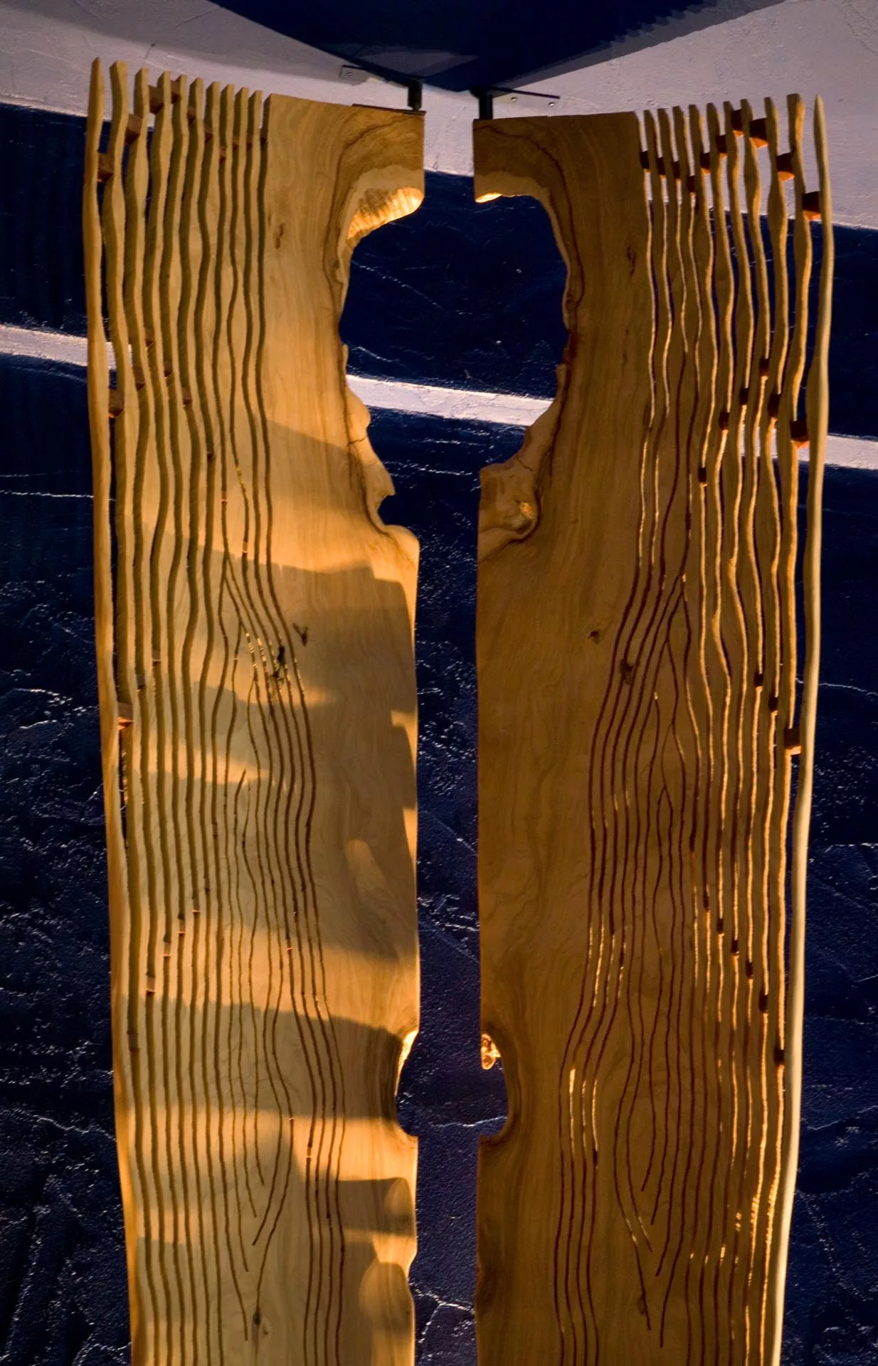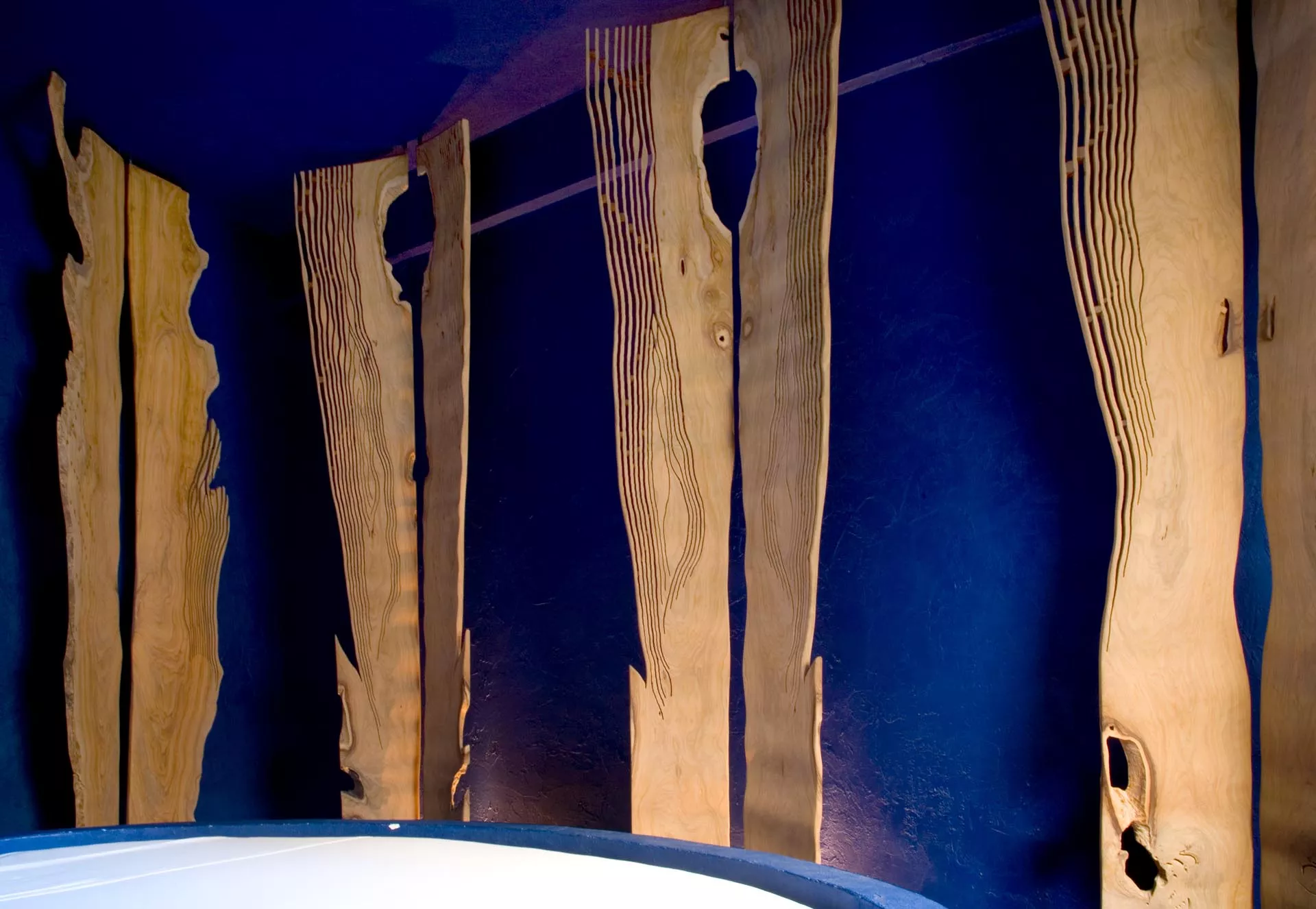 Per la realizzazione della stanza sono stati utilizzati due tronchi di ulivo che sono stati sezionati longitudinalmente ricavandone 12 sculture.