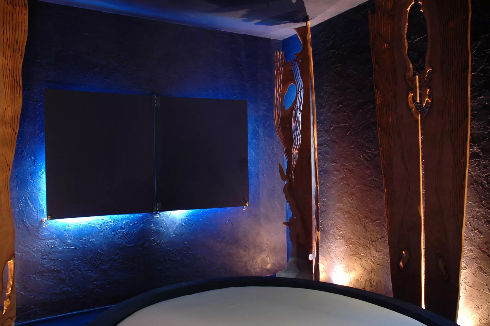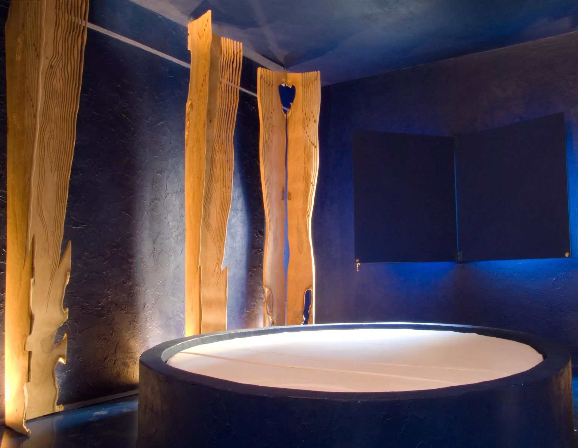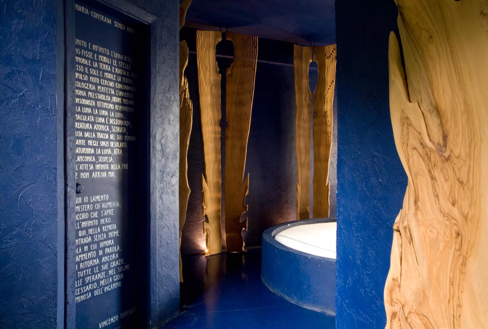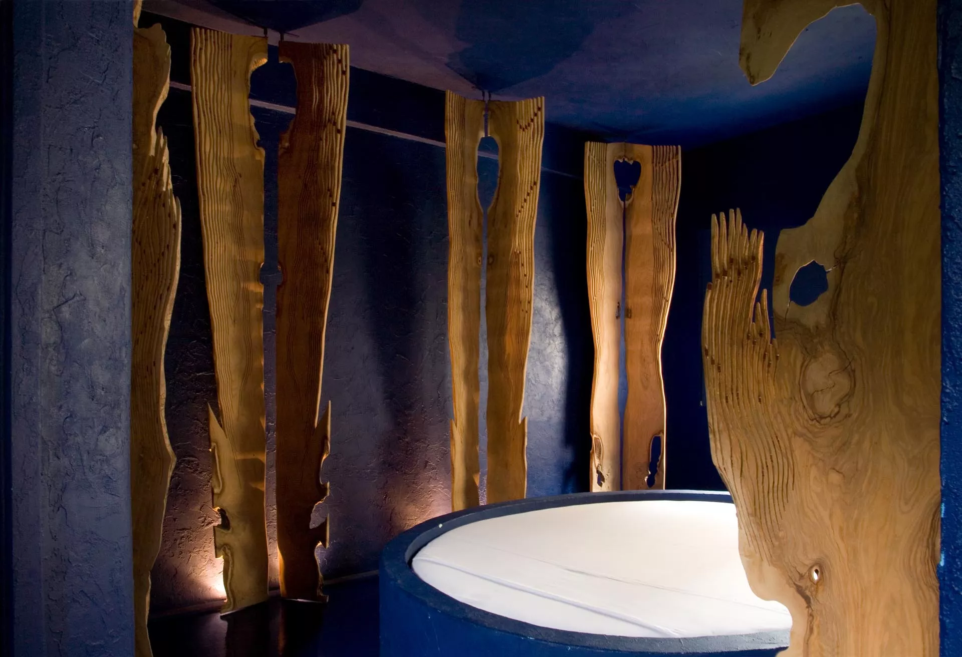 Per la realizzazione della stanza sono stati utilizzati due tronchi di ulivo che sono stati sezionati longitudinalmente ricavandone 12 sculture.