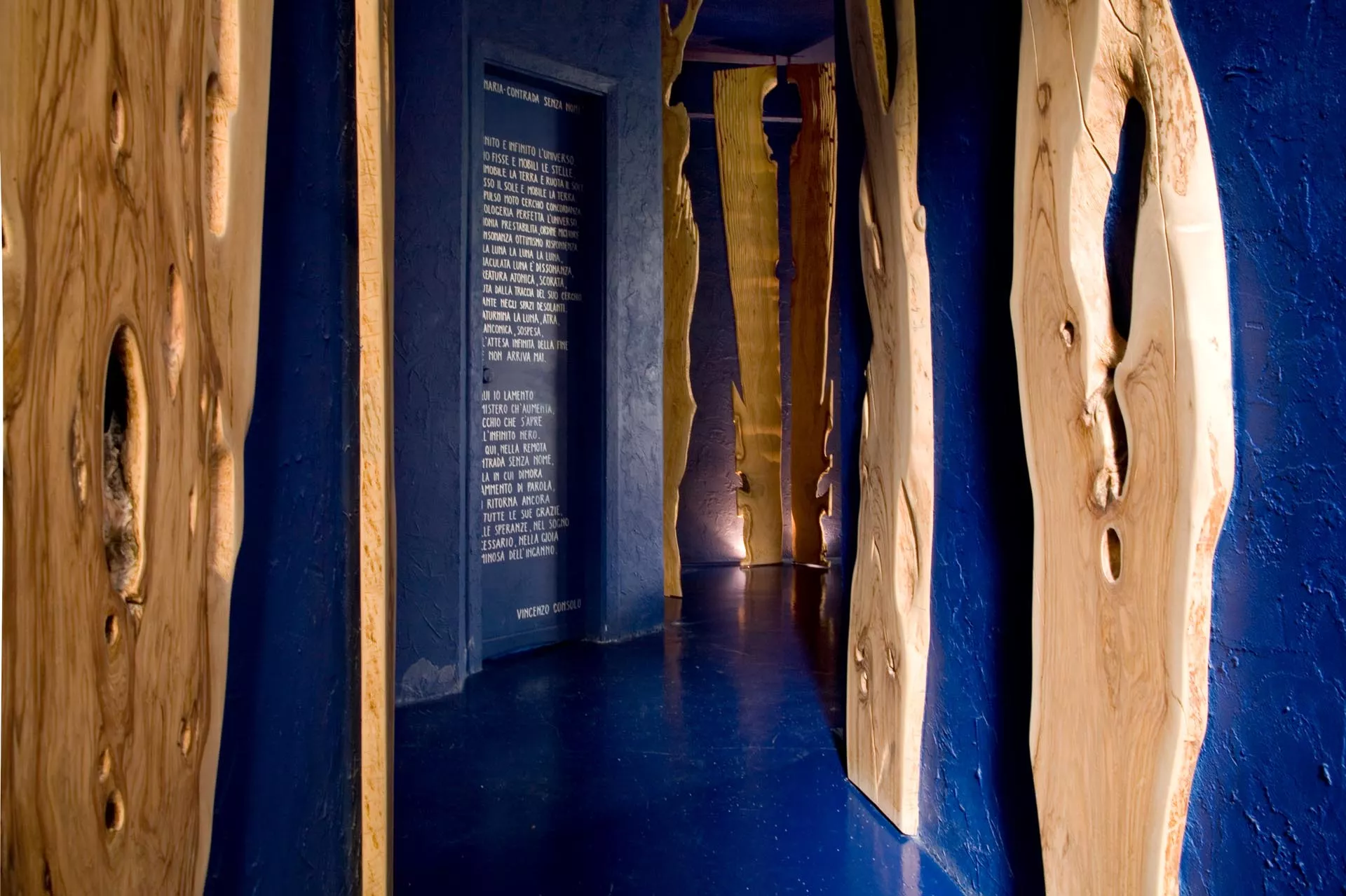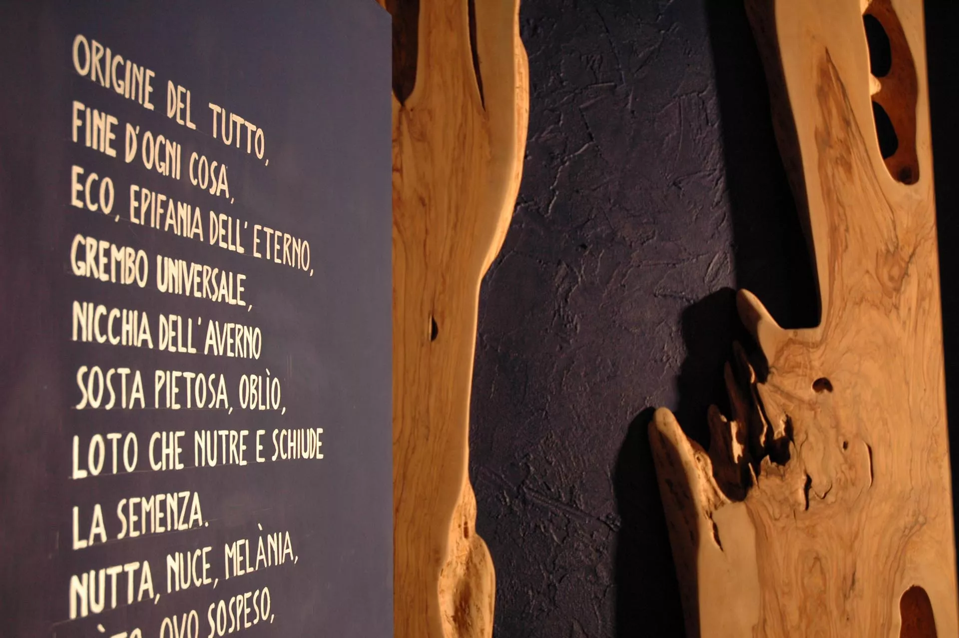 Lungo il perimetro della stanza, sono stati collocate sette “libri gigantici”, alti tre metri, le cui pagine sono sculture tagliate in sezioni molto sottili, e montate in modo da formare le pagine di un grande libro, che il visitatore è invitato a sfogliare e leggere lasciando che siano le venature, i buchi, le spaccature, i grovigli dei nodi a raccontare, creando dei continui rimandi tra l’ulivo simbolo di saggezza e il libro, veicolo di diffusione della Conoscenza.