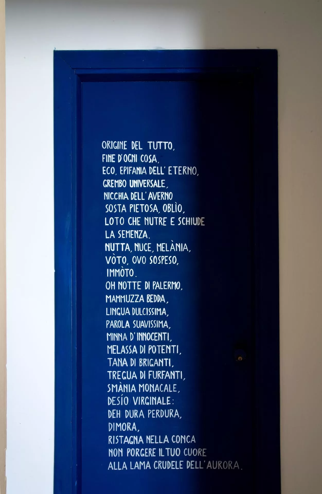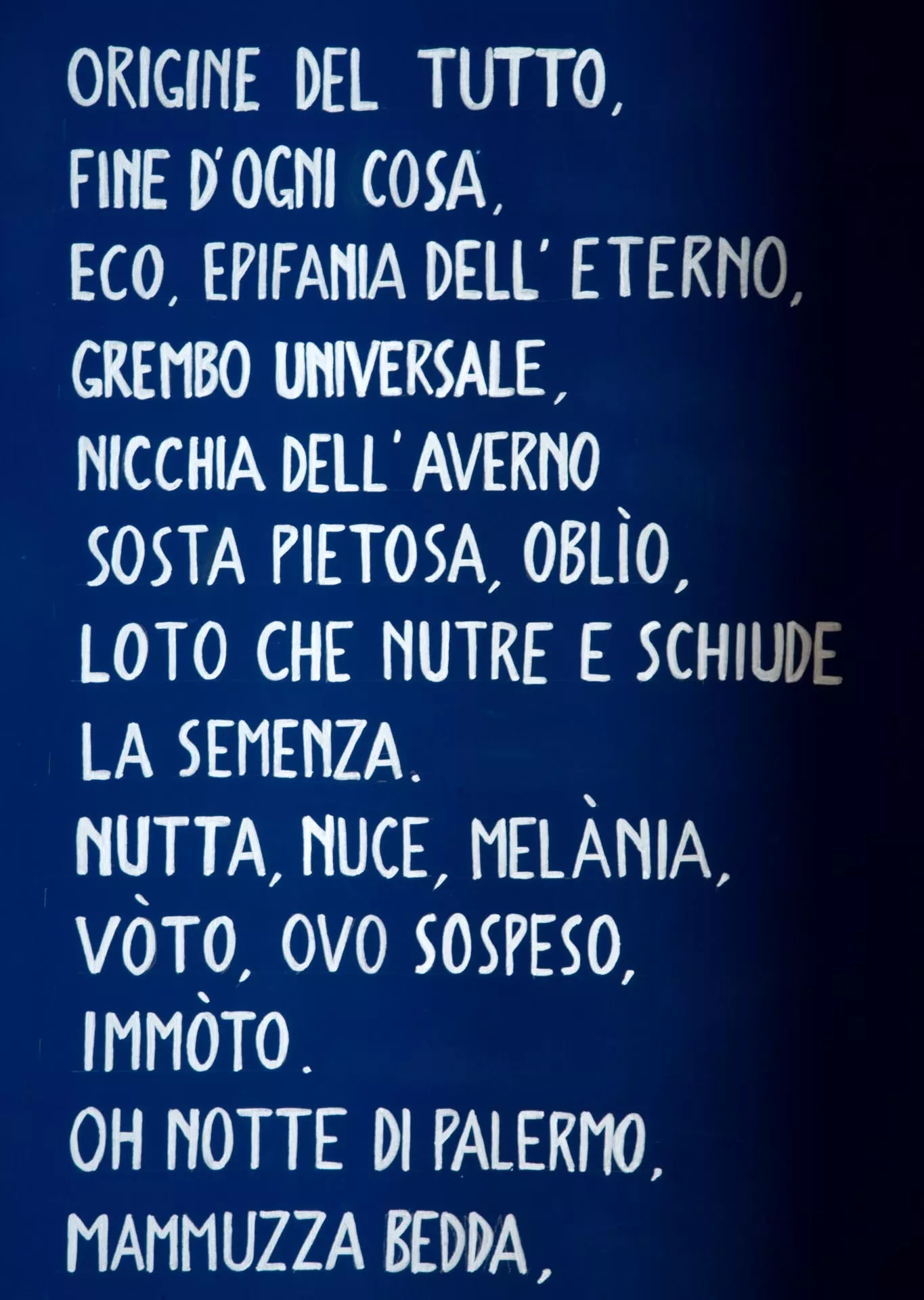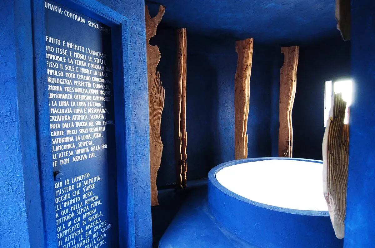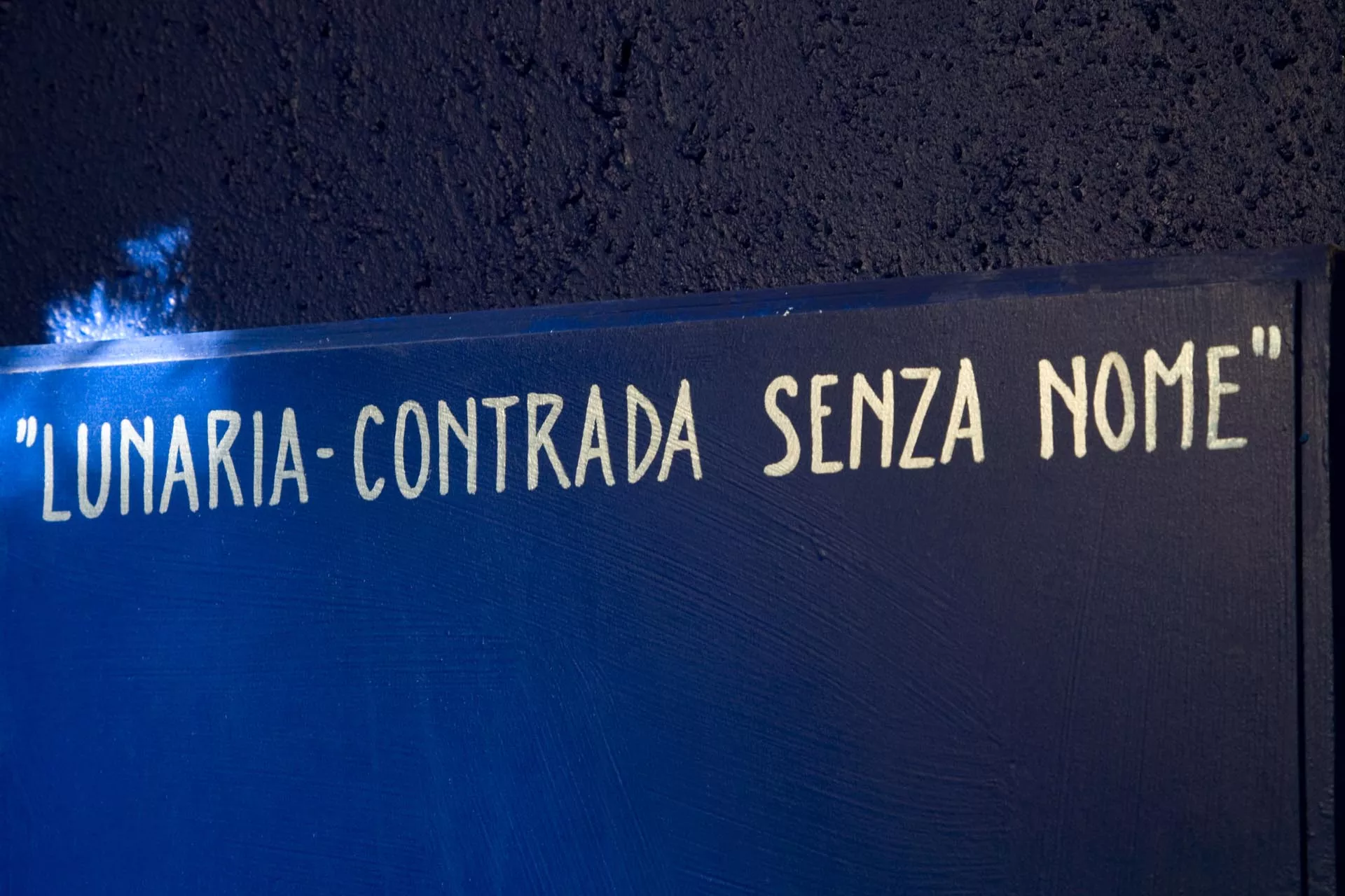 Le prime cinque, installate lungo le pareti del corridoio, sono il sentiero che conduce alla stanza, la “Contrada senza nome”, dove al centro, nella forma tonda del grande letto, troviamo la luna.
