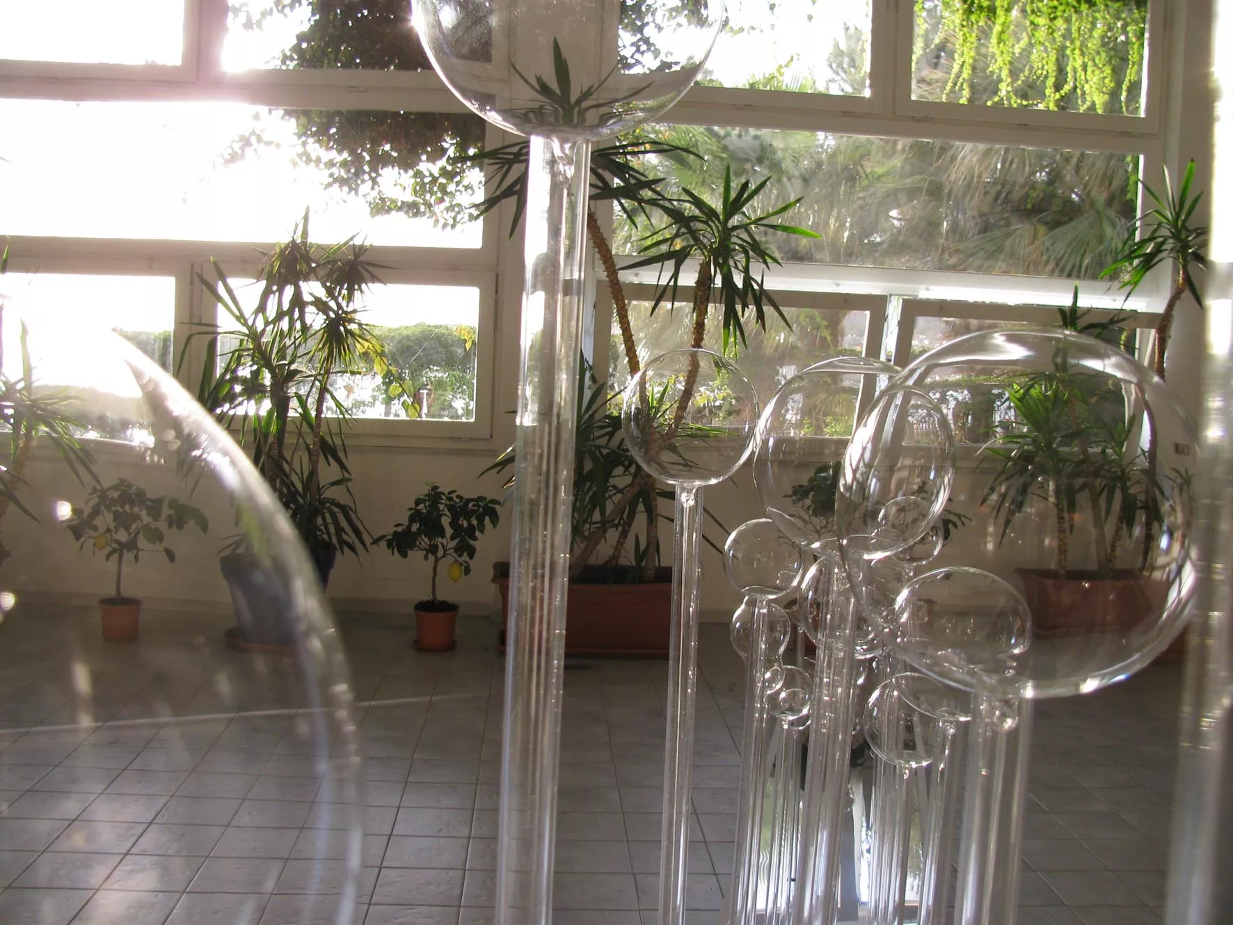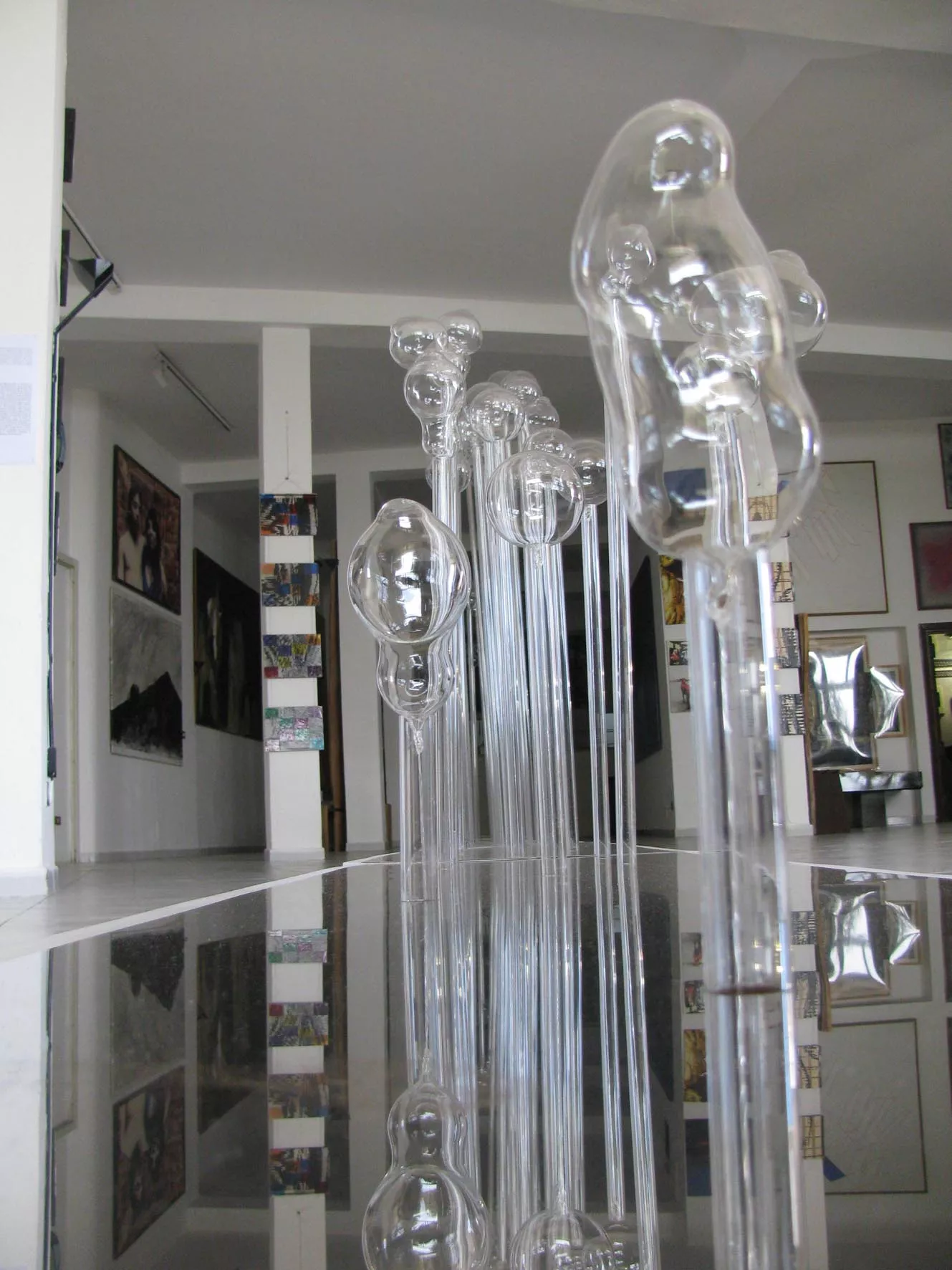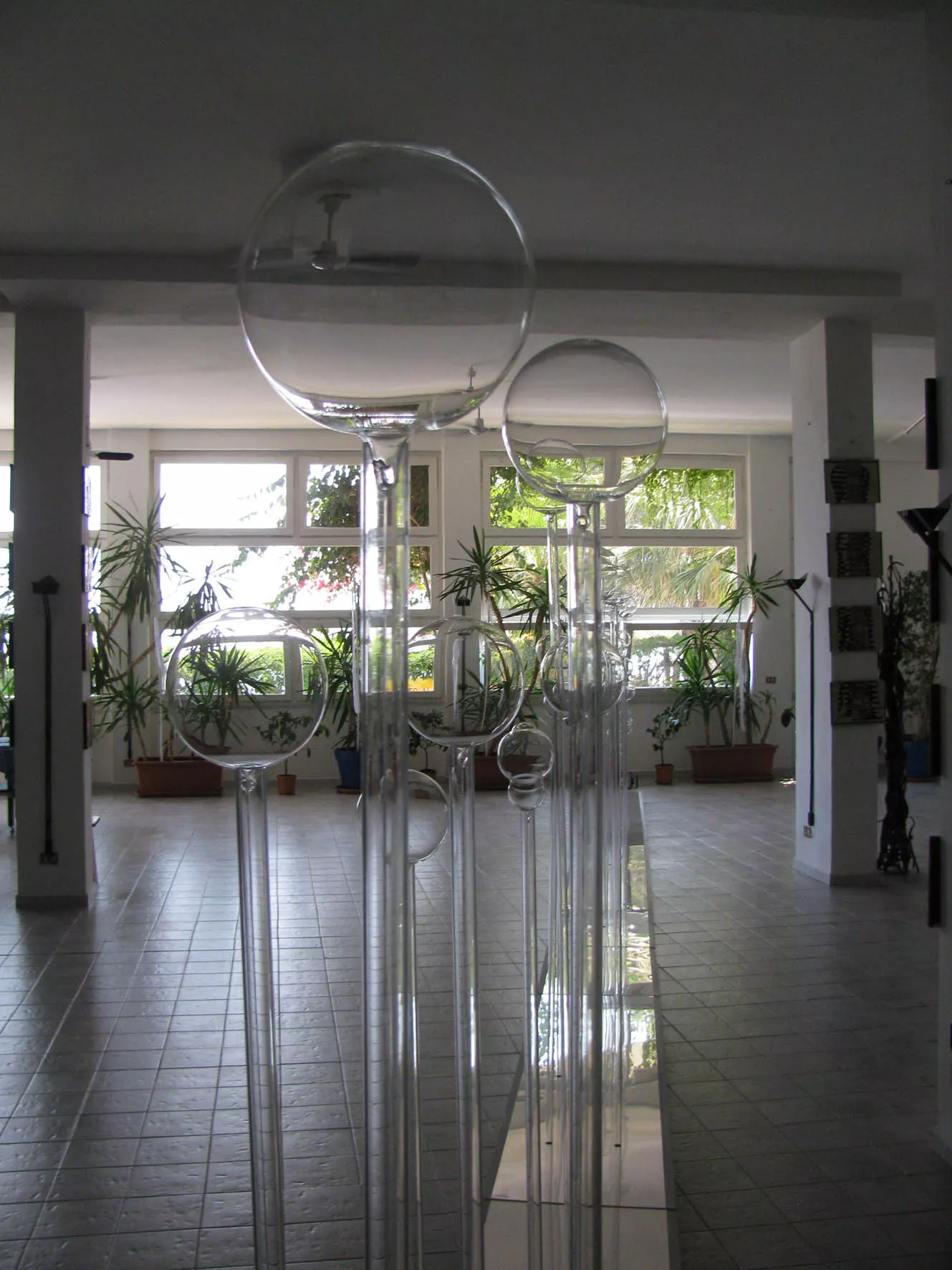 Collocati in doppio, come filari di alberi, su lastra specchiante di acciaio, i tubi di plexiglass, sormontati da globi di vetro soffiato che, da forme imperfette tendono a raggiungere una sfericità compiuta, accompagnano il visitatore, lungo il percorso reale e metaforico, verso un livello di consapevolezza, ma soprattutto di superamento dei conflitti scaturiti dalle contingenze quotidiane per accedere creativamente e poeticamente ad una condizione armonica.