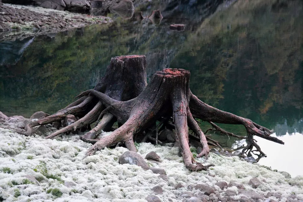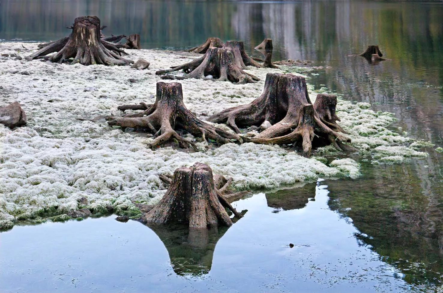 L’ambiente è un paesaggio-naturale, dove è vistosa la desertificazione incominciata molto tempo prima. Appaiono ceppi di piante tagliate o per meglio dire mozzate, rimasti a denunciare la trasformazione del luogo ad opera dell’uomo e il conseguente abbandono. La terra è scura, coperta in parte di alghe e d’acqua, e la luce, grande protagonista dosa i suoi riflessi a creare una dimensione onirica e magica. I ceppi hanno radici che sembrano zampe aggrappate al terreno o alla pietra dove sono rimaste appoggiate e allineate. Famiglie di ceppi-radici, o coppie di amanti abbracciati che sorprendentemente mantengono la vitalità della vita precedente, artigliate, e non paghe della loro nuova dimensione. La terra, roccia, acque riflettenti, alghe bianche sono lo sfondo di un mistero velato di ragnatele. Attraverso l’occhio fotografico che Pina Inferrera ha elaborato in questo luogo e sospeso per mostrarcelo, si può leggere l’attesa e sentire il rumore del silenzio. La solitudine non è sola. Un presagio.