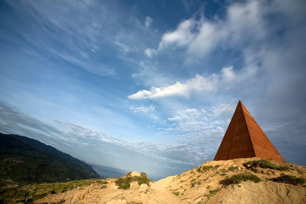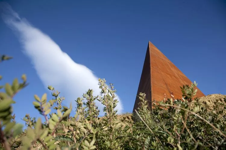 L’opera è un tetraedro titanico cavo realizzato in acciaio corten. Parzialmente sprofondata nel territorio roccioso, presenta una fessura lungo lo spigolo occidentale che rende ancora più preciso il suo collocarsi nella specificità del luogo e nello spazio cosmico.
