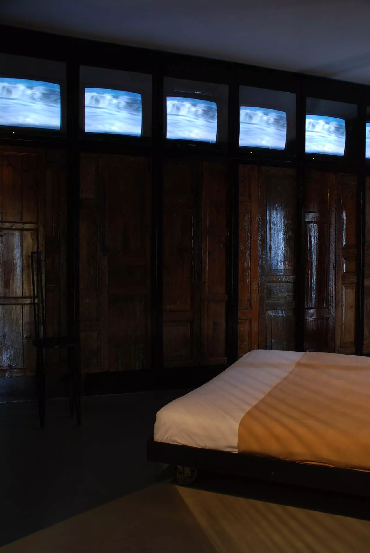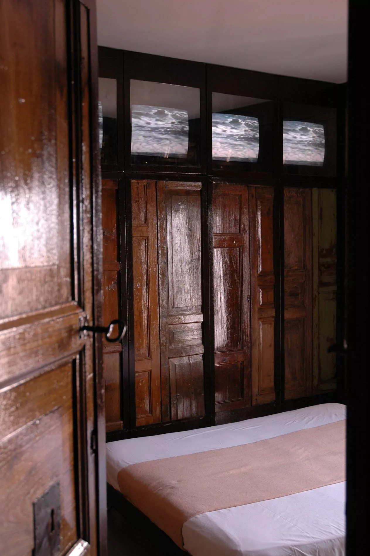 Sei schermi, posti in alto l’uno accanto all’altro su una stessa parete, come a creare una linea d’orizzonte, trasmettono ininterrottamente l’immagine dell’onda che si infrange sulla battigia, quella stessa che di lì a poco l’ospite potrà ammirare aprendo la porta giusta e godendo dello splendido panorama.