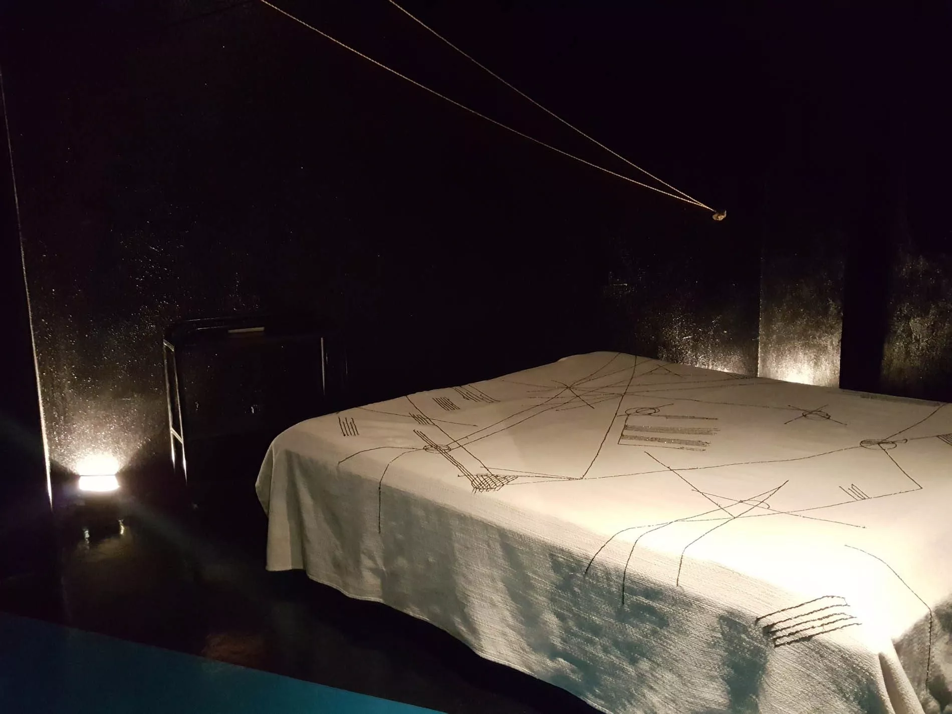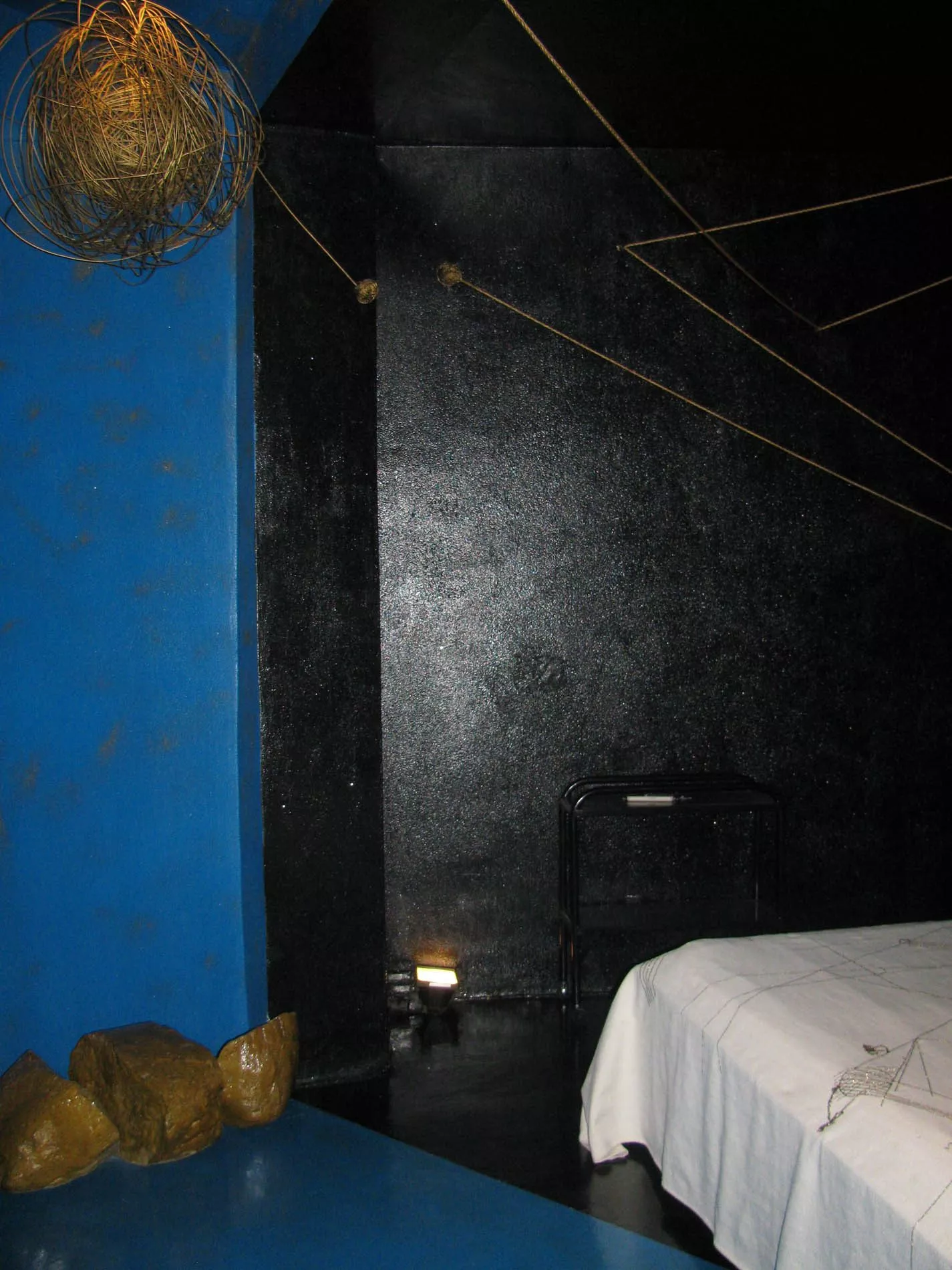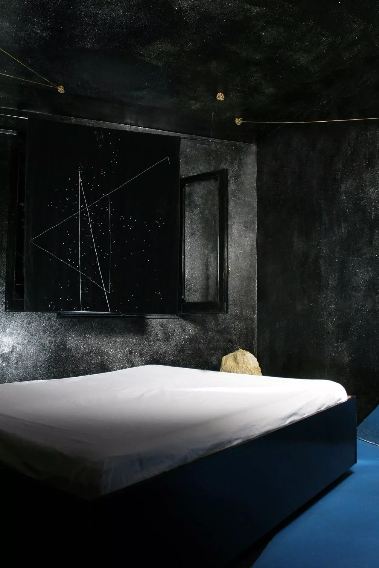 Emergendo da quel mare, il fruitore approda in un altro spazio che l’artista ha voluto dedicare alle due isole del Mediterraneo, la Sicilia e la Sardegna (quest’ultima sua terra natia), evocate rispettivamente dal blu e dal nero. Il fruitore, abbandonandosi sul letto-isola, può ammirare le costellazioni immaginarie che si specchiano nel copriletto e le stelle, piccoli elementi riflettenti. Nella profondità del blu-nero delle pareti spiccano sciami di stelle e un sole creato da un groviglio di fili metallici, che è luce ma anche principio, caos da cui è nata la materia.