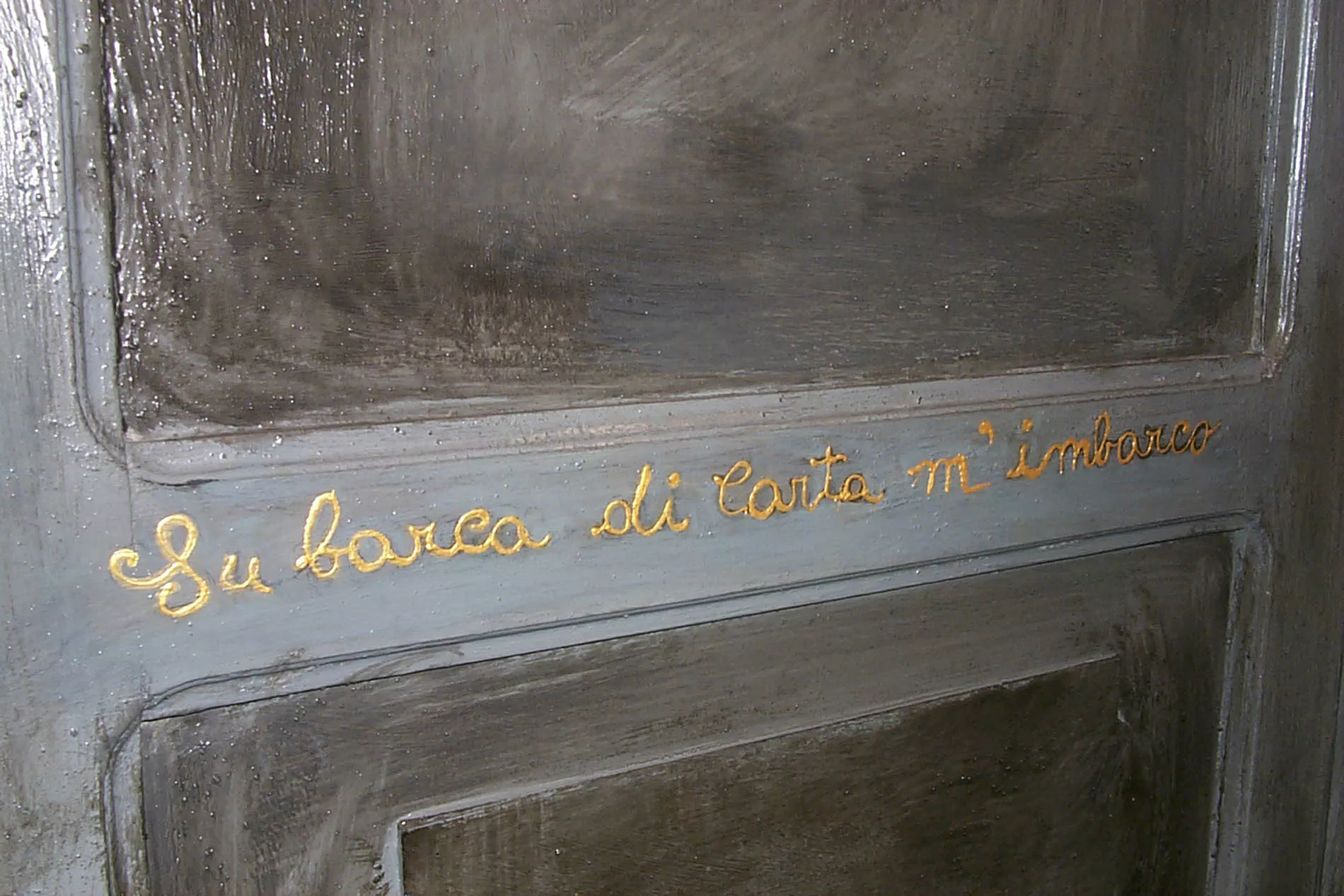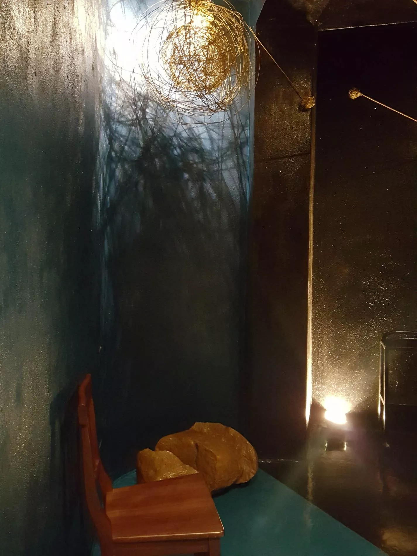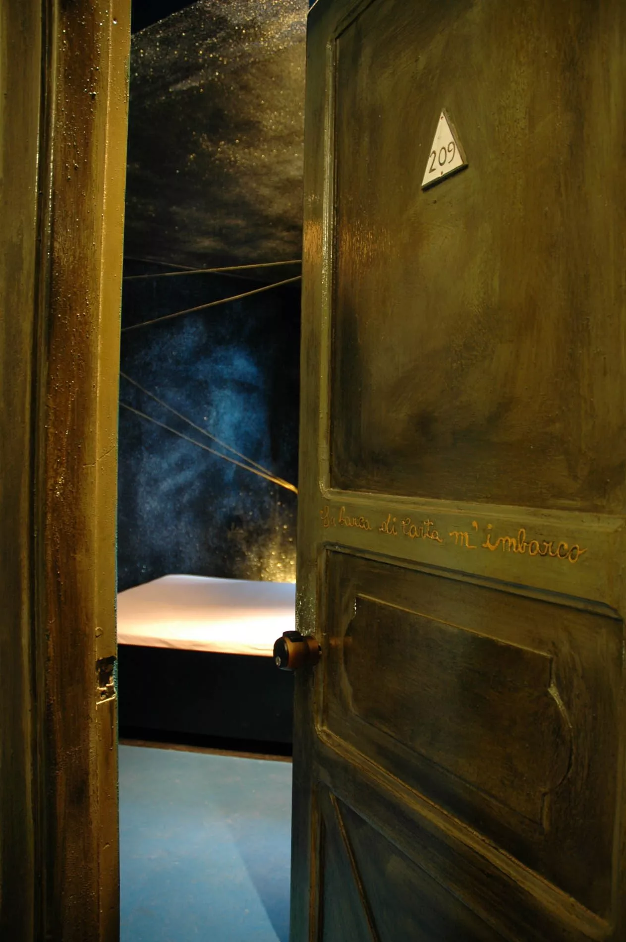 Emergendo da quel mare, il fruitore approda in un altro spazio che l’artista ha voluto dedicare alle due isole del Mediterraneo, la Sicilia e la Sardegna (quest’ultima sua terra natia), evocate rispettivamente dal blu e dal nero. Il fruitore, abbandonandosi sul letto-isola, può ammirare le costellazioni immaginarie che si specchiano nel copriletto e le stelle, piccoli elementi riflettenti. Nella profondità del blu-nero delle pareti spiccano sciami di stelle e un sole creato da un groviglio di fili metallici, che è luce ma anche principio, caos da cui è nata la materia.