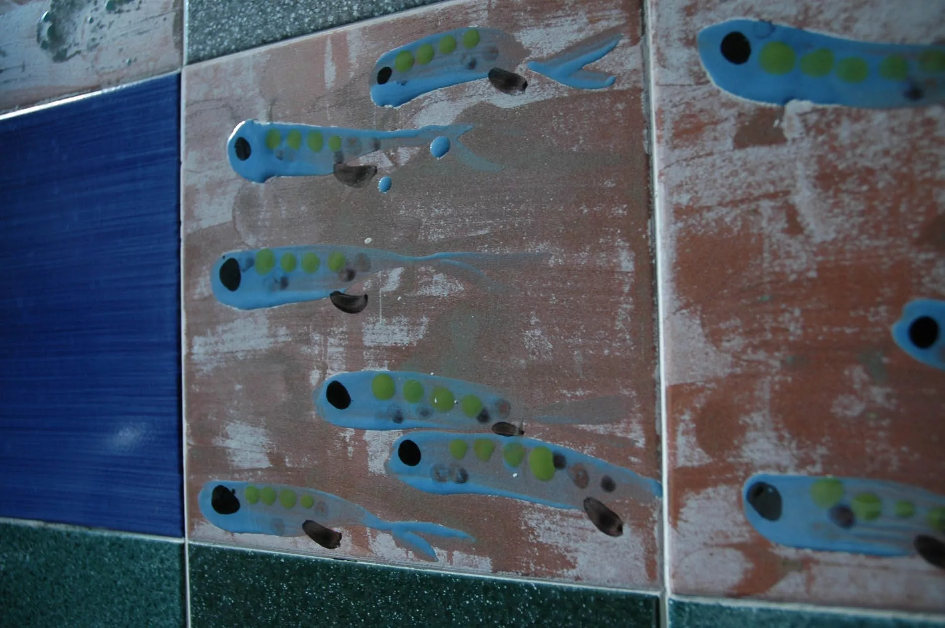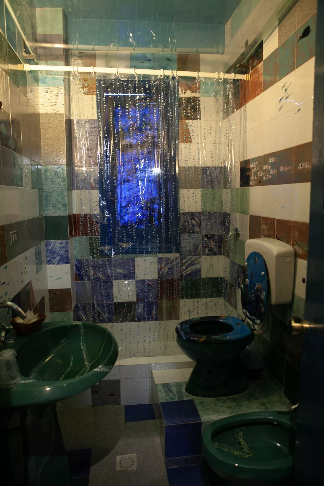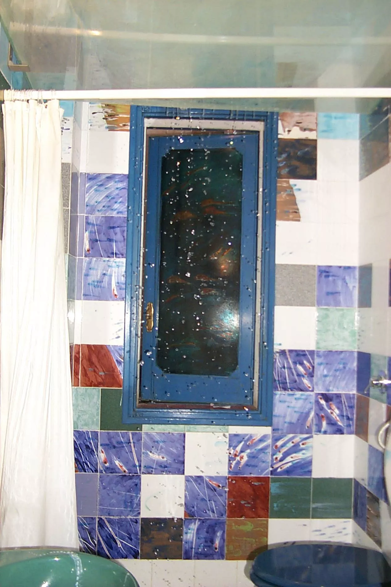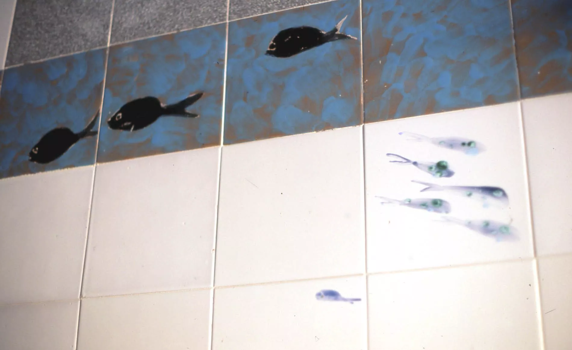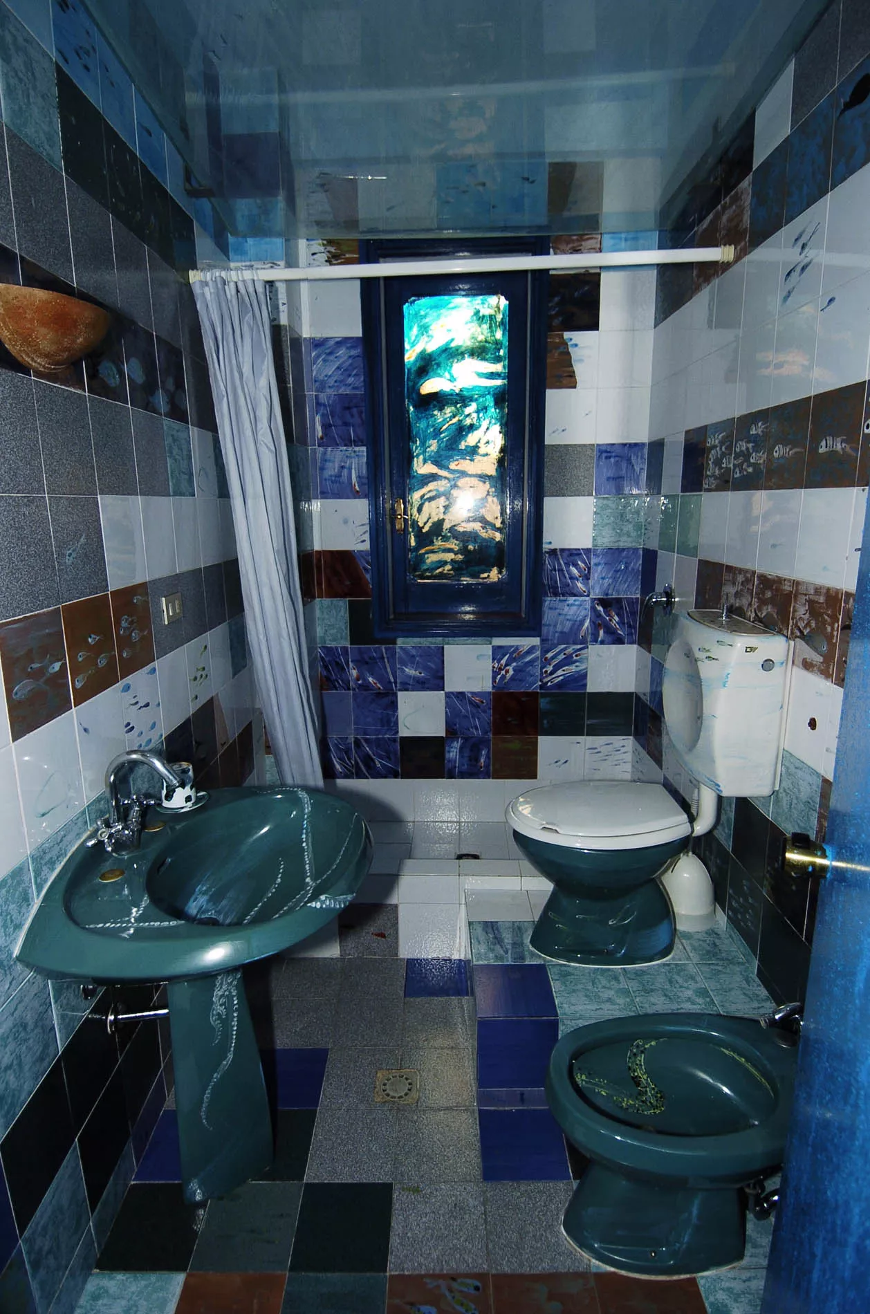 L’acqua è elemento predominante, liquido vitale dove si muovono pesci colorati, alghe e altri organismi marini che affollano le pareti del bagno, dove l’artista ha reinventato, decorandoli, il rivestimento e i sanitari in ceramica. Il soffitto è una lastra di vetro che evoca la superficie marina.
