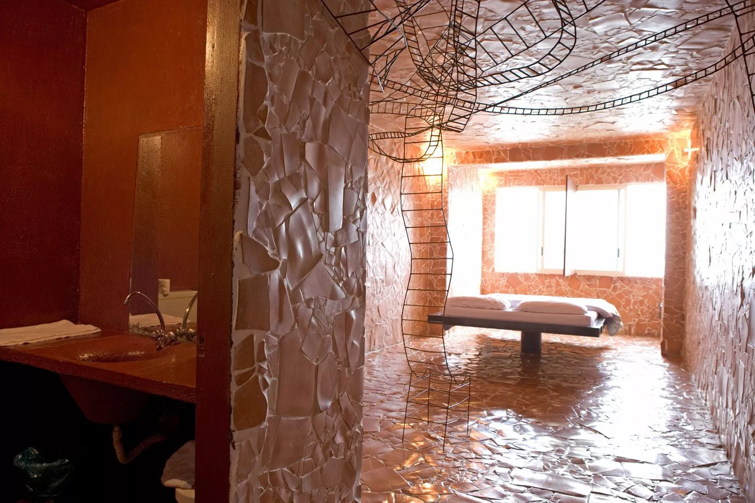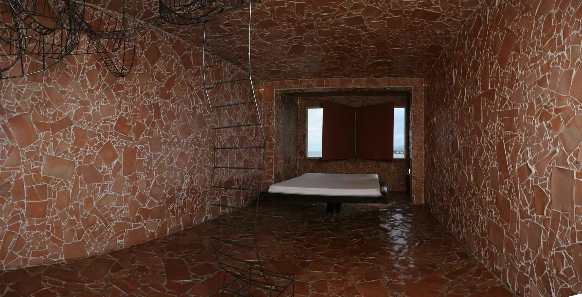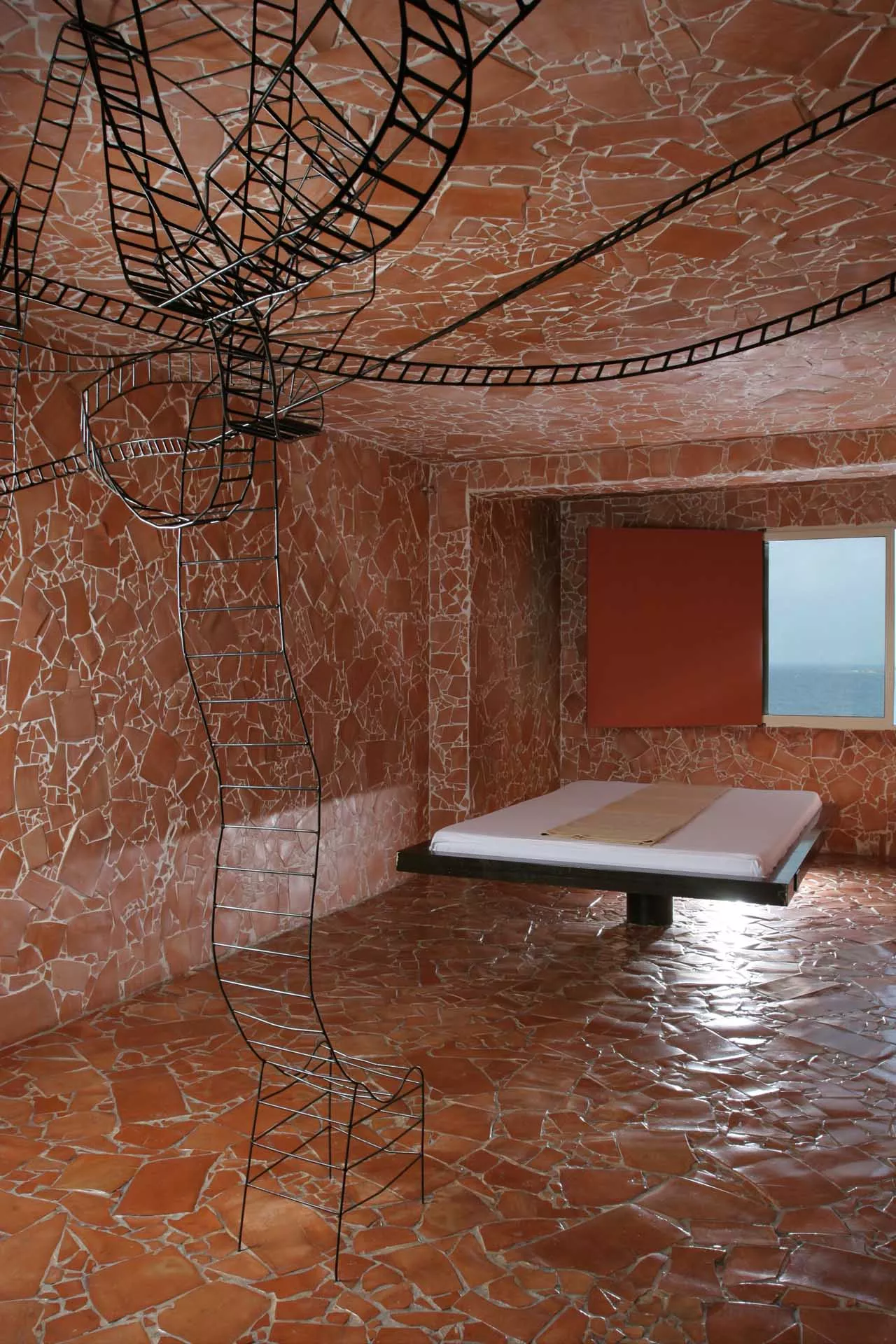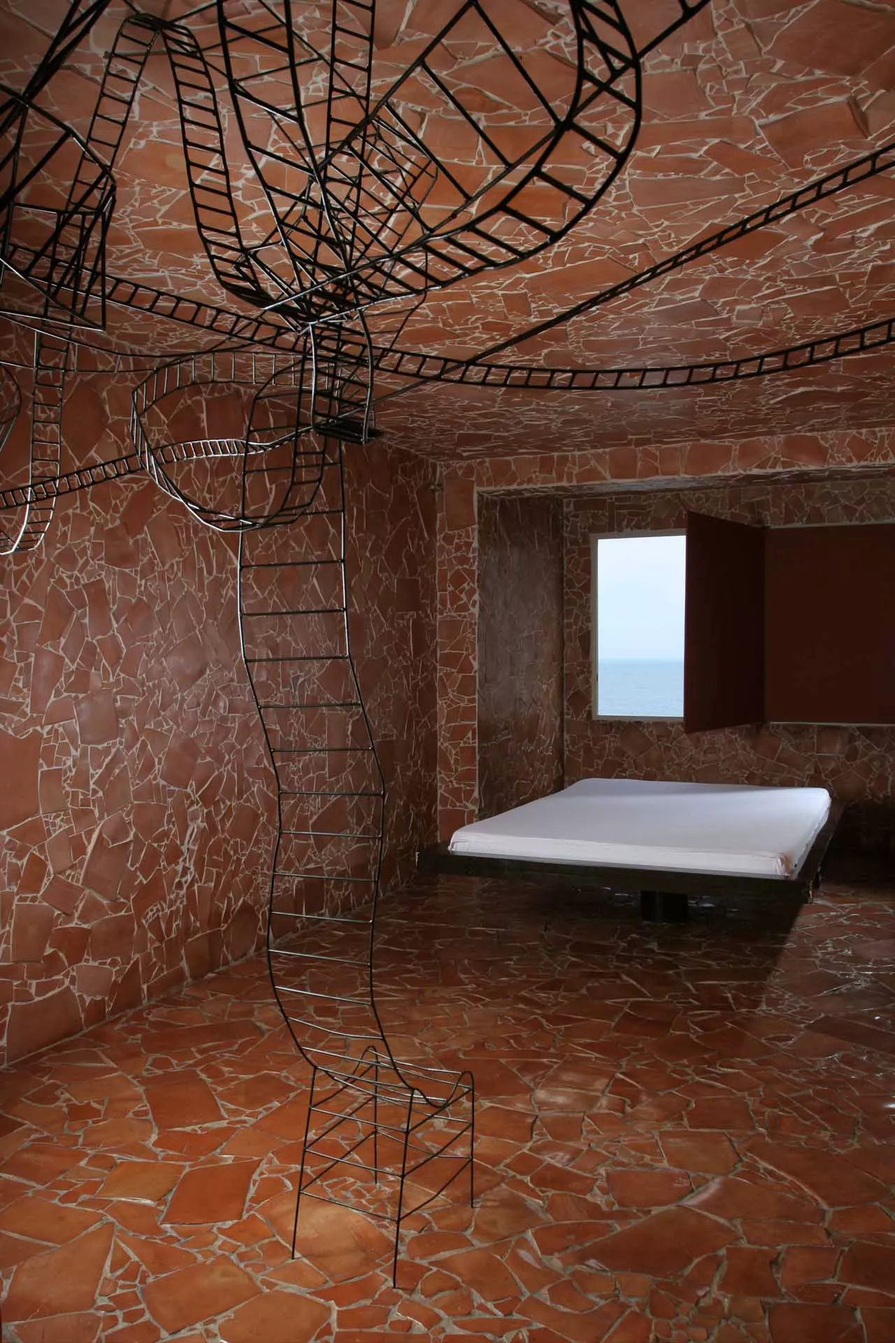 La sedia e il letto in sospensione costituiscono il nucleo dell’opera, oltre ad essere elementi funzionali e punti di vista privilegiati. La sedia-scultura in ferro, con la sua linea essenziale, che diviene torsione, è il mezzo attraverso il quale l’ospite libera la sua energia e il suo pensiero e diventa essere nello spazio e nel vuoto. Il suo aspetto di trama metallica si fonde con le linee spezzate della terracotta alle pareti formando un reticolo, un percorso labirintico che evoca i passaggi, le soste e le brusche accelerazioni dell’esistenza.