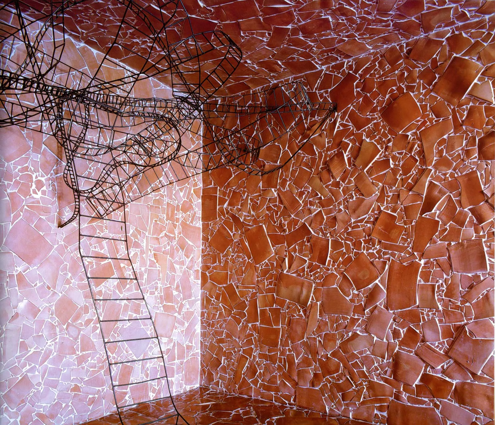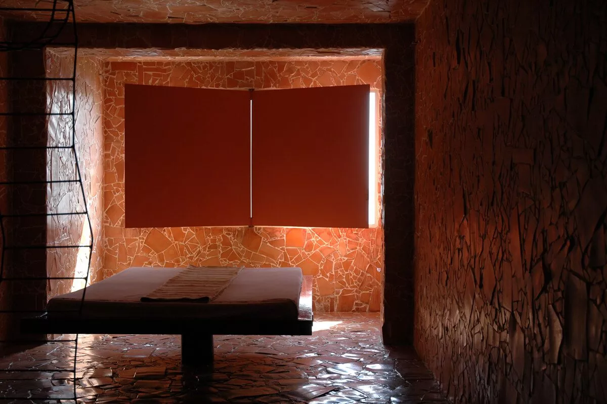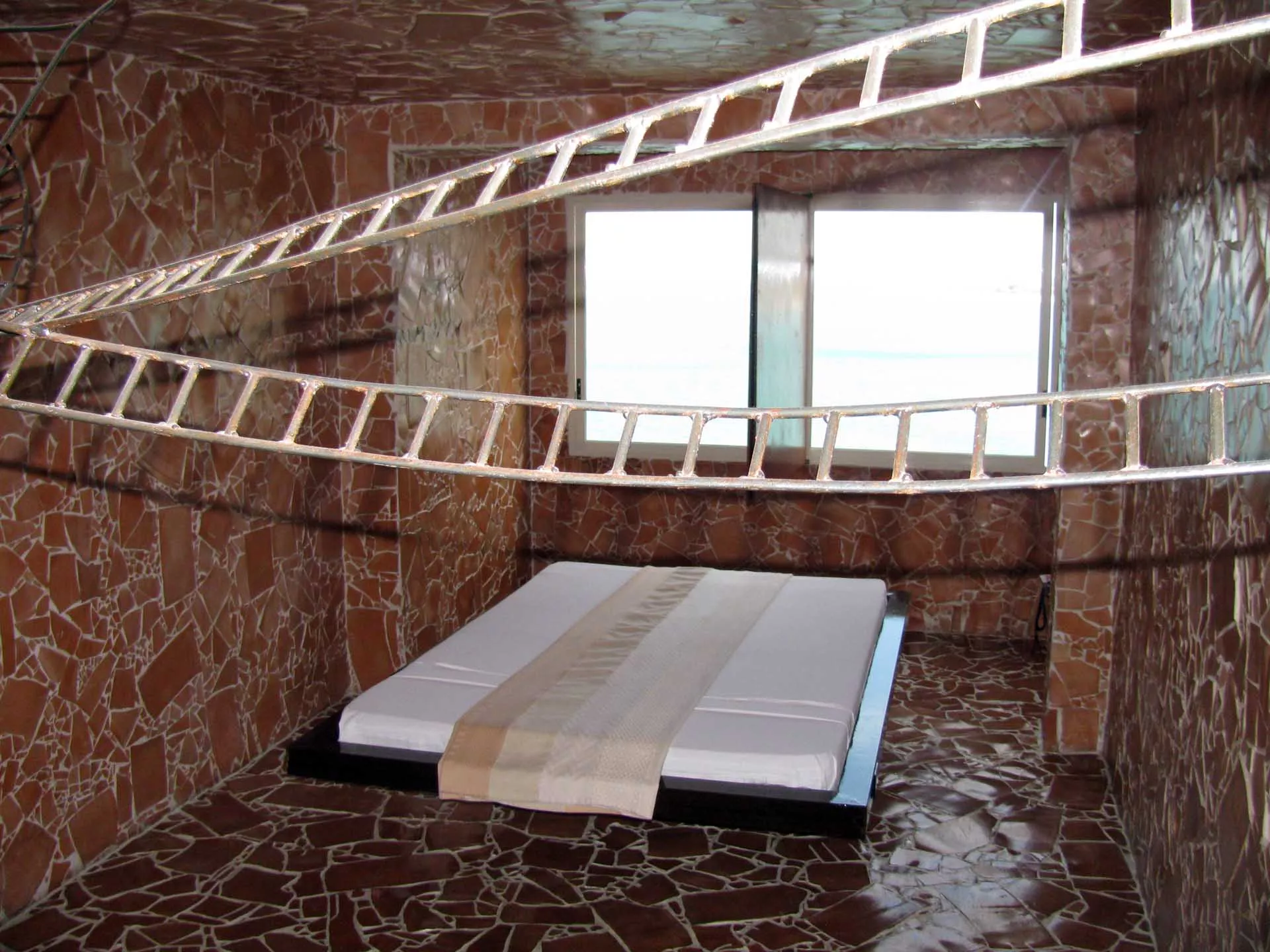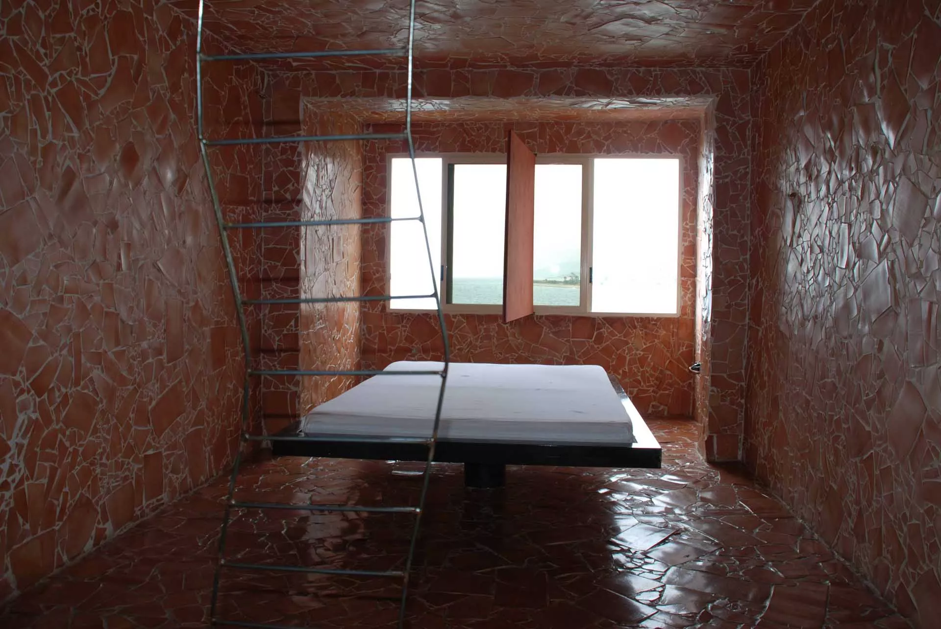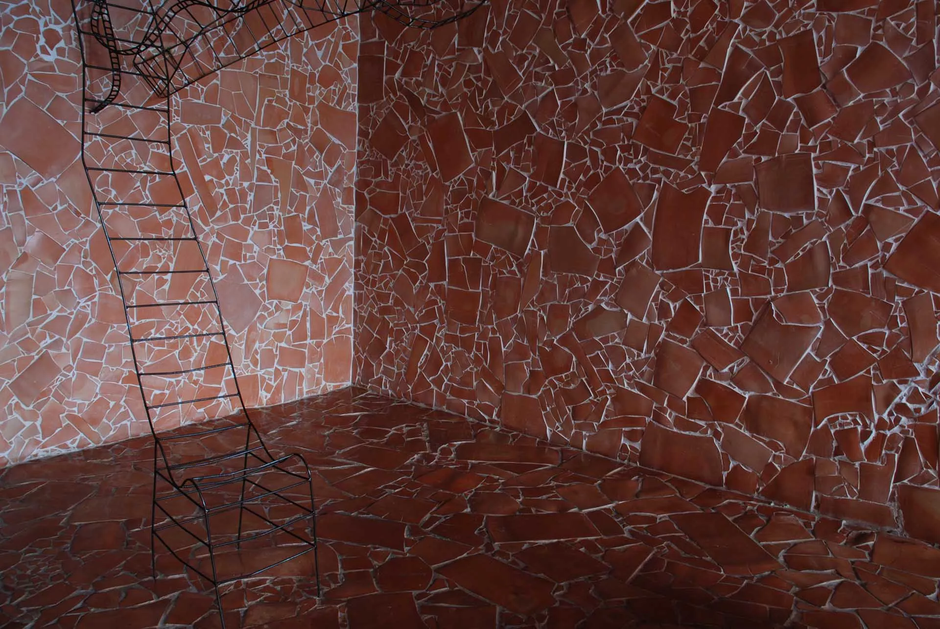 La sedia e il letto in sospensione costituiscono il nucleo dell’opera, oltre ad essere elementi funzionali e punti di vista privilegiati. La sedia-scultura in ferro, con la sua linea essenziale, che diviene torsione, è il mezzo attraverso il quale l’ospite libera la sua energia e il suo pensiero e diventa essere nello spazio e nel vuoto. Il suo aspetto di trama metallica si fonde con le linee spezzate della terracotta alle pareti formando un reticolo, un percorso labirintico che evoca i passaggi, le soste e le brusche accelerazioni dell’esistenza.