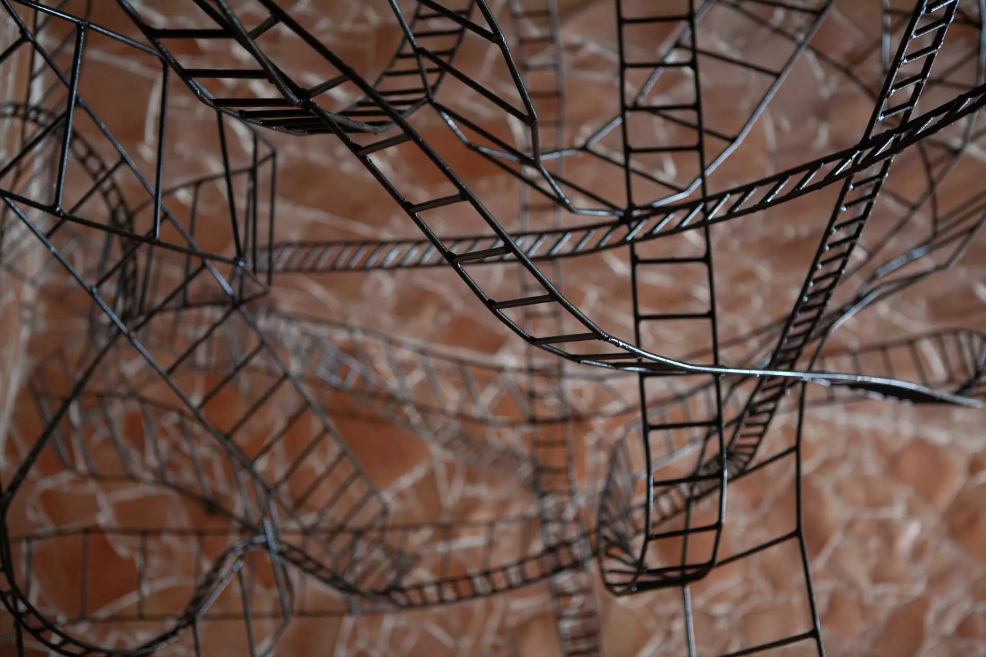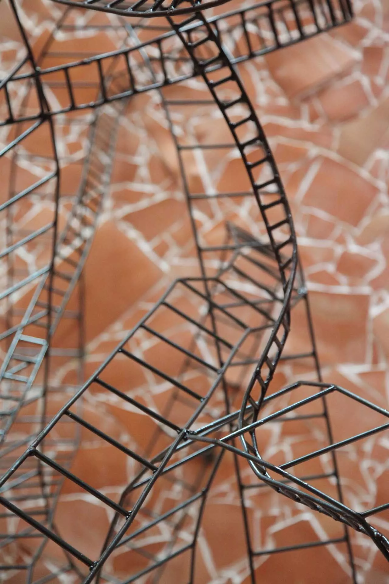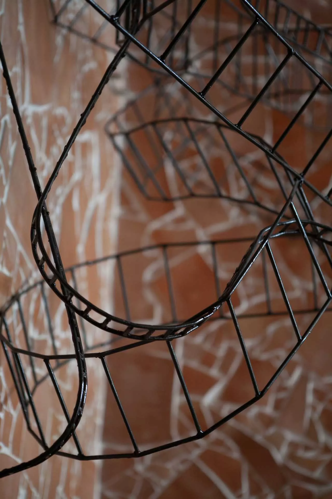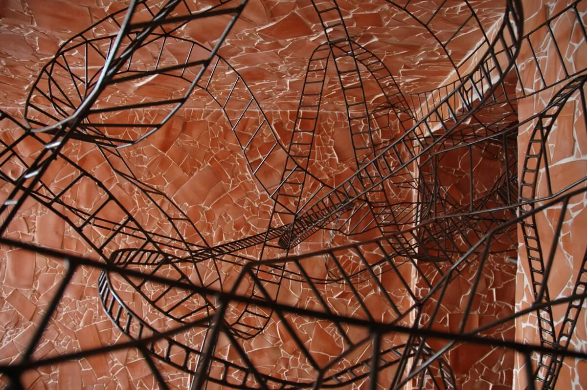 La sedia e il letto in sospensione costituiscono il nucleo dell’opera, oltre ad essere elementi funzionali e punti di vista privilegiati. La sedia-scultura in ferro, con la sua linea essenziale, che diviene torsione, è il mezzo attraverso il quale l’ospite libera la sua energia e il suo pensiero e diventa essere nello spazio e nel vuoto. Il suo aspetto di trama metallica si fonde con le linee spezzate della terracotta alle pareti formando un reticolo, un percorso labirintico che evoca i passaggi, le soste e le brusche accelerazioni dell’esistenza.