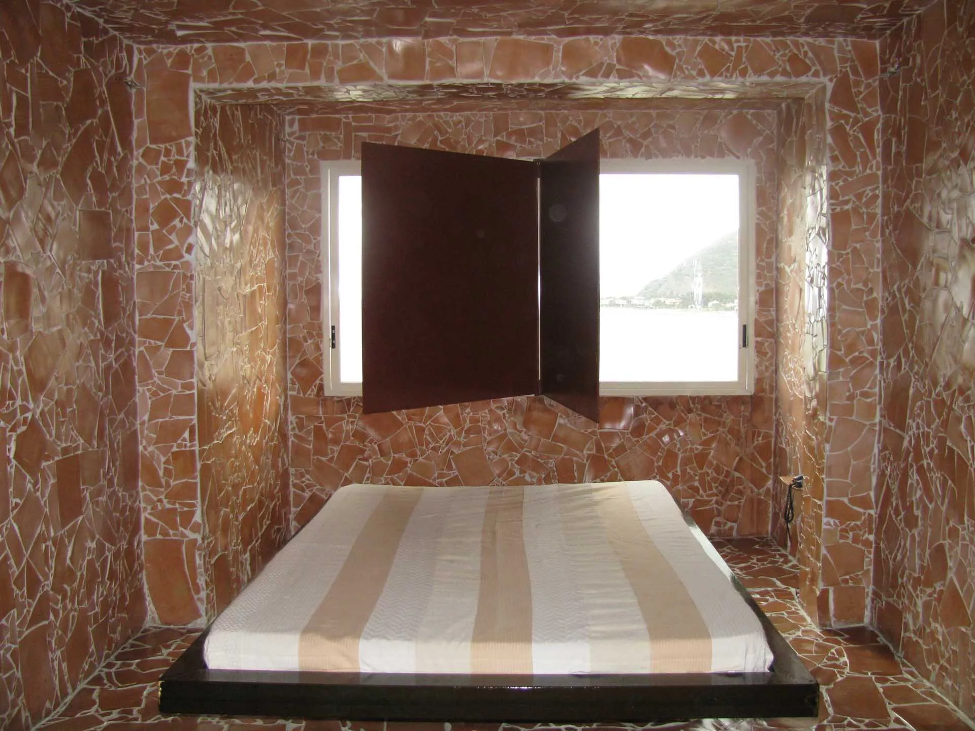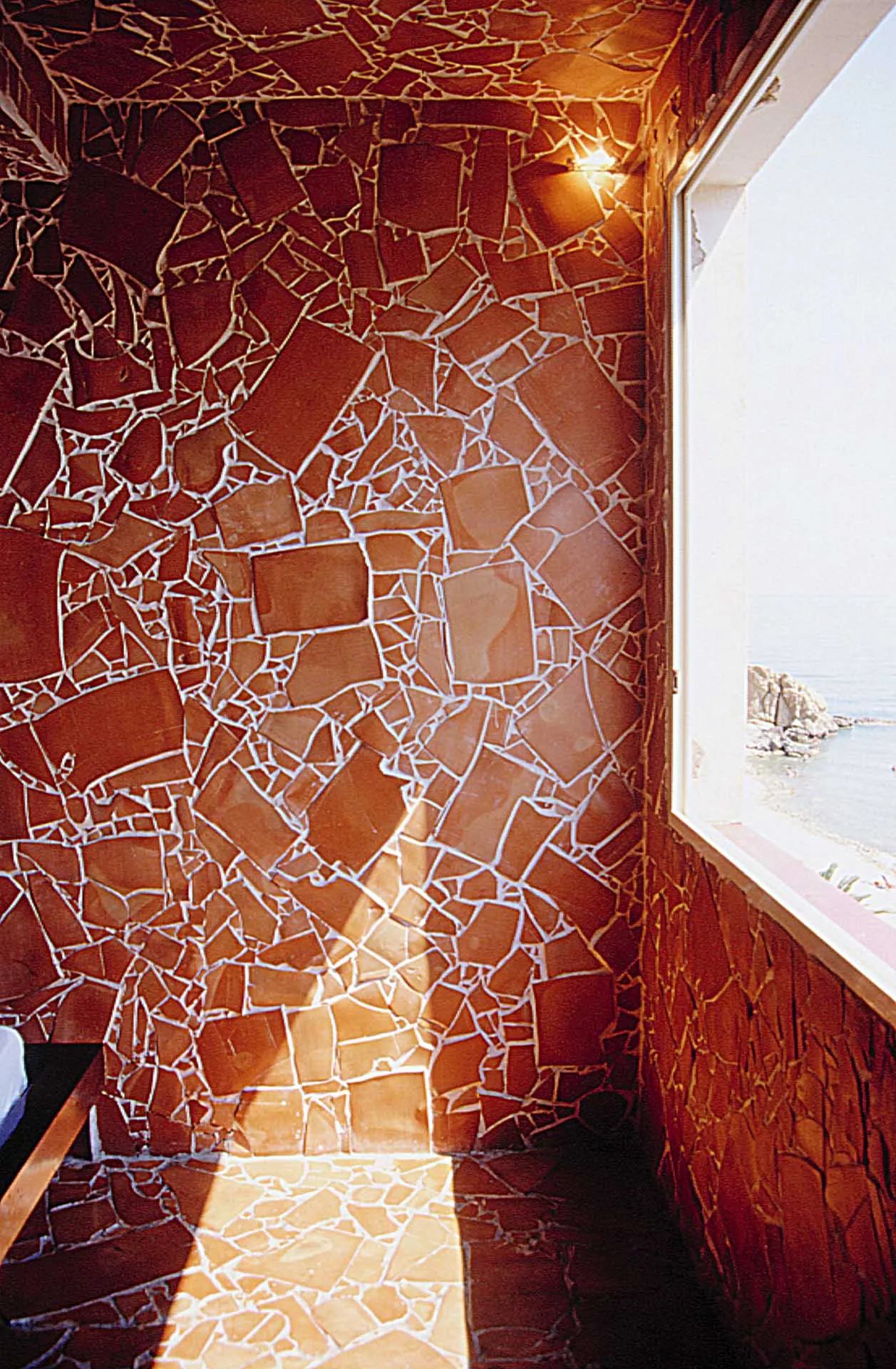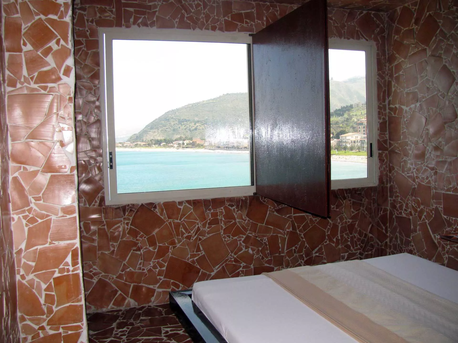 L’esplosione di frammenti di terracotta che investe le pareti della stanza firmata da Luigi Mainolfi si ricompone nella visione della grande vetrata rettangolare che, con l’effetto di uno sfondamento prospettico, apre lo sguardo e la mente al mare e al cielo, creando un affascinante incrocio tra i quattro elementi, aria, acqua, terra e fuoco.