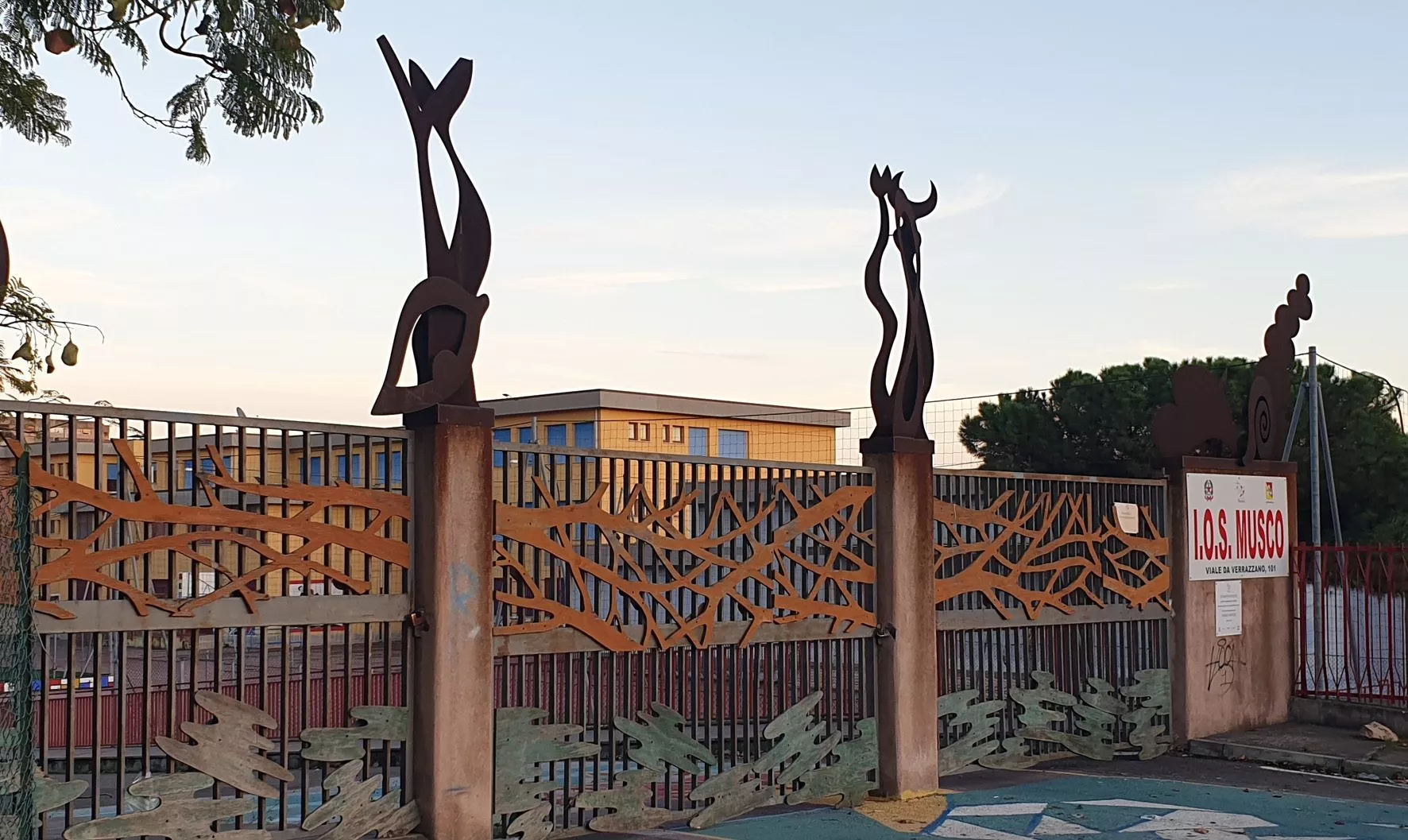 Un’opera condivisa con gli studenti che, seguiti dall’artista, hanno realizzato, nel laboratorio di ceramica della scuola, dei manufatti in terracotta posti, successivamente, come base dell’opera e sui marciapiedi laterali di accesso alla scuola.