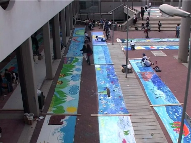 Un chilometro di tela, già preparata per essere dipinta e stesa in un percorso che si è snodato nei sottopassaggi dei condomini del quartiere Librino di Catania, è stato il supporto, su cui gli studenti hanno espresso liberamente la propria arte sul tema dell’importanza dell’acqua, attraverso segni e colori.
